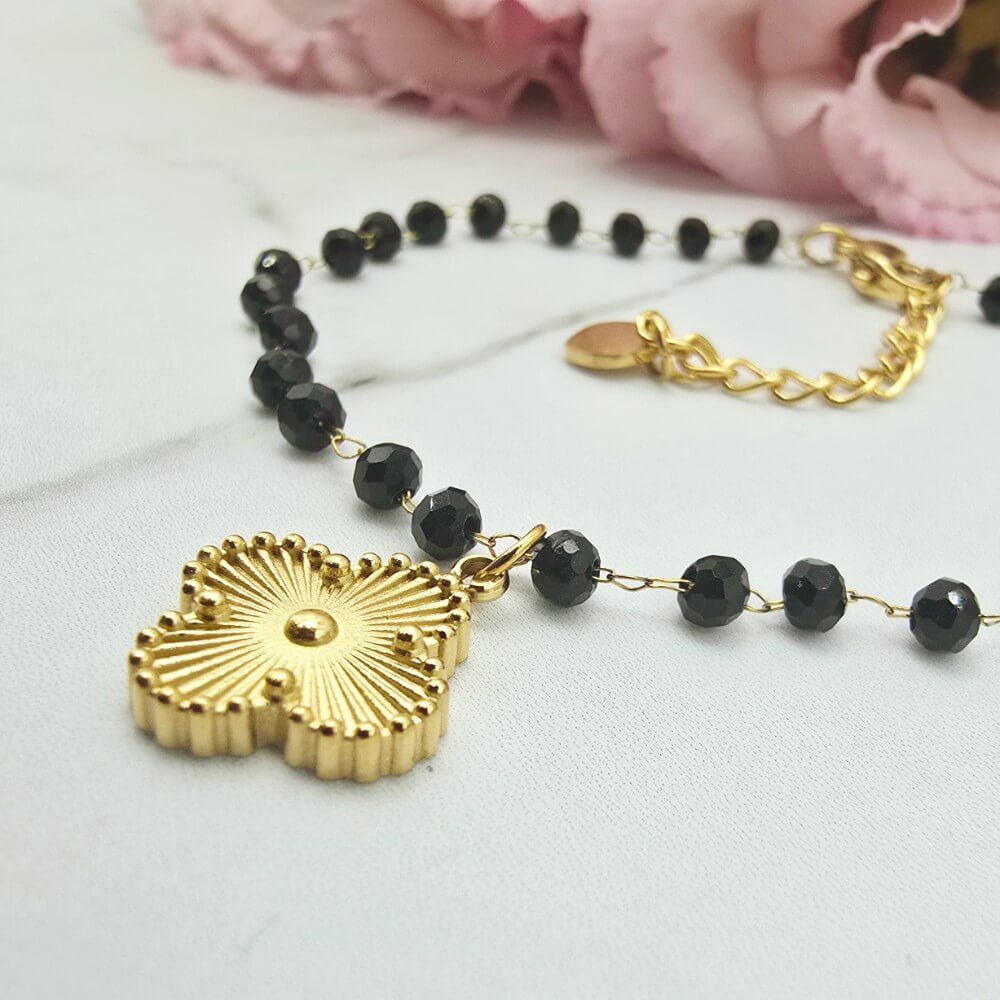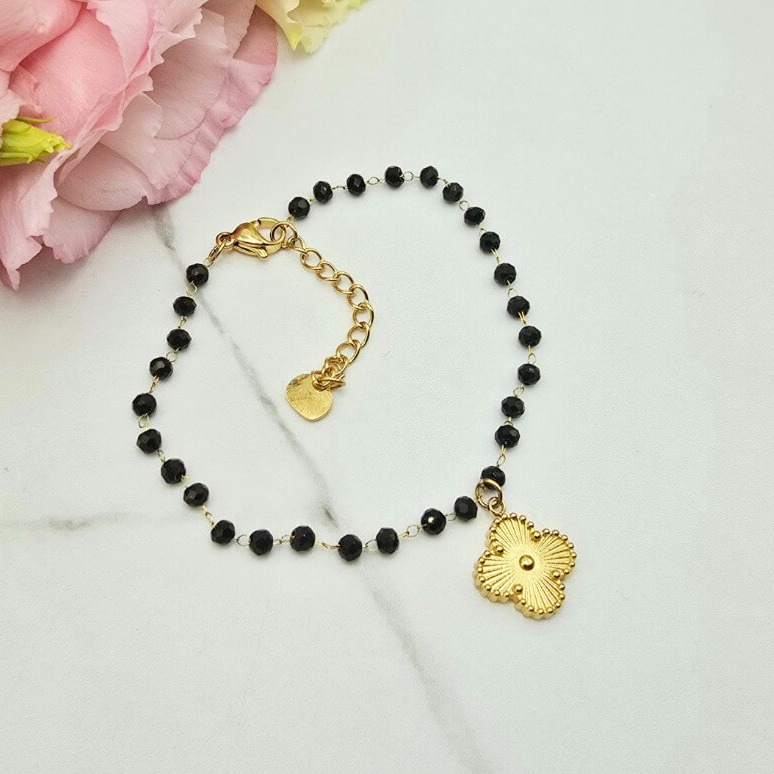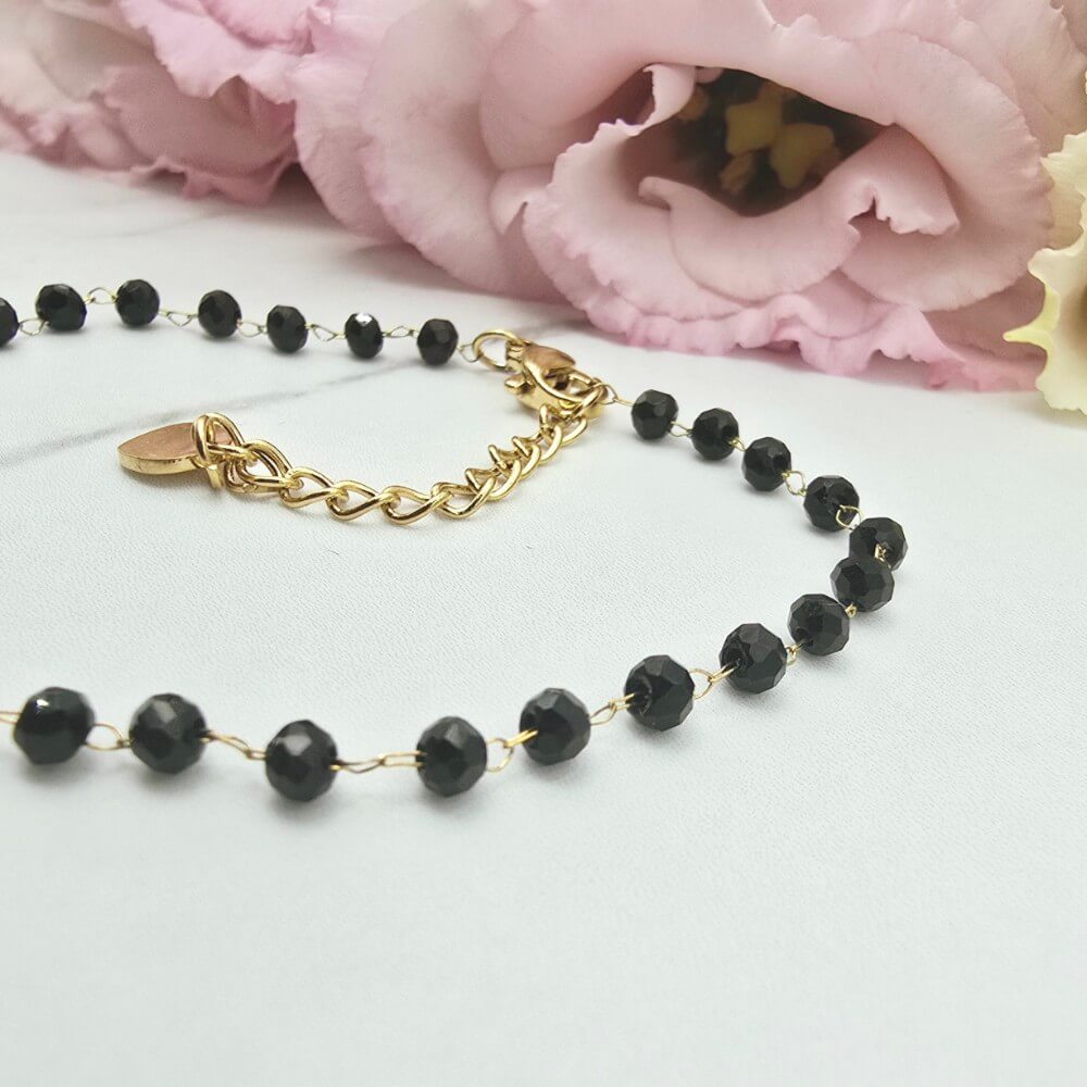 Bransoletka z czarnymi szlifowanymi kryształkami o wielkości ok 0,4 cm. Przywieszka wykonana ze Stali Chirurgicznej/Stali Nierdzewnej.