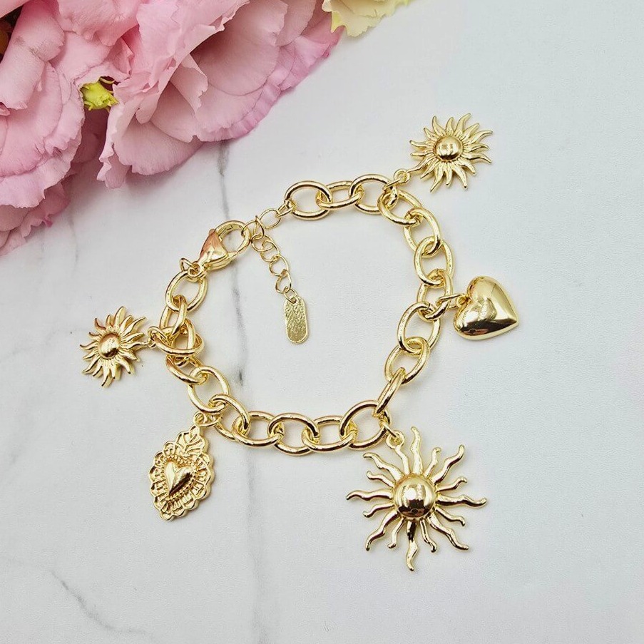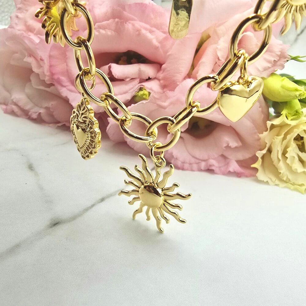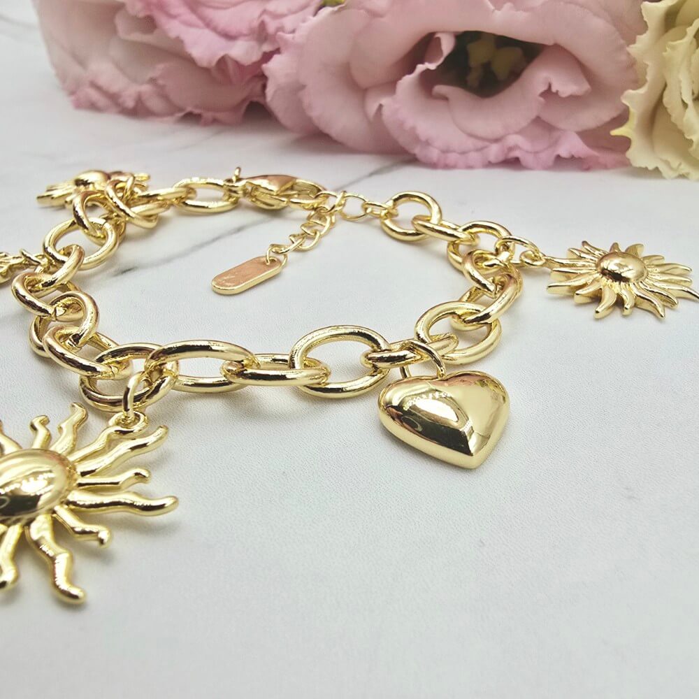 Bardzo ciekawy i efektowny model. Bransoletka z kategorii PREMIUM StaloweLOVE - duże ogniwka. Przywieszki trzy słońca i dwa serca zdobione. Bardzo efektowna bransoletka. Jasny odcień złota.