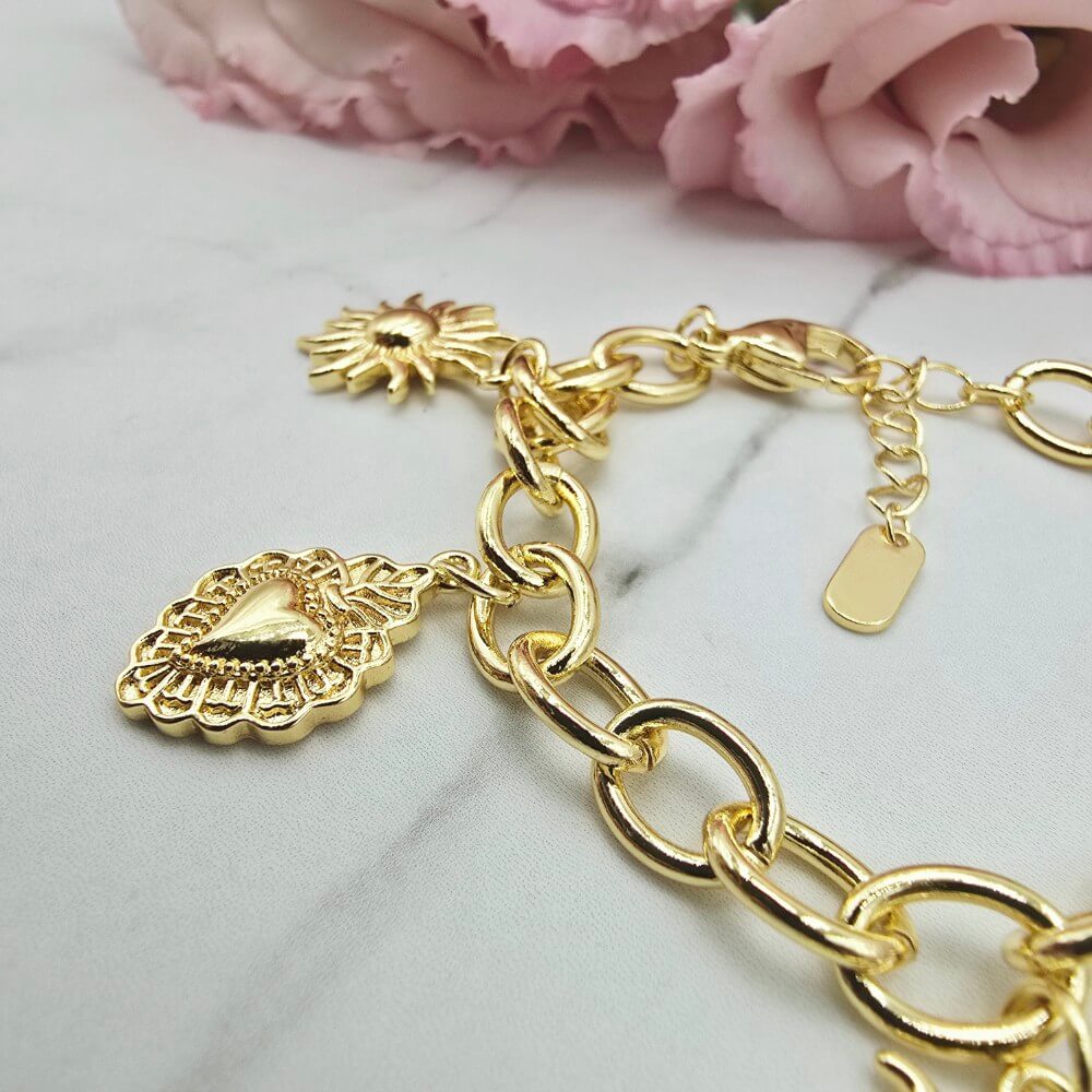 Wymiary: długość całkowita bransoletki 21 cm. Możliwość skrócenia na zapięciu do -3 cm ale także można zapiąć na każdym ogniwku łańcuszka. Przywieszka słońca ok. 2 i 1,5 cm a serca ok. 1 cm.