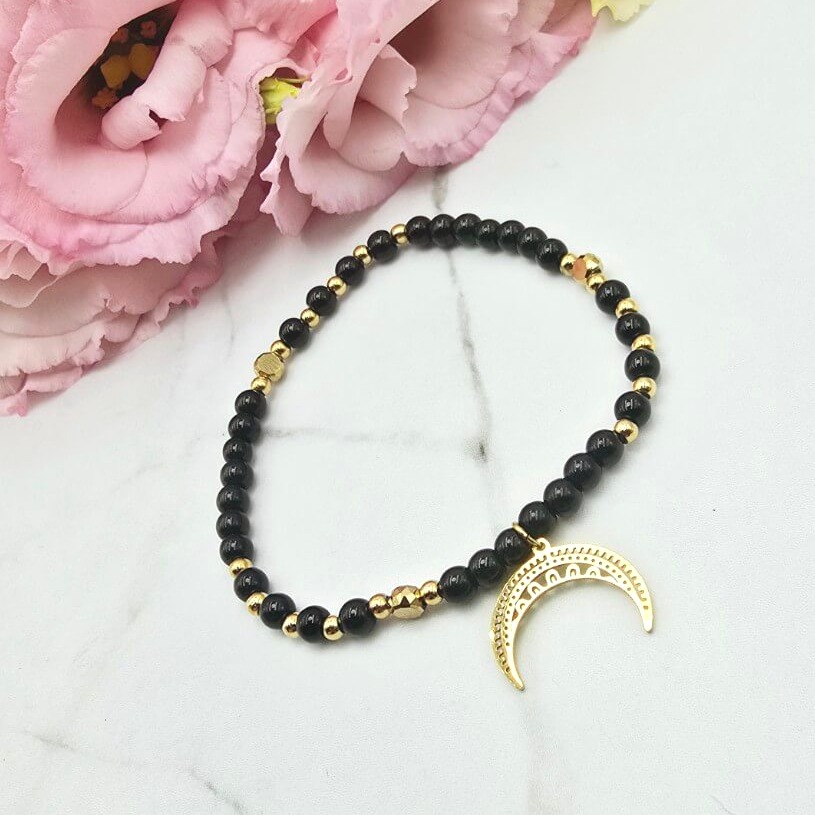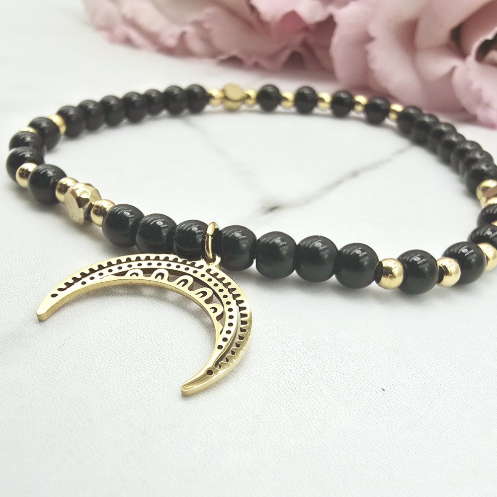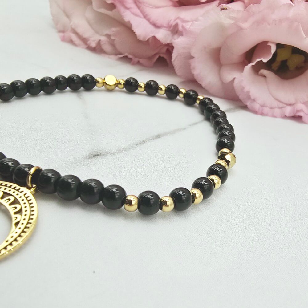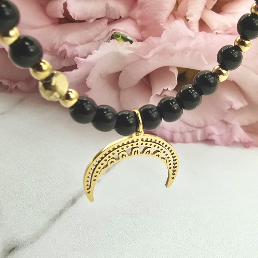 Bransoletka StaloweLOVE gumkowa ozdobiona czarnymi koralikami przedzielanymi złotymi kulkami ze stali chirurgicznej. Przywieszka księżyc ażurowy. Bardzo efektowna bransoletka. Rozmiar uniwersalny. Przywieszka ok. 1,8 cm.