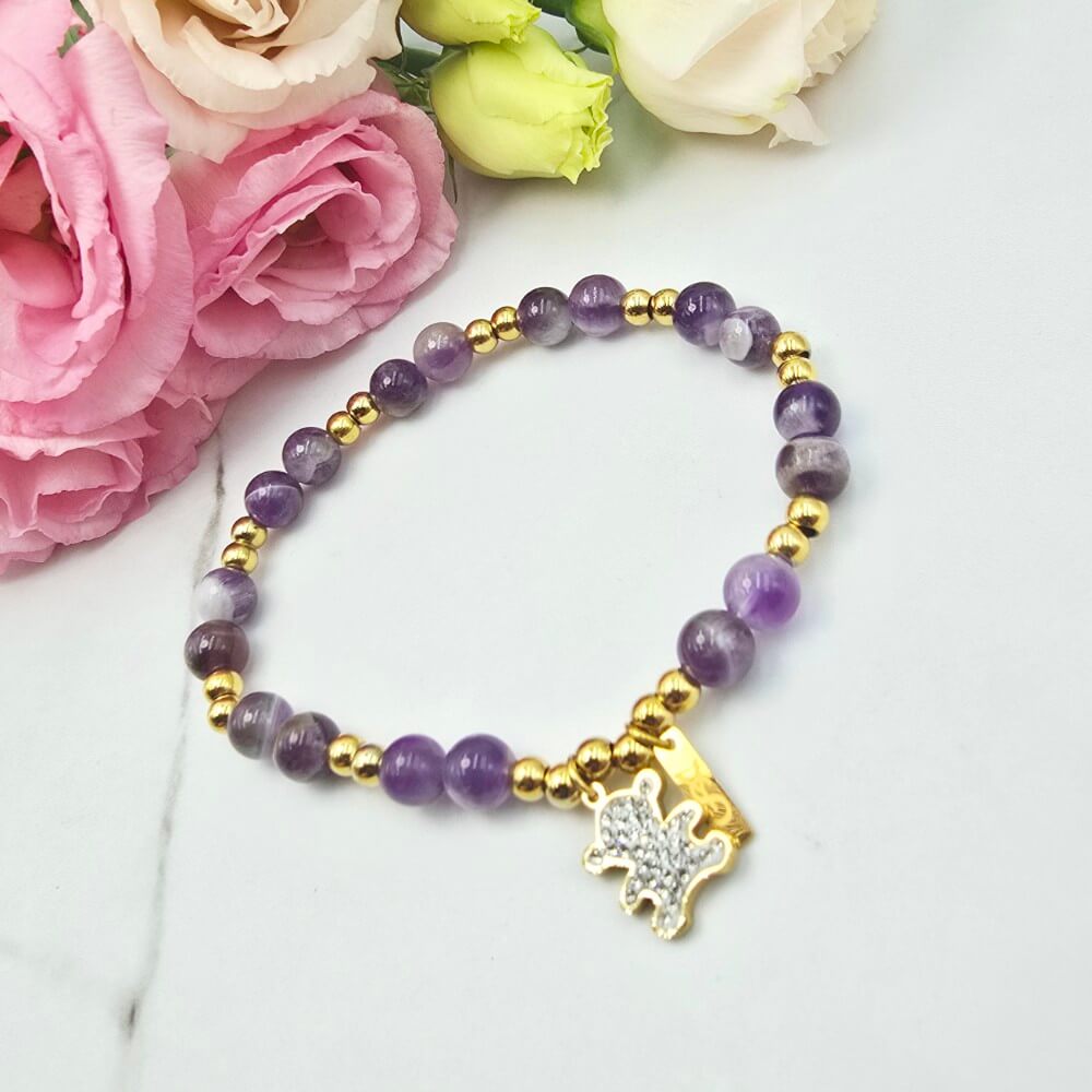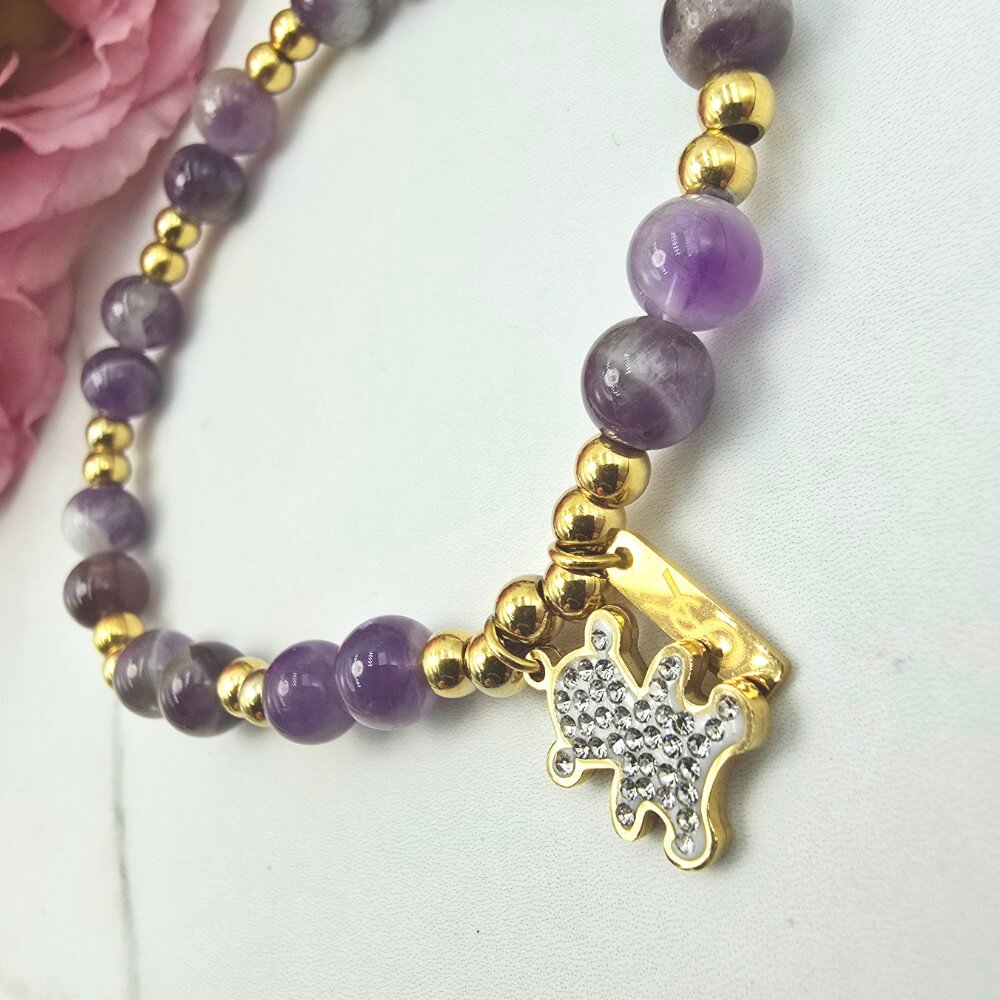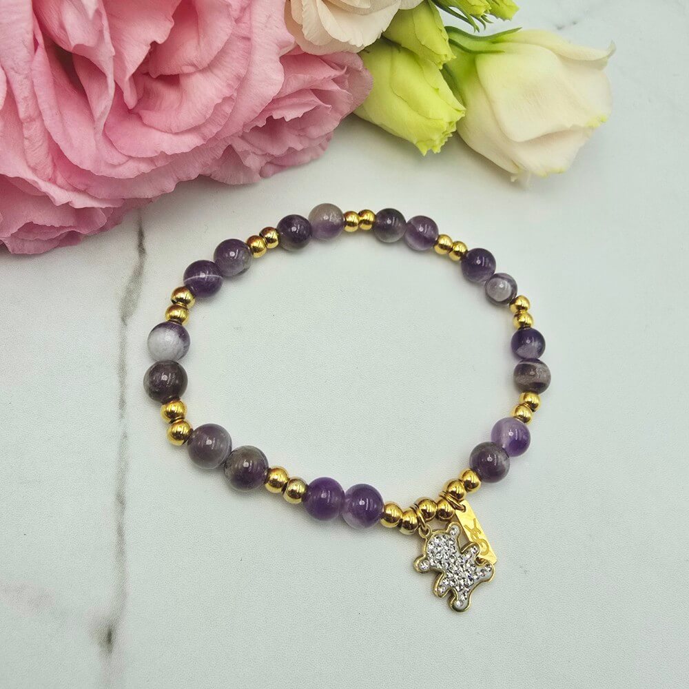 Bransoletka gumkowa StaloweLOVE cała wykonana z pięknych kamieni fioletowych i złotych kuleczek - przywieszka miś ozdobiony cyrkoniami.