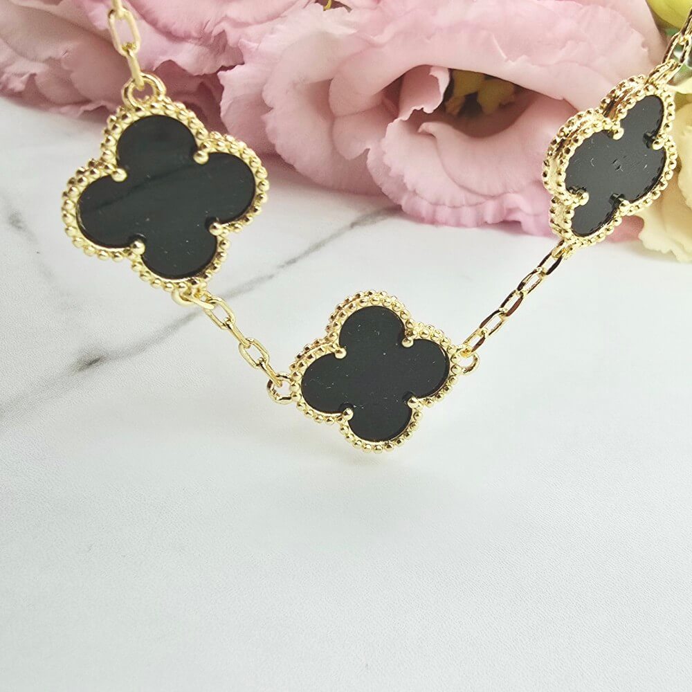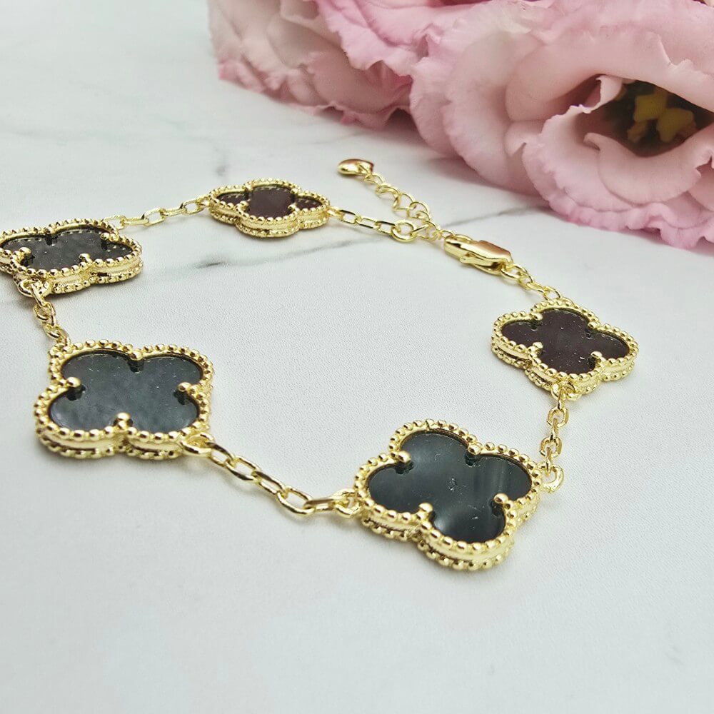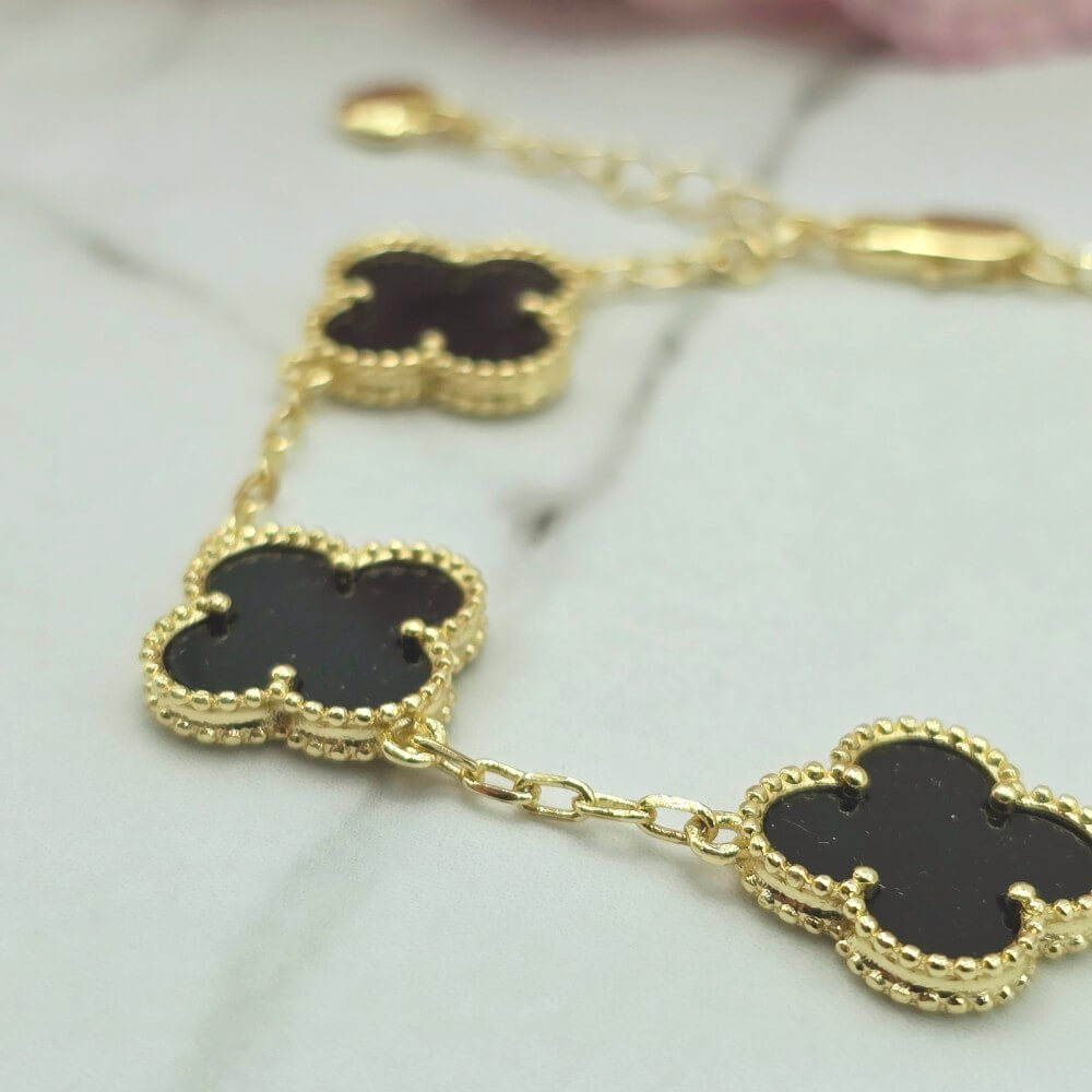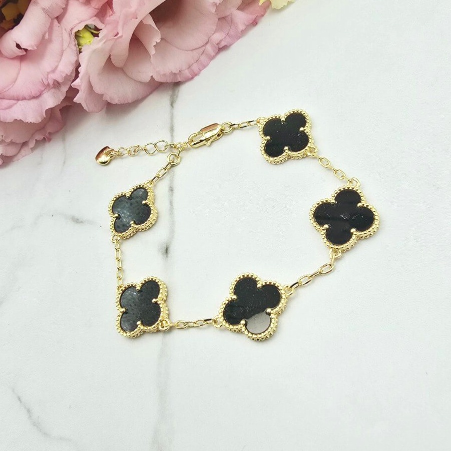 Piękna bransoletka StaloweLOVE z pięcioma elementami w kształcie szerokiej koniczyny wypełnionej kolorem czarnym. Bransoletka świetna do noszenia na co dzień, nie trzeba ich zdejmować można nosić non stop. Stal nie reaguje z wodą!! Zobacz naszyjniki i kolczyki z podobnym motywem. Jasny odcień złota.