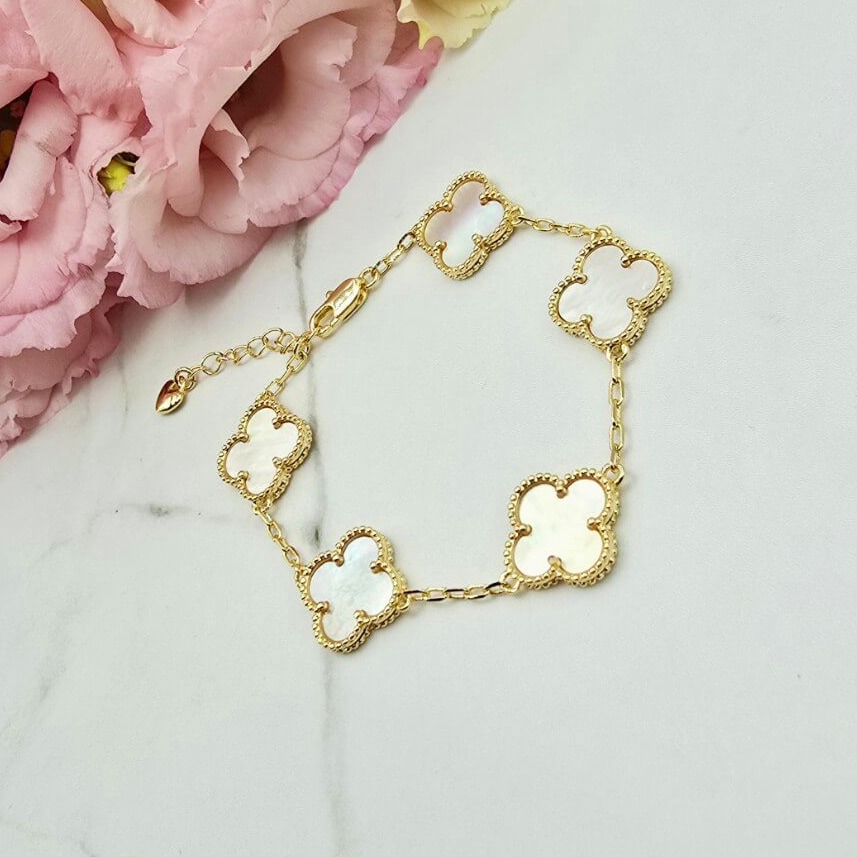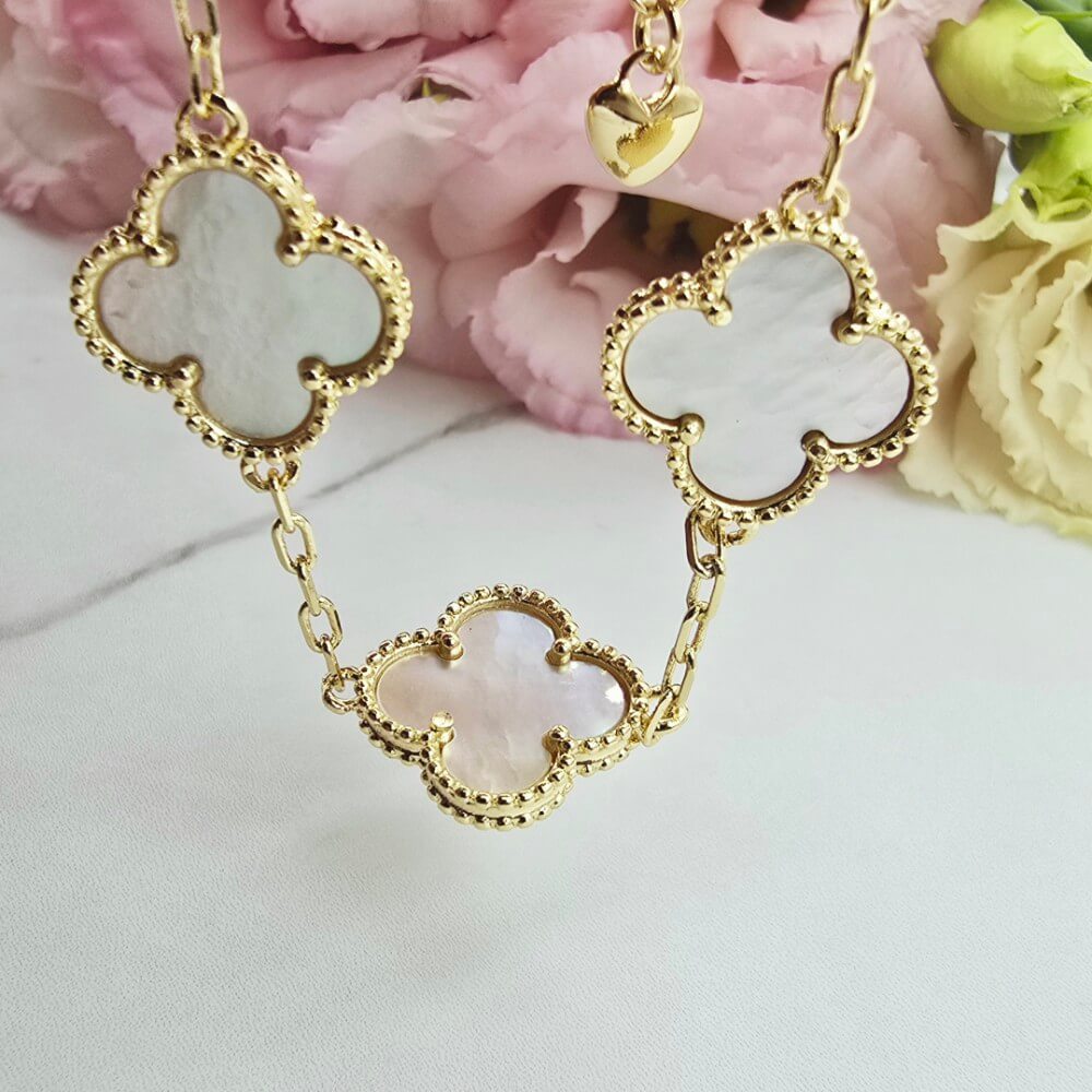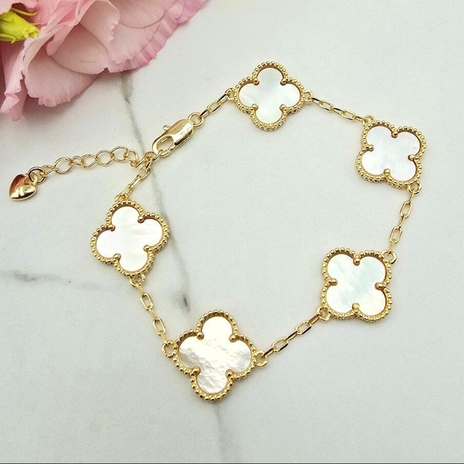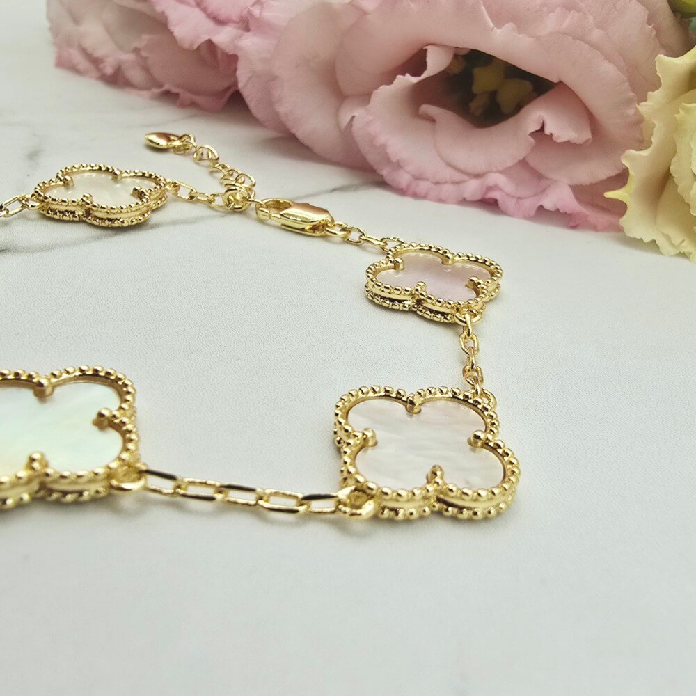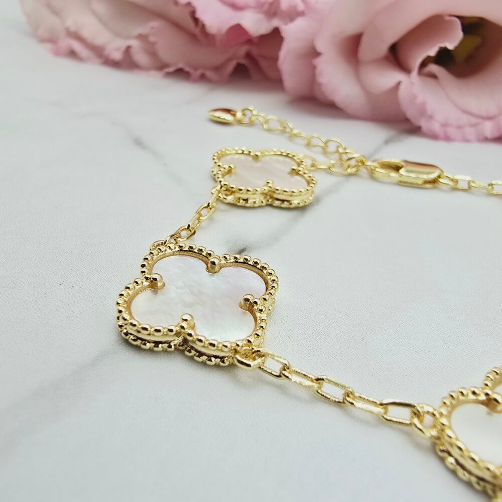 Piękna bransoletka StaloweLOVE z pięcioma elementami w kształcie szerokiej koniczyny wypełnionej masą perłową. Bransoletka świetna do noszenia na co dzień, nie trzeba ich zdejmować można nosić non stop. Stal nie reaguje z wodą!! Zobacz naszyjniki i kolczyki z podobnym motywem. Jasny odcień złota.