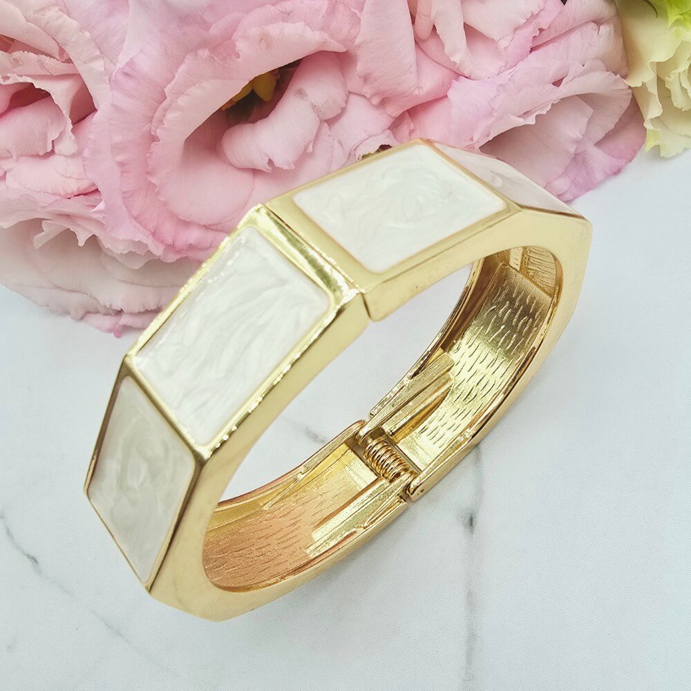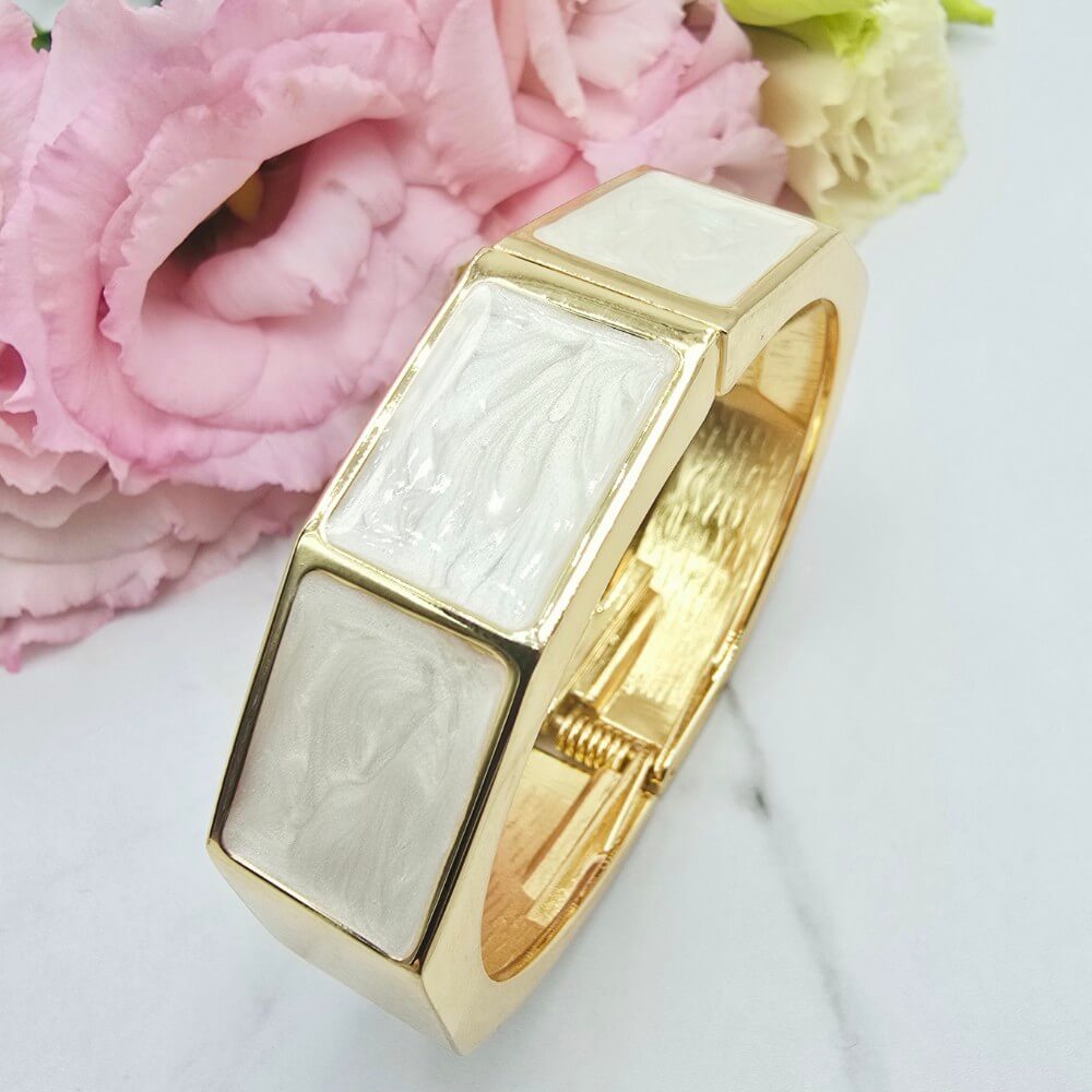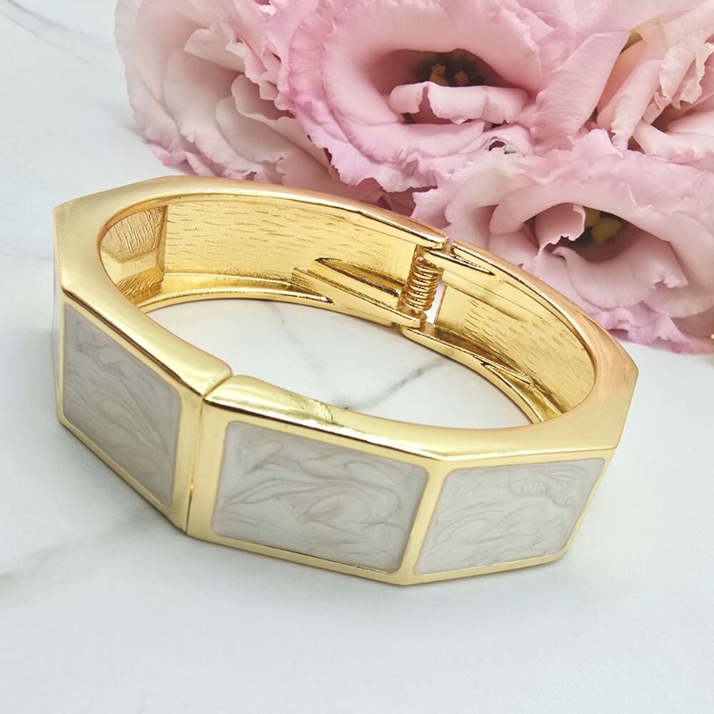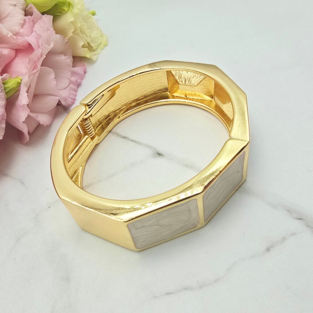 Bransoletka StaloweLOVE PREMIUM sztywna - zamykana na sprężynkę. Bardzo ciekawa bransoletka zdobiona jasną masą perłową.