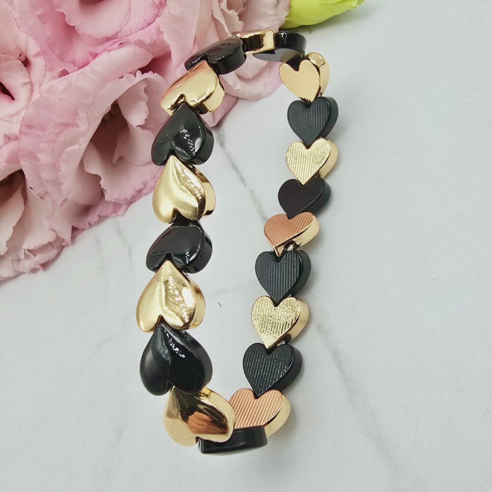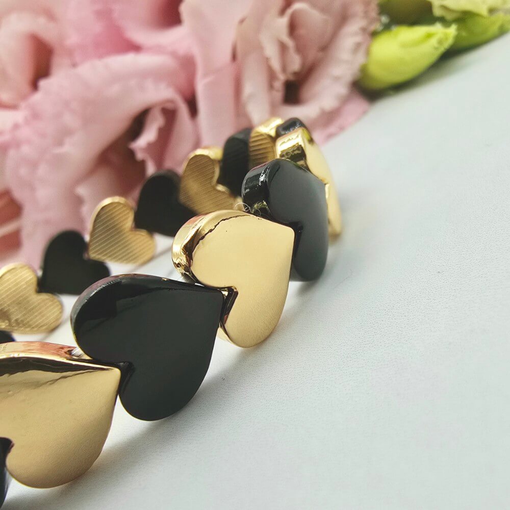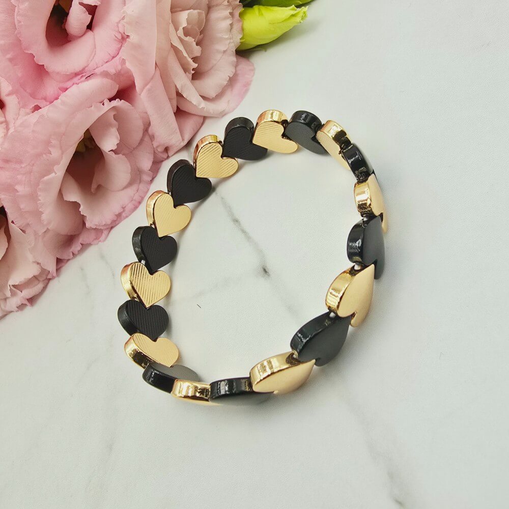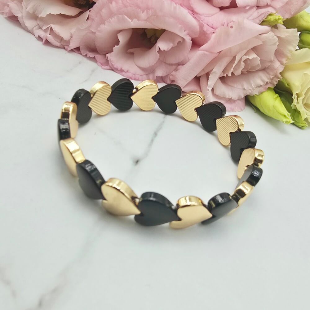 Piękna bransoletka z kolekcji StaloweLOVE składająca się z gumki jubilerskiej z ułożonymi obok siebie sercami w różnych kolorach.