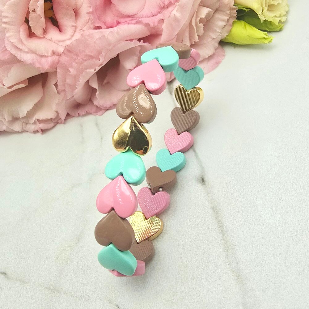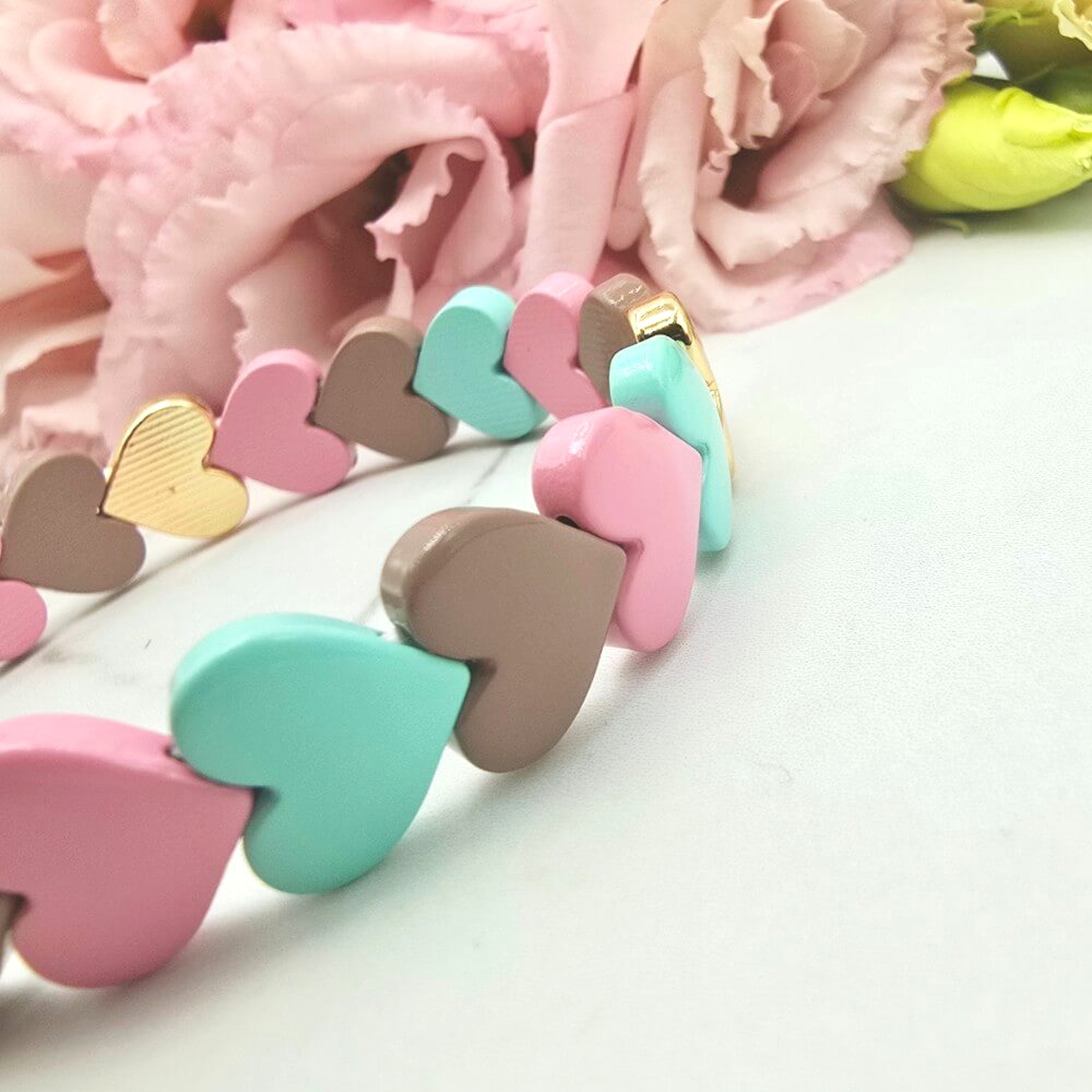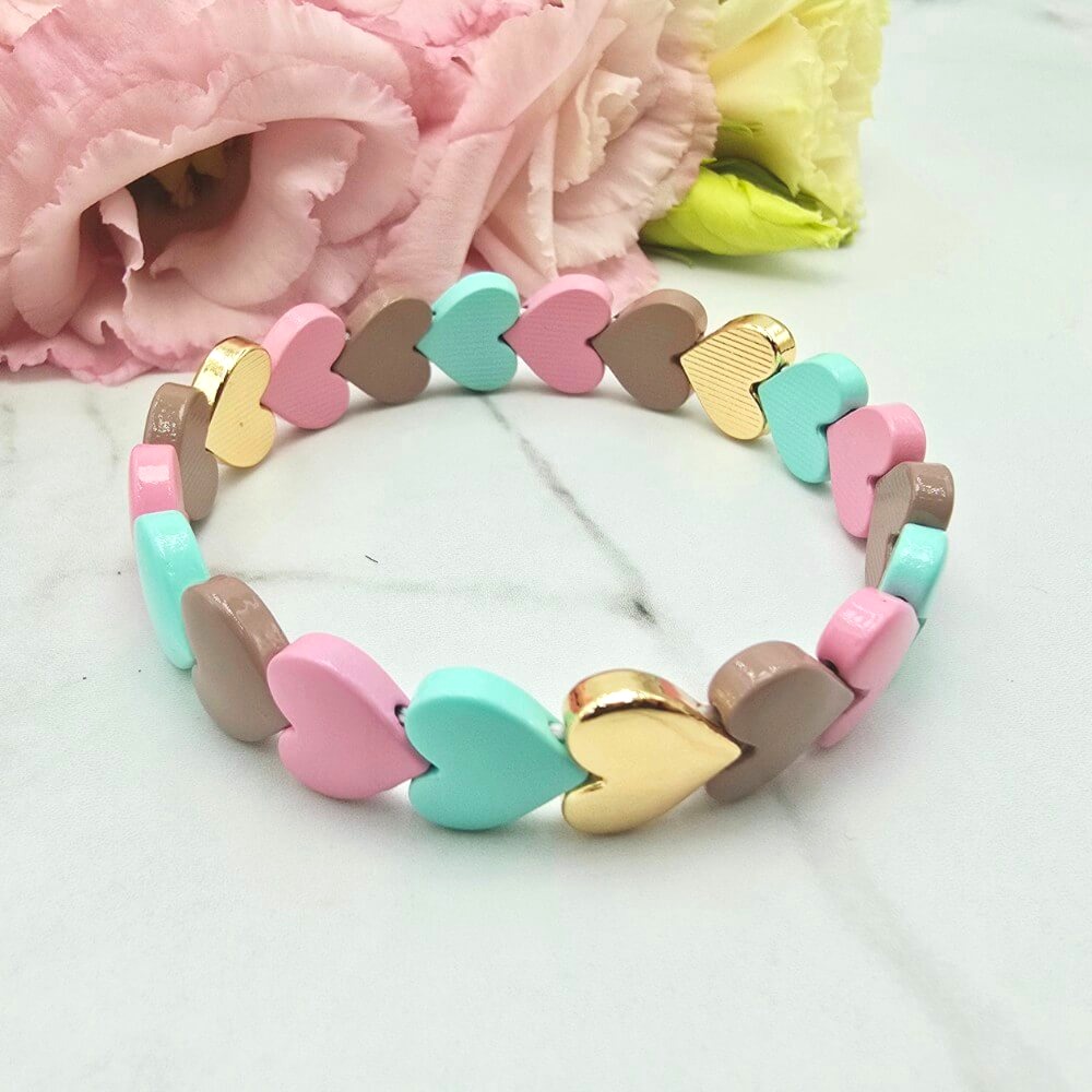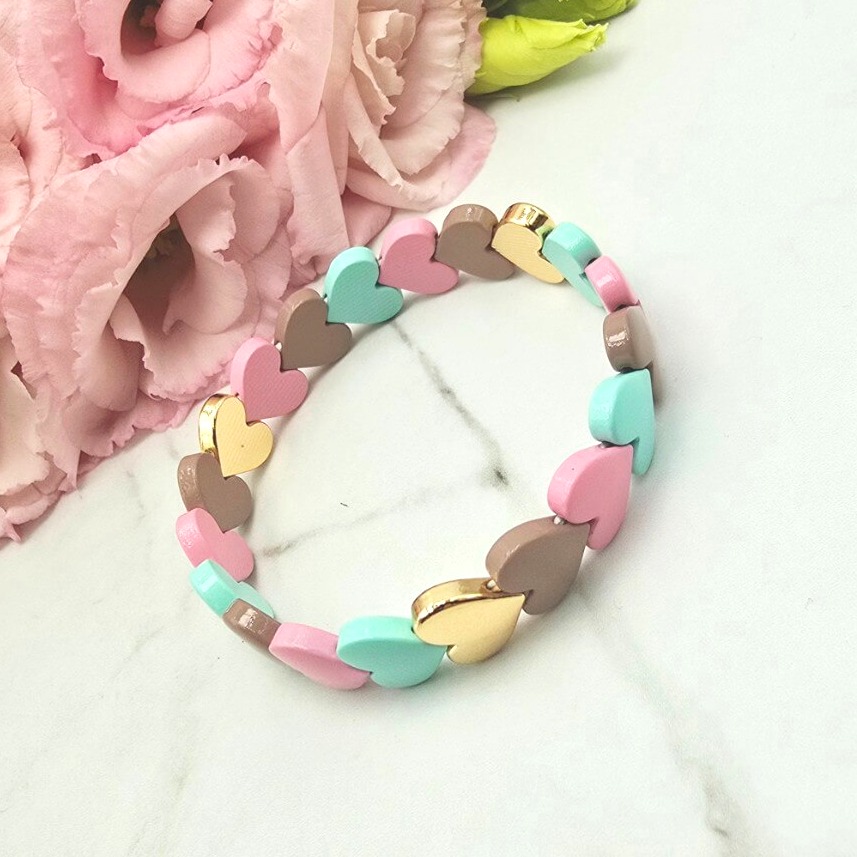 Piękna bransoletka z kolekcji StaloweLOVE składająca się z gumki jubilerskiej z ułożonymi obok siebie sercami w różnych kolorach.