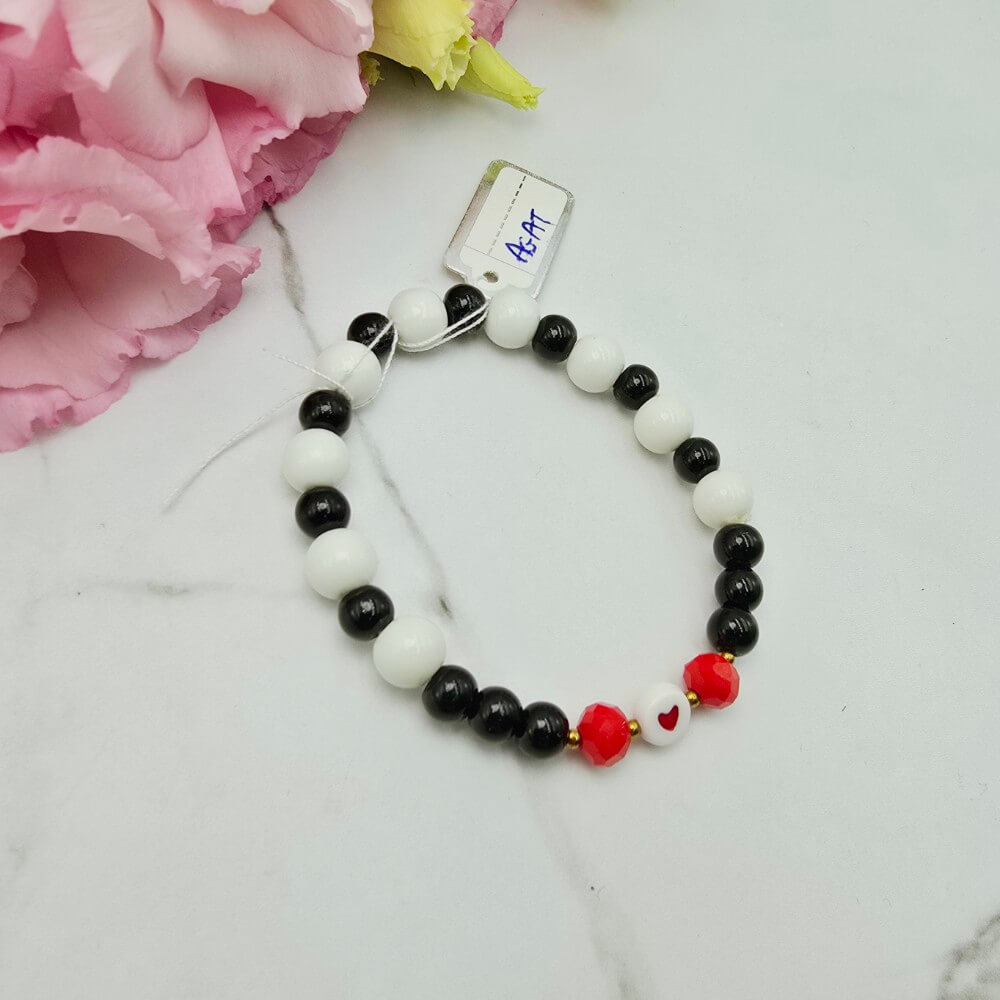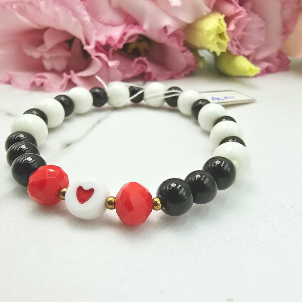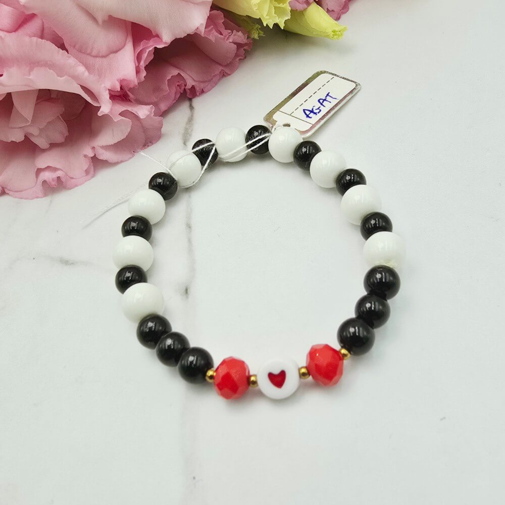 Bransoletka gumkowa StaloweLOVE wykonana z białych i czarnych kamieni AGAT na gumce jubilerskiej - przywieszka serce czerwone. Uniwersalny rozmiar dziecięcy. Kamienie ok 0,8 cm. Rozmiar dziecięcy.