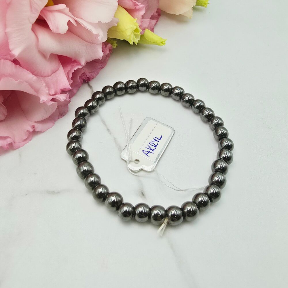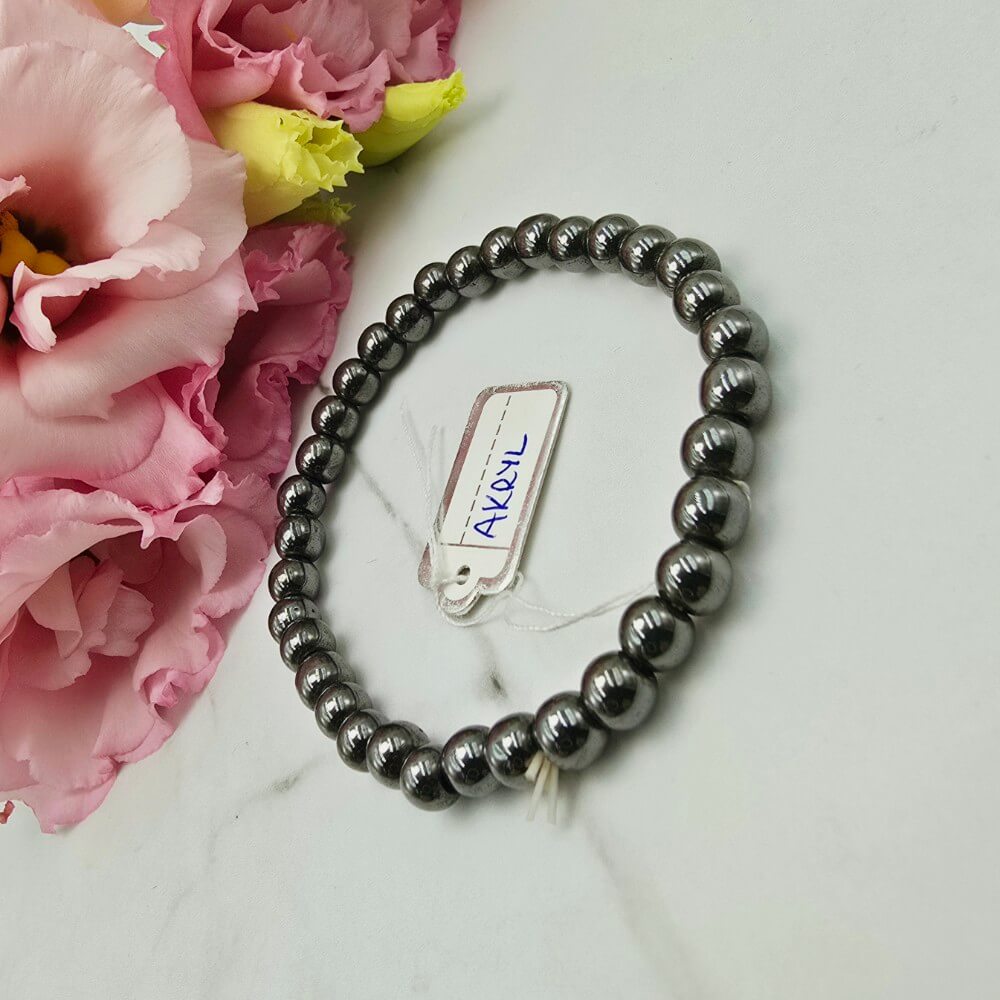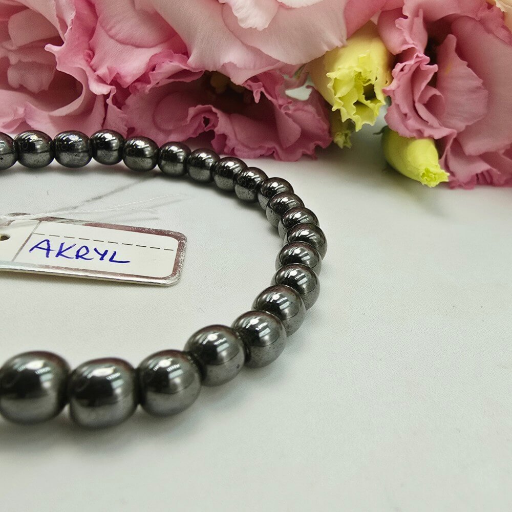 Bransoletka na gumce jubilerskiej z ciemno srebrnymi akrylowymi koralikami wielkości ok. 0,6 cm. Bardzo efektowna bransoletka. Rozmiar uniwersalny .