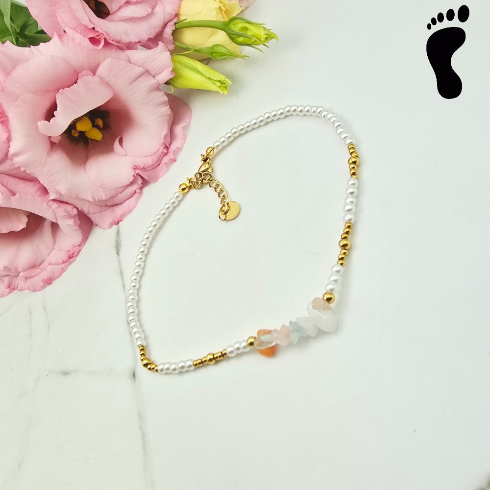 Piękna bransoletka na stopę ze stali chirurgicznej składająca się z małych perełek złotych kuleczek i kilku kryształków kolorowych.
