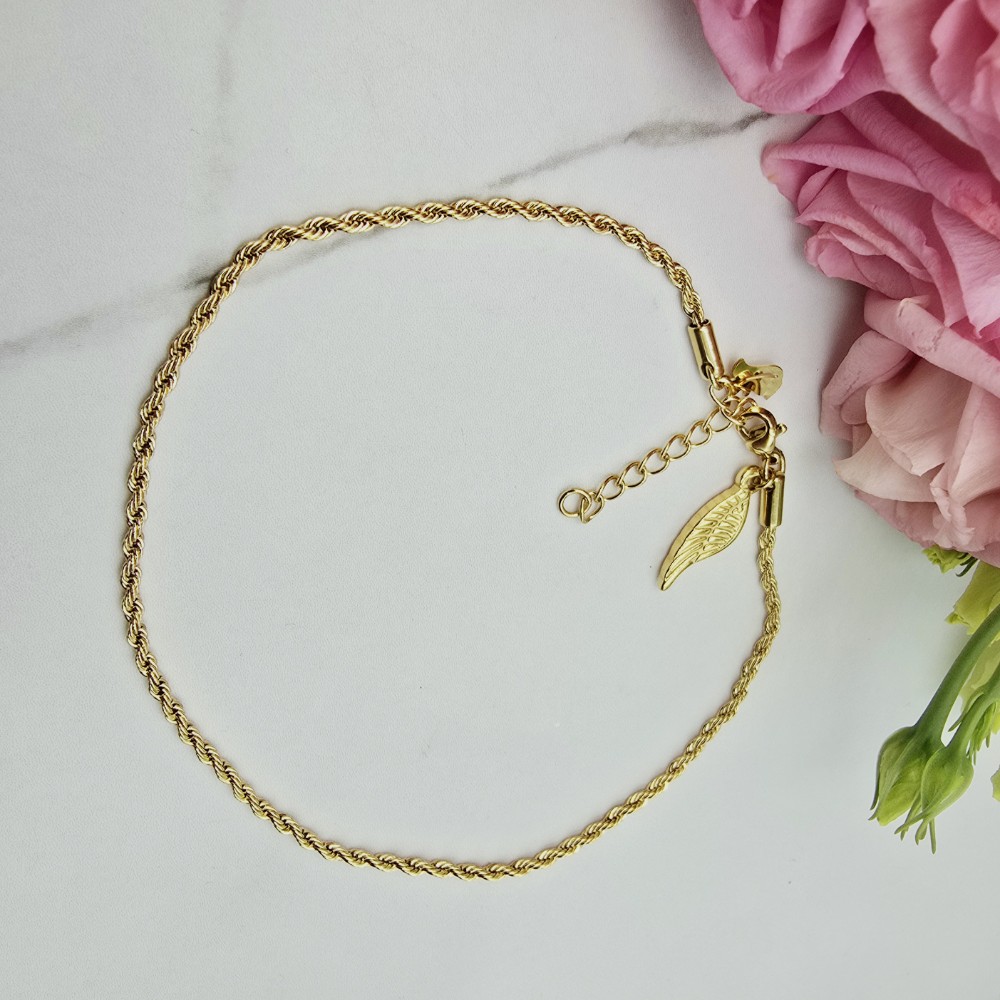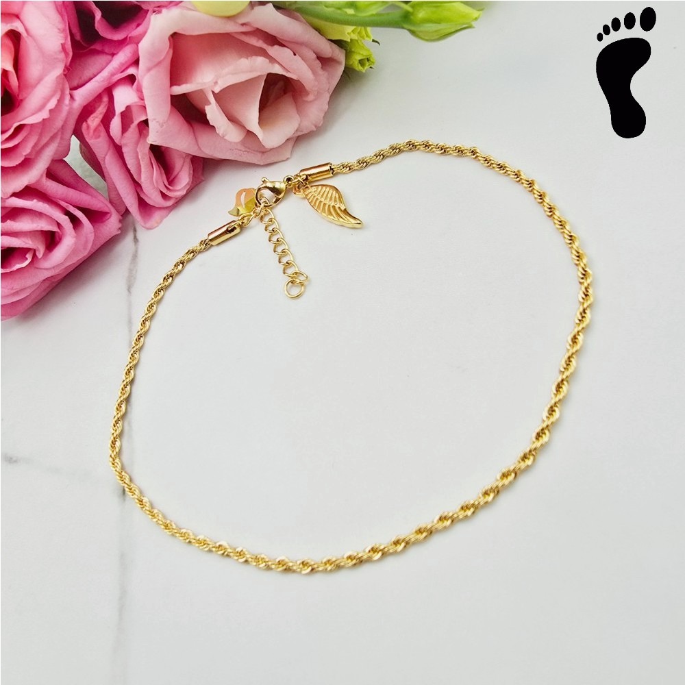 Cudowna bransoletka na stopę ze stali chirurgicznej łańcuszek splot. Przy zapięciu przywieszka skrzydło.