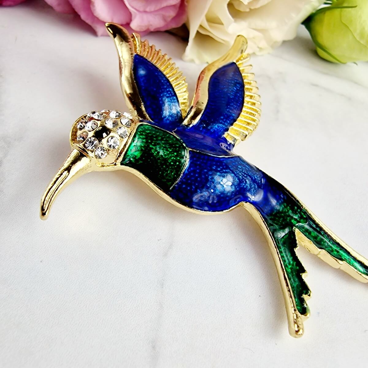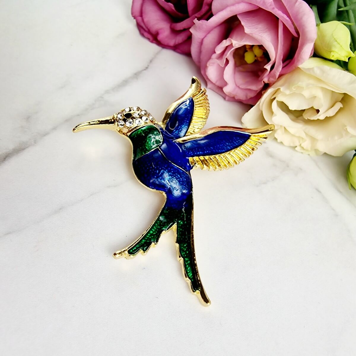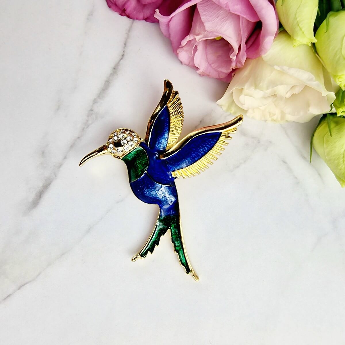 Przepiękna złota BROSZKA ozdobna Koliber - granatowy. Koliber to symbol osiągania tego, co wydaje się niemożliwe. Kolibry zawsze aktywnie poszukują najsłodszego nektaru, przypominając nam, by zawsze szukać dobra w życiu i piękna w każdym dniu. W rodzimych amerykańskich kulturach, koliber symbolizuje niekończącą się radość i nektar życia.