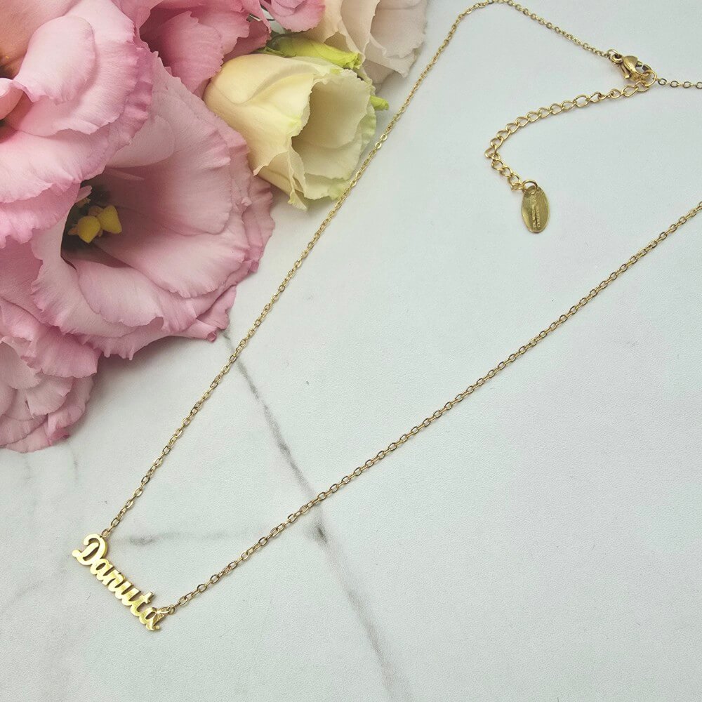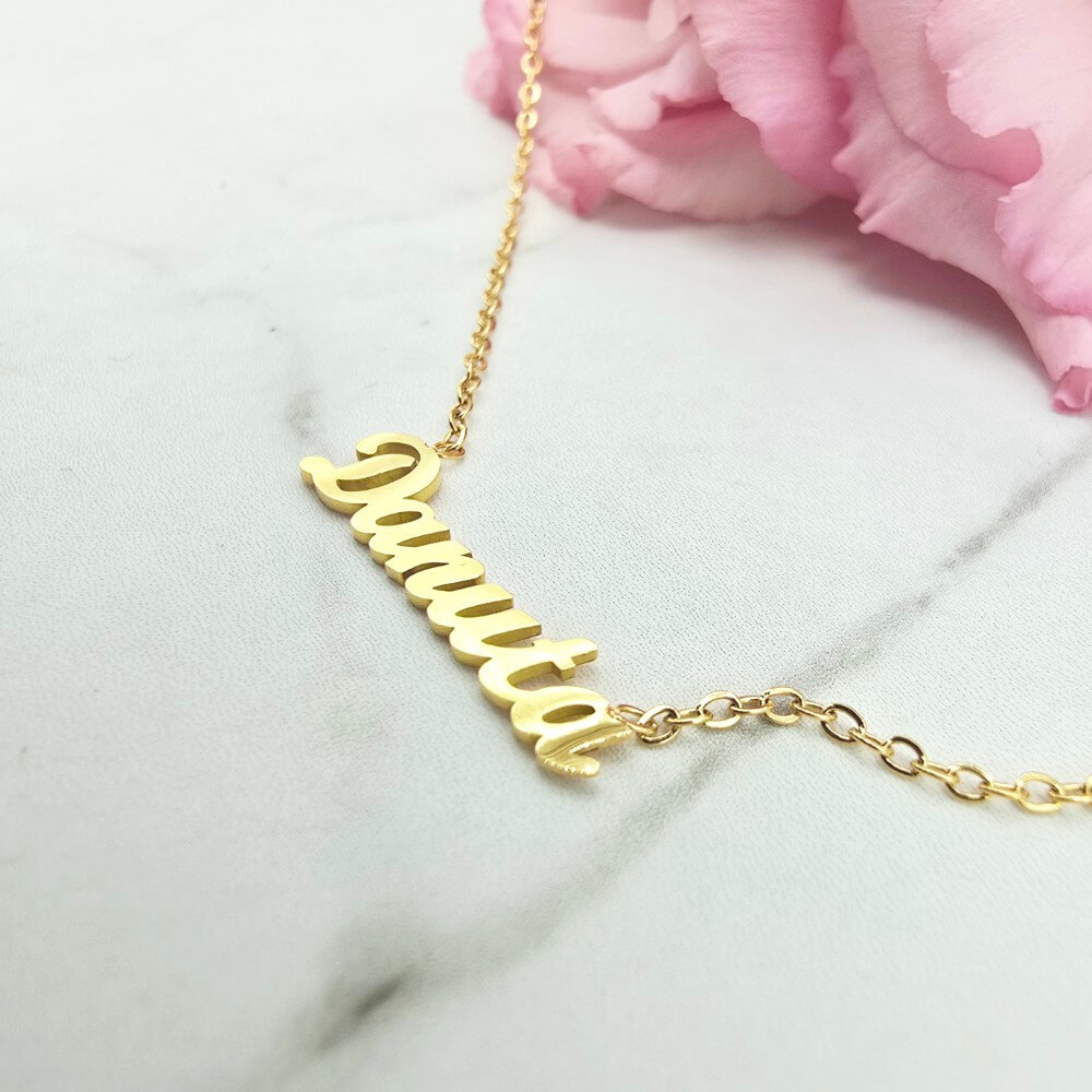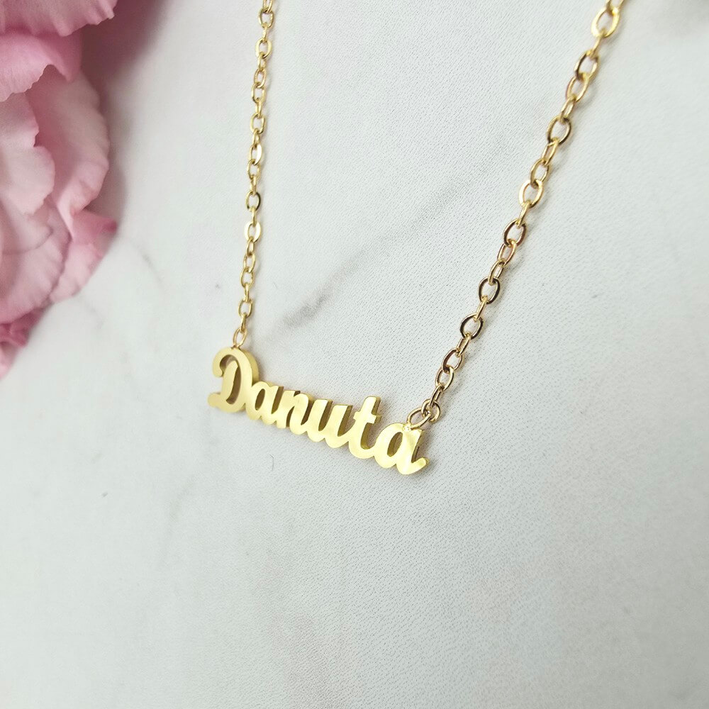 Naszyjnik ozdobiony zawieszką z imieniem DANUTA w złotym kolorze. Elegancka odręczna czcionka. Jeżeli poszukujesz oryginalnego prezentu taki naszyjnik jest idealnym wyborem!! Spersonalizowany dodatek sprawi ogromną przyjemność obdarowanej kobiecie.