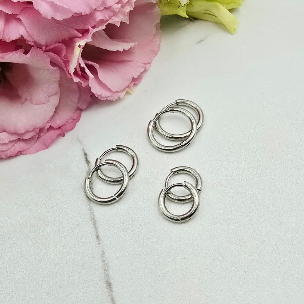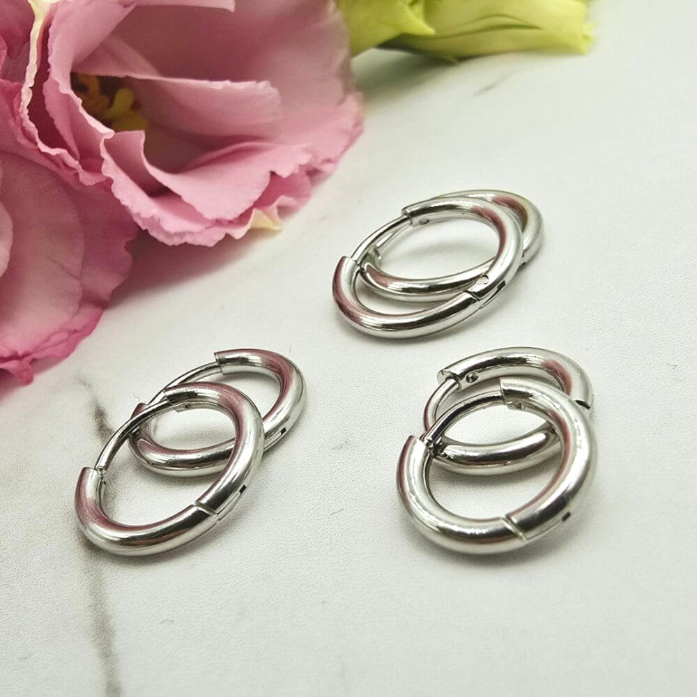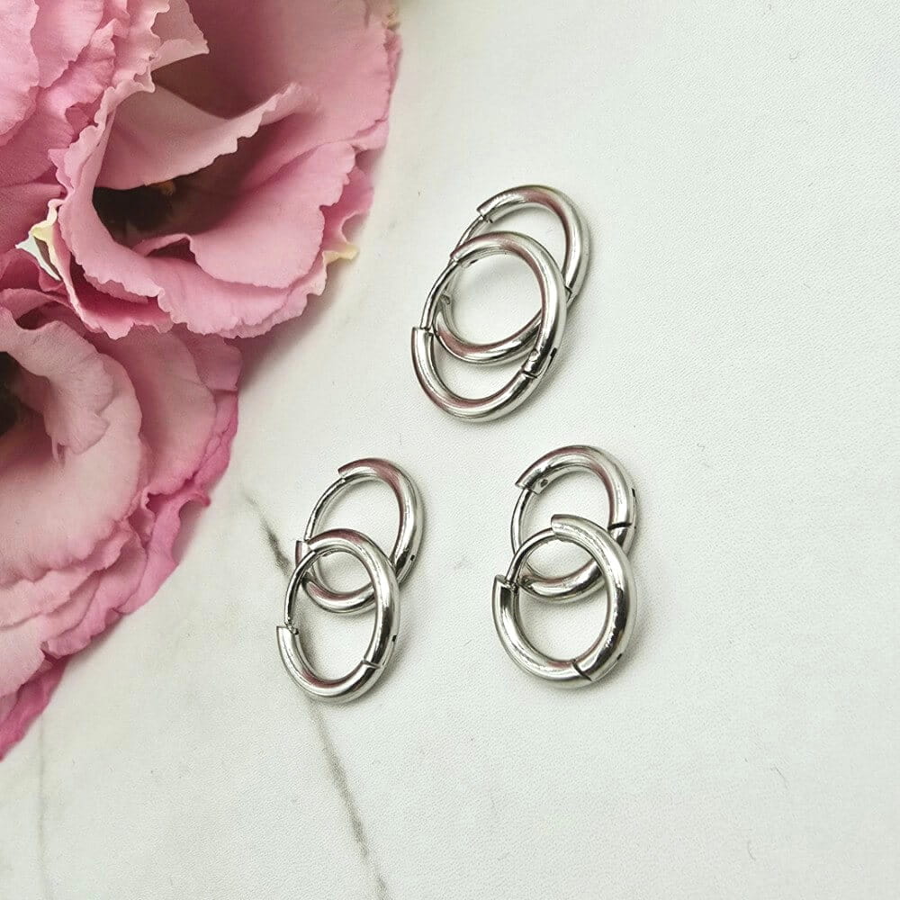 Piękne ZESTAW 3 pary kolczyków z zapięciem typu bigiel angielski - kolor srebrny. Trzy pary kolczyków klasyczny bigiel o trzech wielkościach. Kolczyki z kolekcji StaloweLOVE wykonane z wysokiej jakości stali chirurgicznej 316L zwanej również stalą nierdzewną/szlachetną która: nie zmienia koloru, nie reaguje z wodą i nie uczula!!