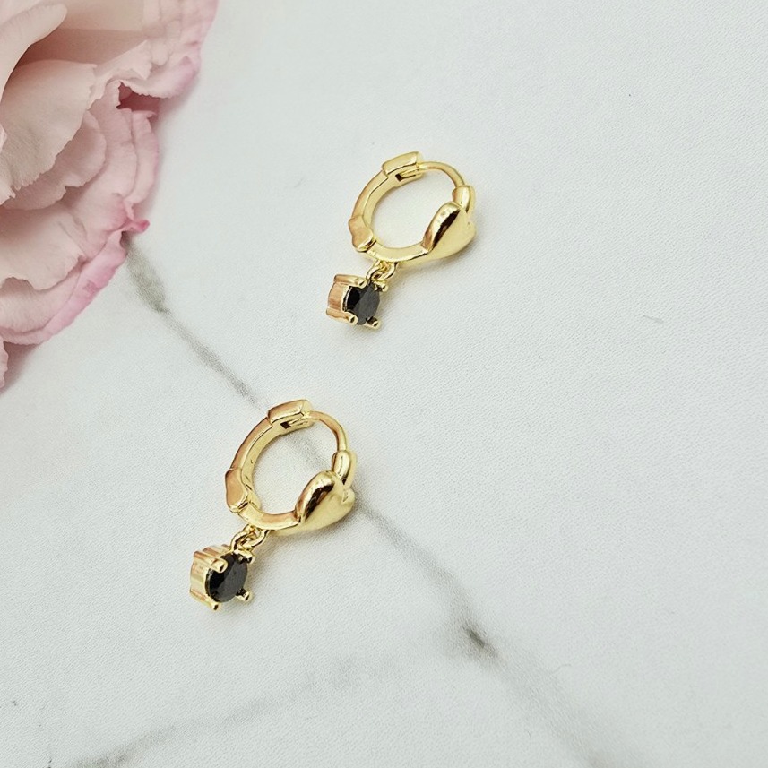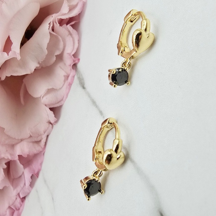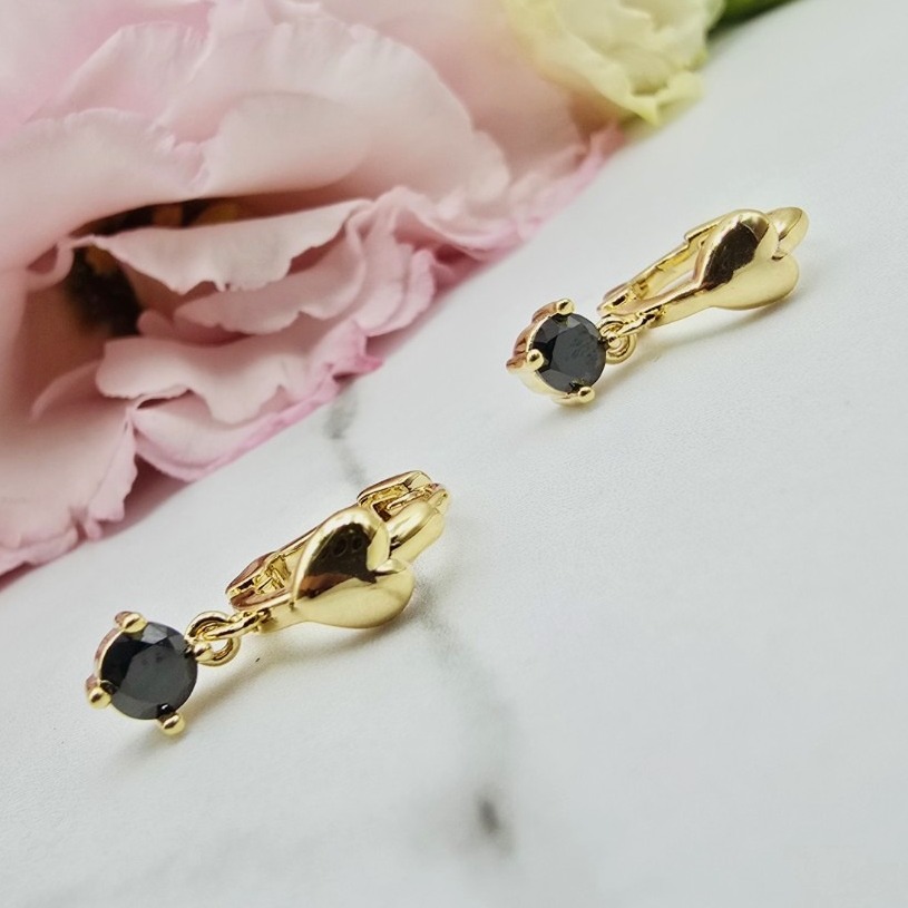 Bardzo piękny wzór kolczyków w kształcie okrągłego czarnego szlifowanego kryształka - zapięcie zatrzaskowe bigiel. Na biglu dodatkowo ozdobne serduszko. Jasny odcień złota.
