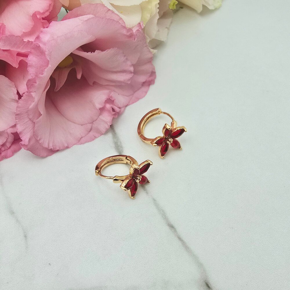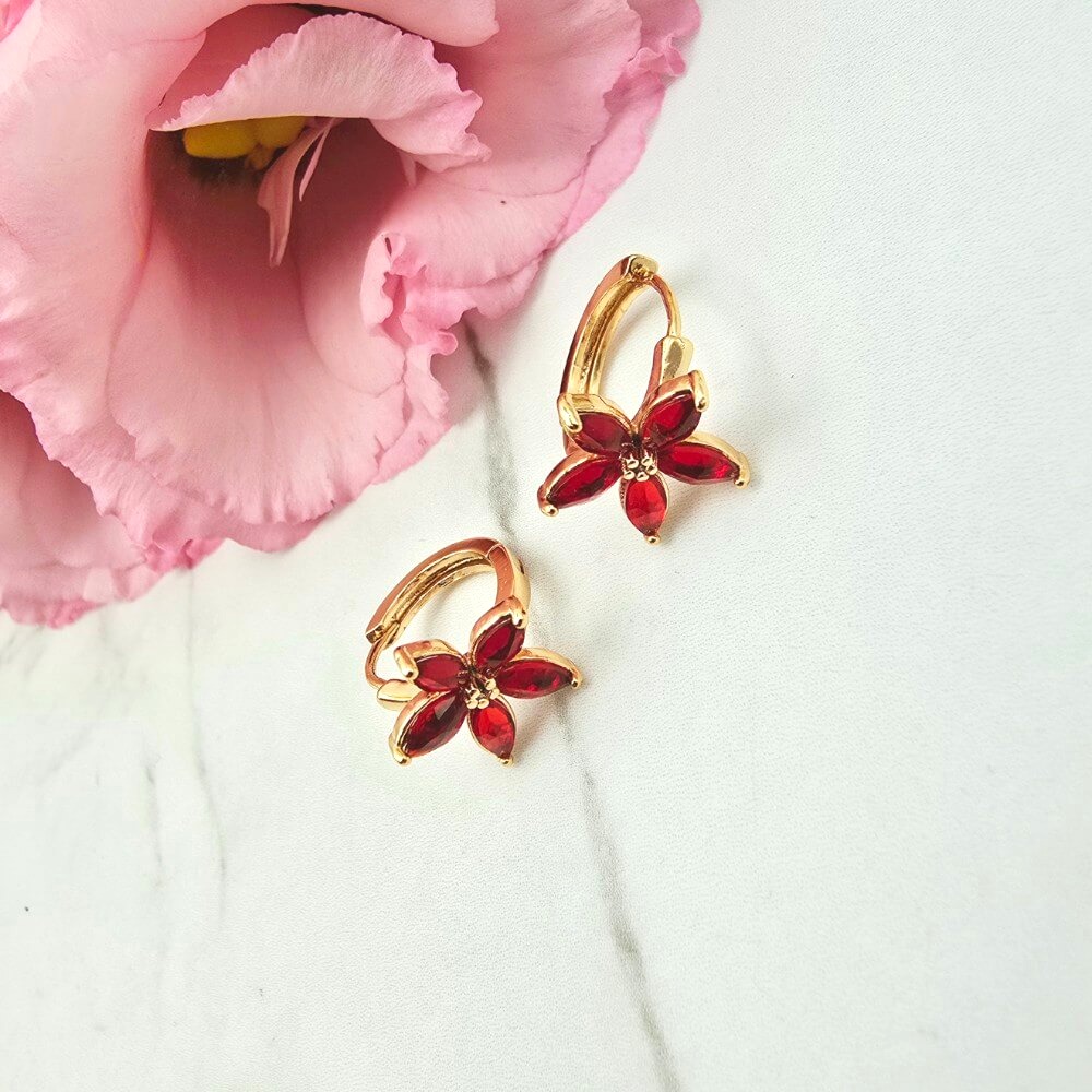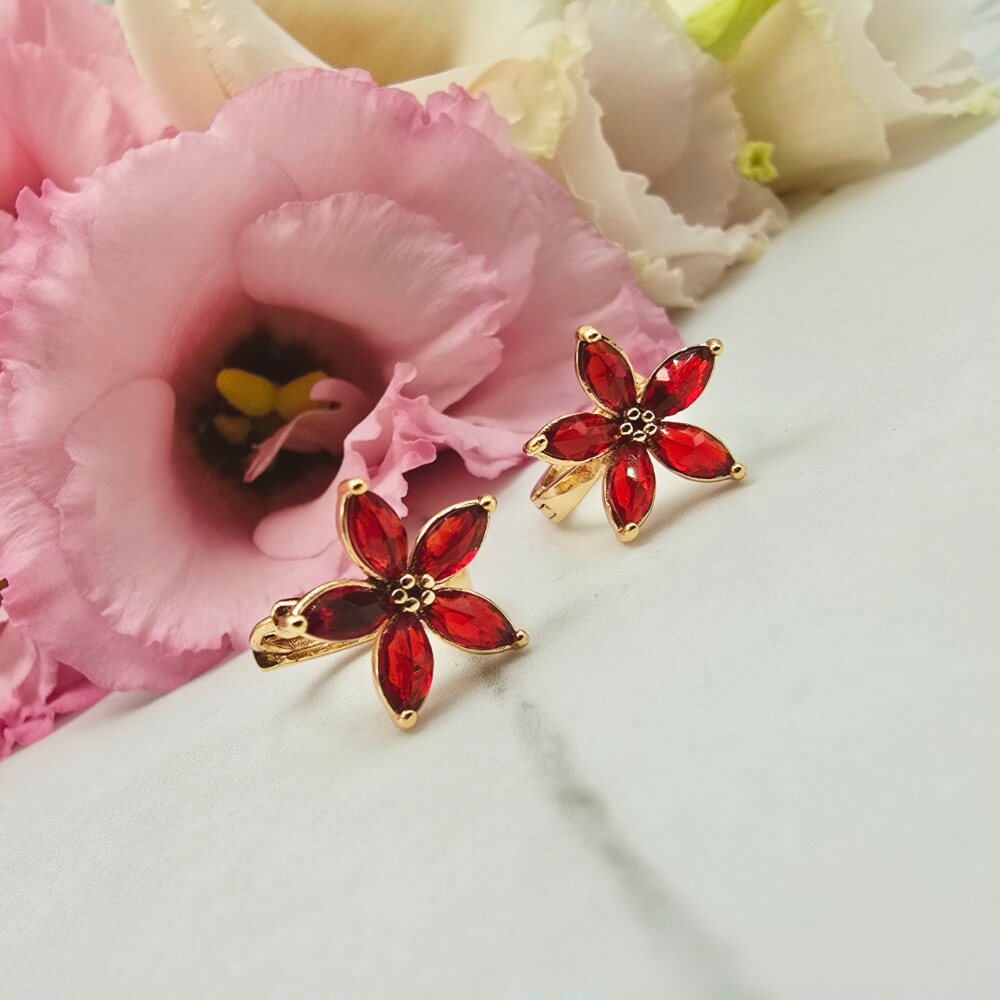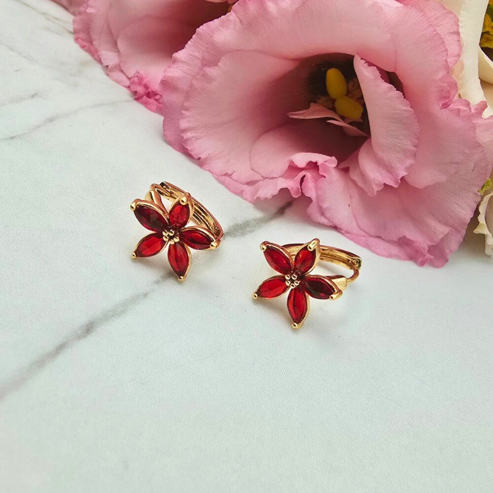 Bardzo popularny klasyczny wzór kolczyków bigiel z kwiatkiem ozdobionym cudownymi czerwonymi kryształkami. Kolczyki z kolekcji StaloweLOVE wykonane z wysokiej jakości stali chirurgicznej 316L w złotym kolorze.