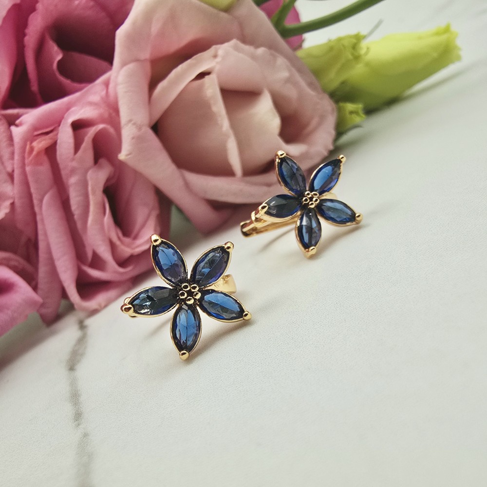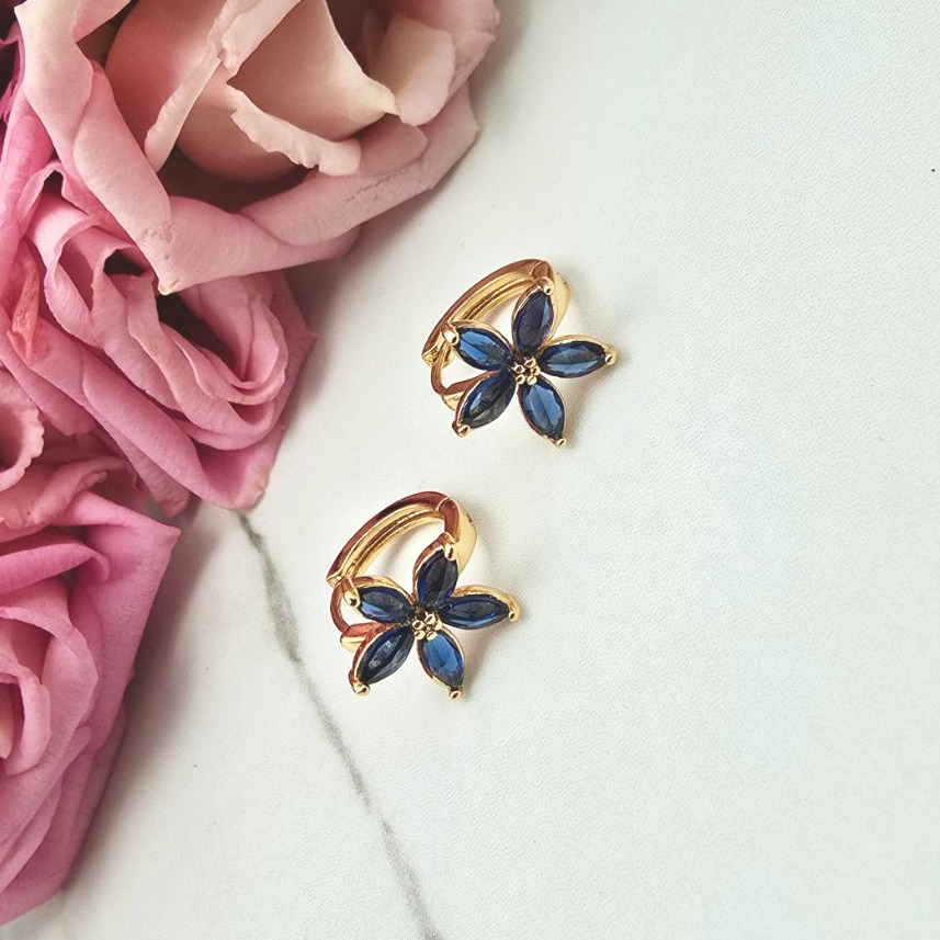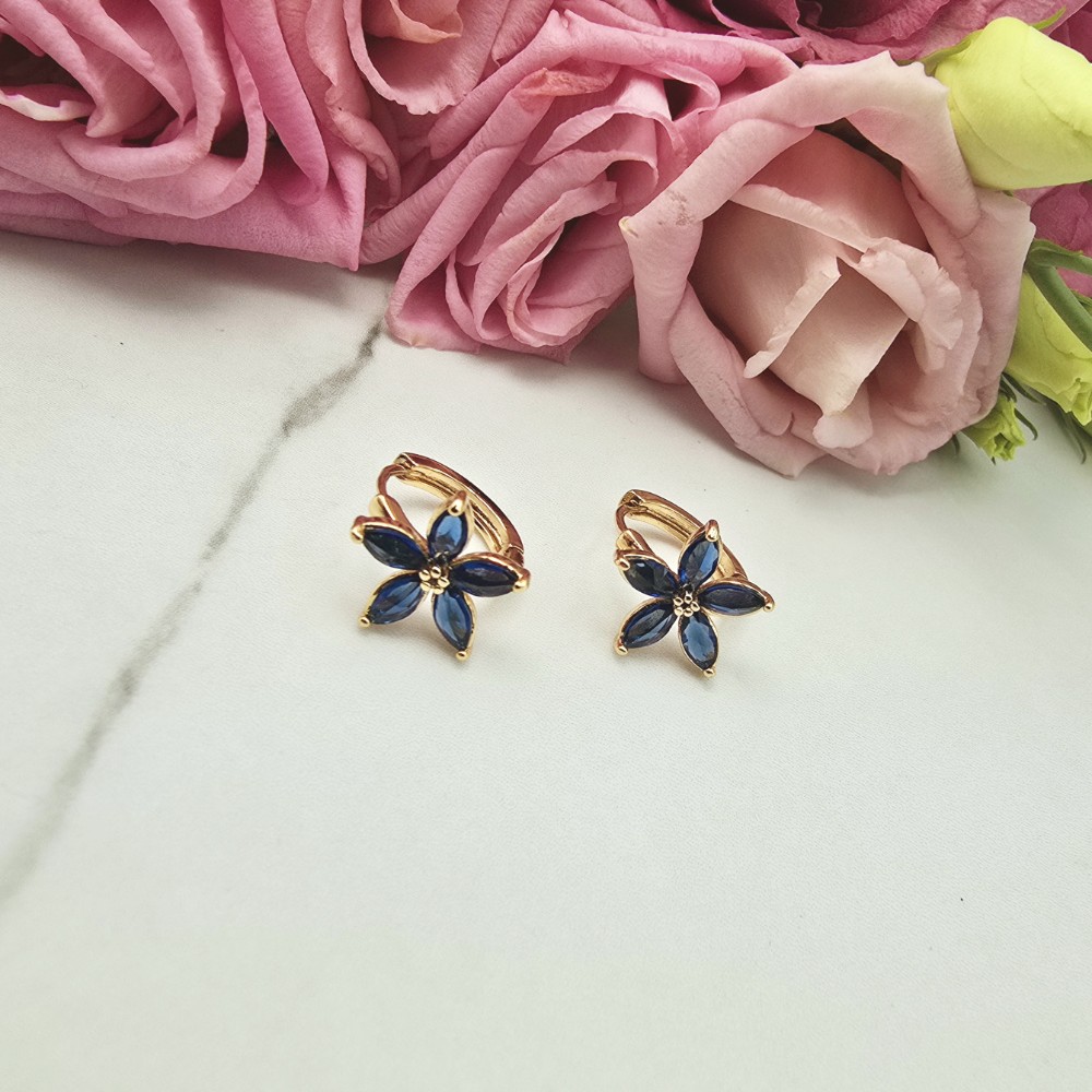 Bardzo popularny klasyczny wzór kolczyków okrągłych bigiel z kwiatkiem ozdobionym cudownymi granatowymi kryształkami. Dodatkowo jasne cyrkonie. Kolczyki z kolekcji StaloweLOVE wykonane z wysokiej jakości stali chirurgicznej 316L w złotym kolorze.