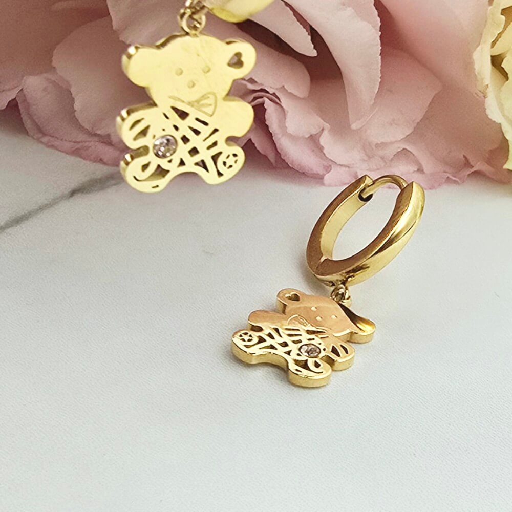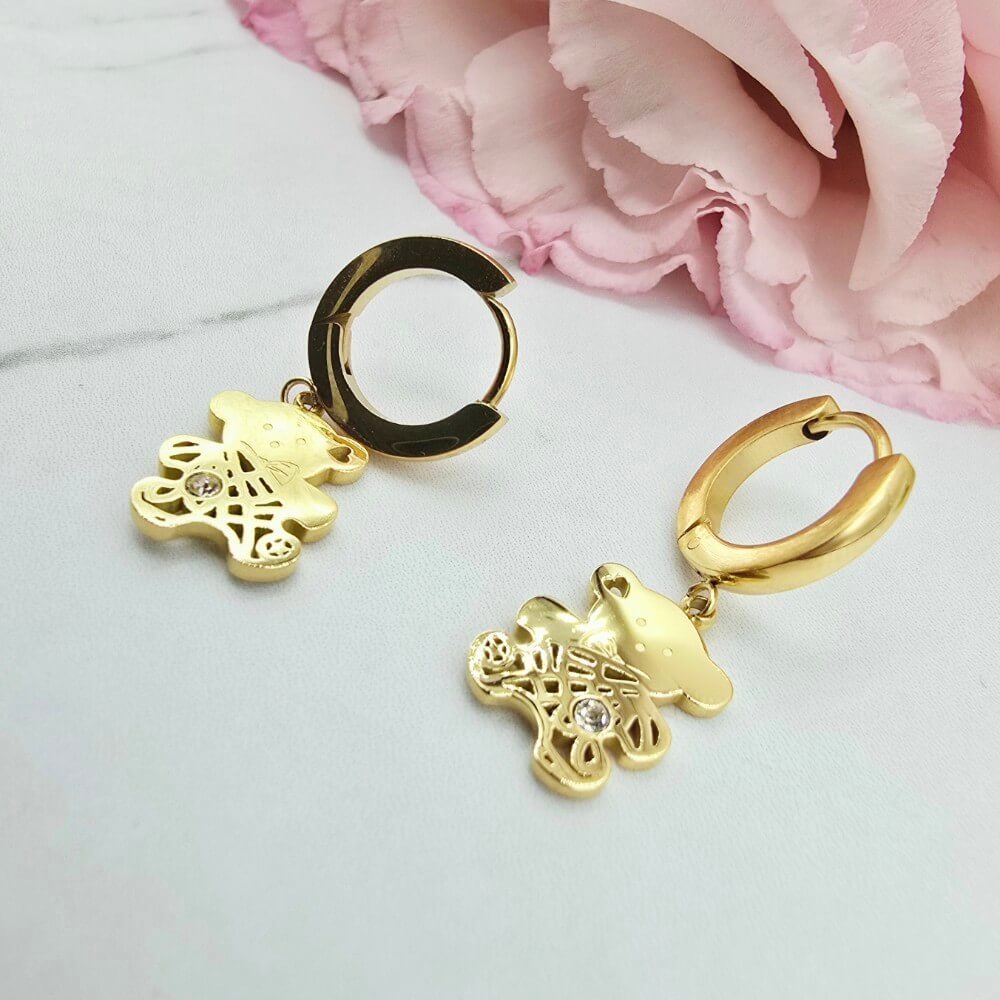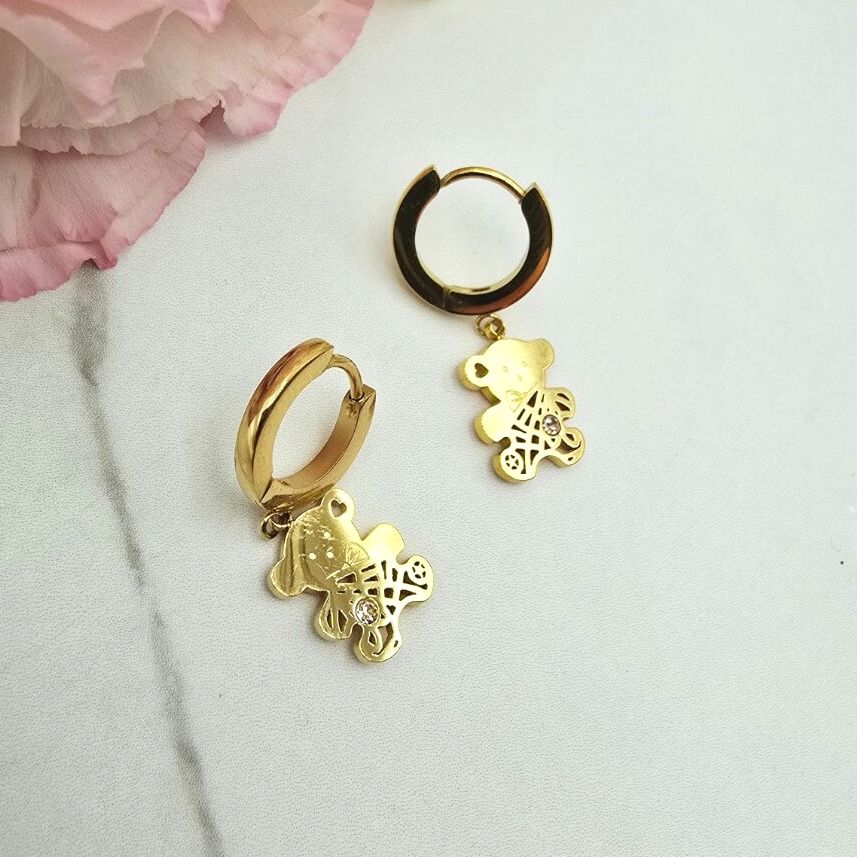 Piękne kolczyki złote z zapięciem typu bigiel angielski. Wiszące misie z delikatną cyrkonią. Kolczyki z kolekcji StaloweLOVE wykonane z wysokiej jakości stali chirurgicznej 316L zwanej również stalą nierdzewną/szlachetną która: nie zmienia koloru, nie reaguje z wodą i nie uczula!!