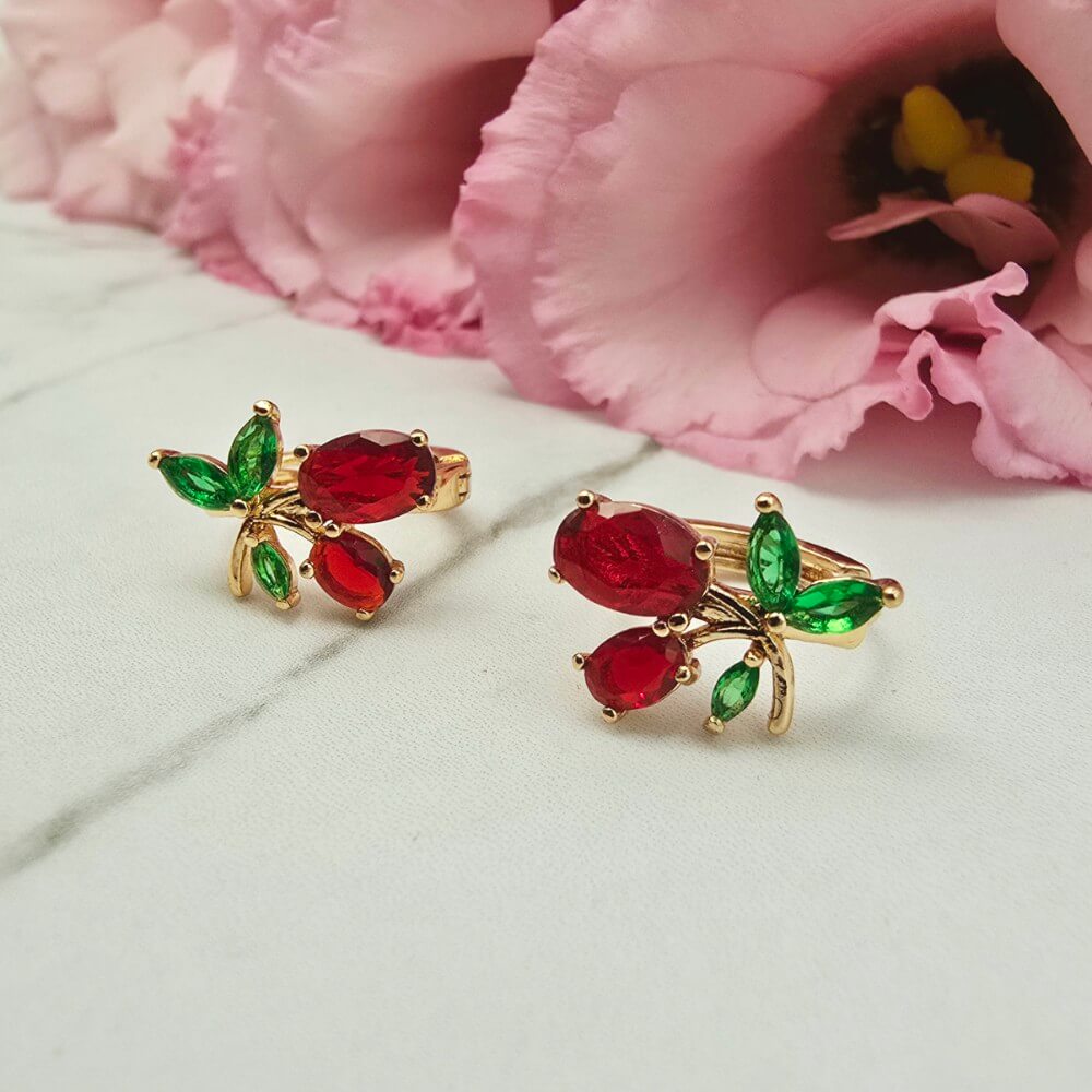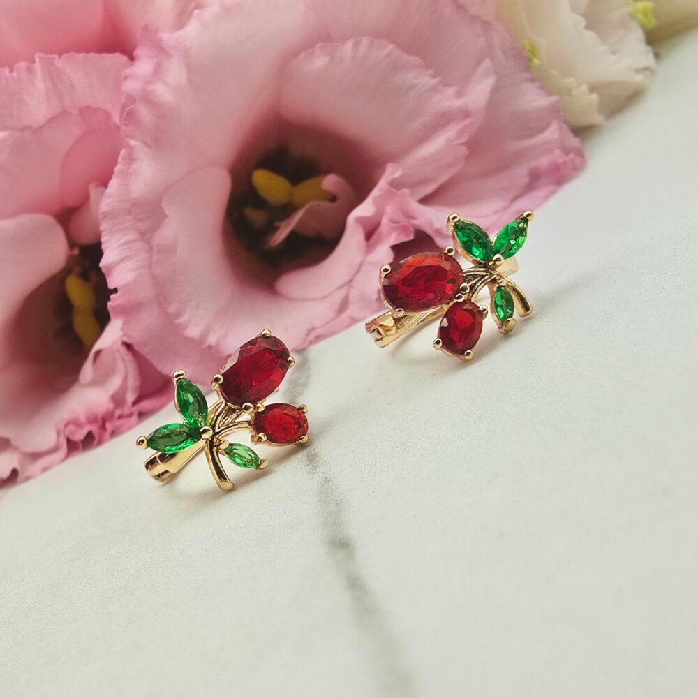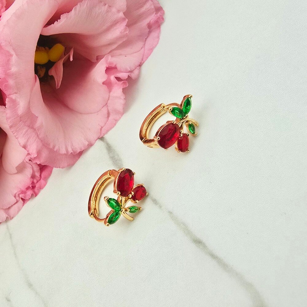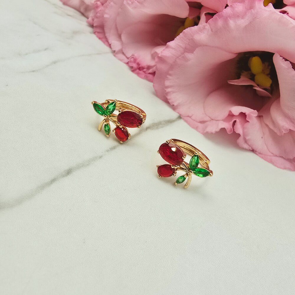 Piękne i delikatne kolczyki dwie wisienki z kryształków w kolorze czerwonym a na górze zielone listki. Super popularny wzór! Zapięcie klasyczny bigiel angielski.