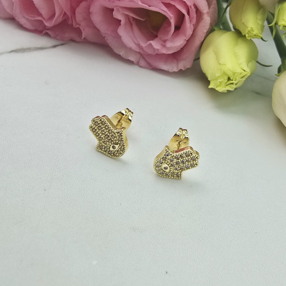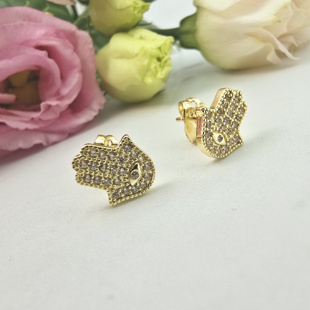 Popularny wzór kolczyków w kształcie dłoni wypełnionej cyrkoniami - model zwany "dłoń Fatimy". Kolczyki z kolekcji StaloweLOVE wykonane z wysokiej jakości stali chirurgicznej 316L w złotym kolorze możesz nosić na co dzień non stop!!