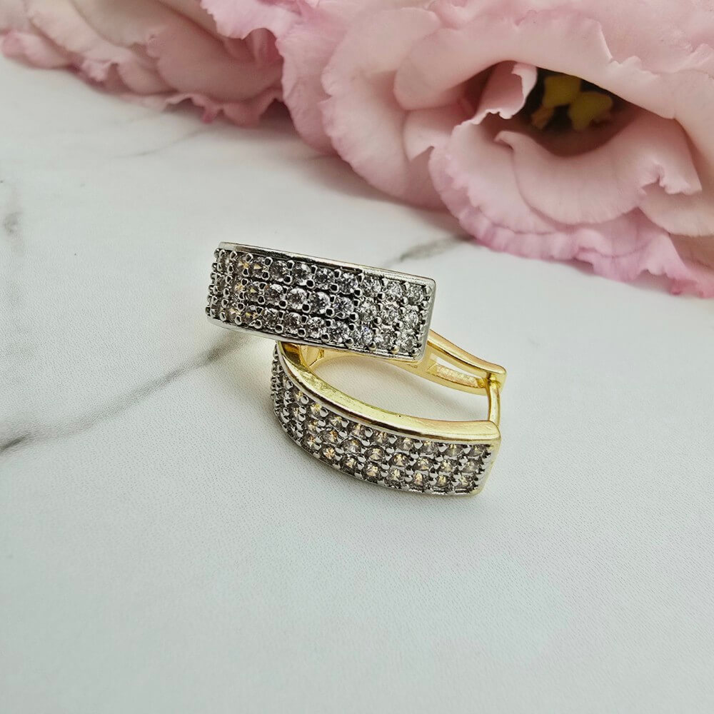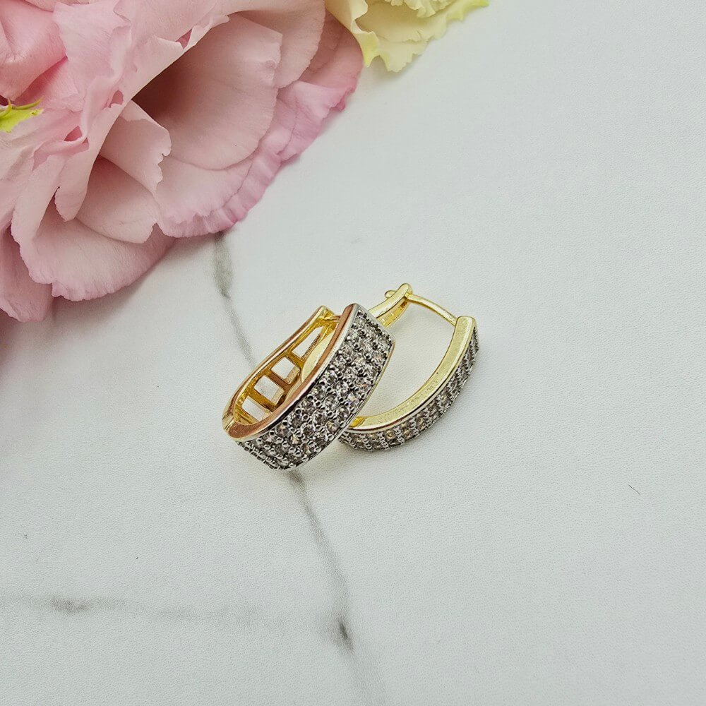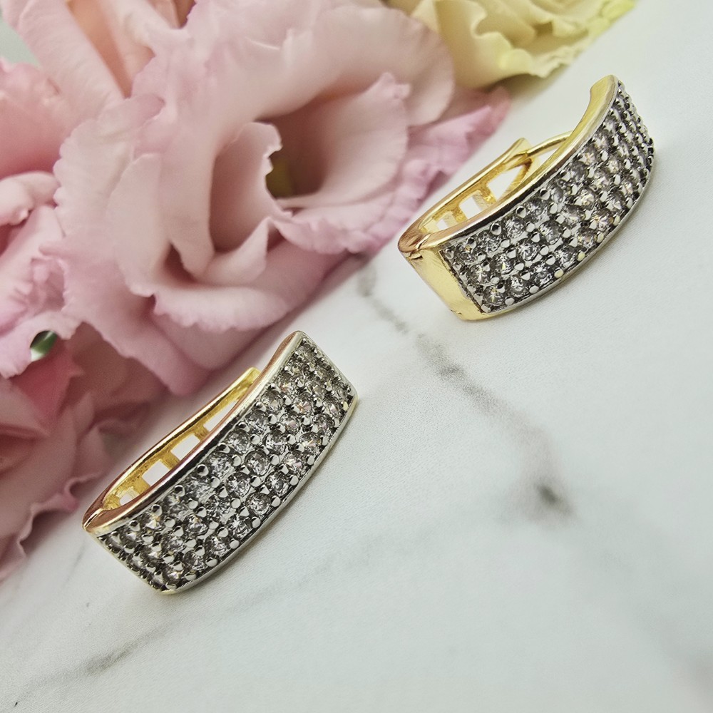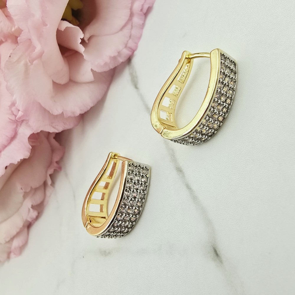 Bardzo popularny klasyczny wzór kolczyków w kształcie elipsy - ażurowy zaokrąglony element. Ten model jest szerszy z przodu u cały ozdobiony cyrkoniami jasnymi. Zapięcie zatrzaskowe bigiel. Jasny odcień złota.