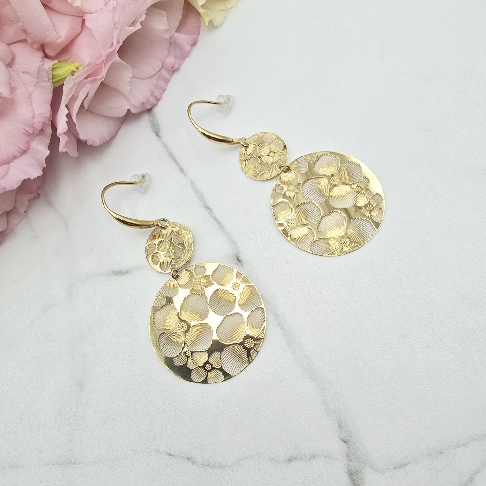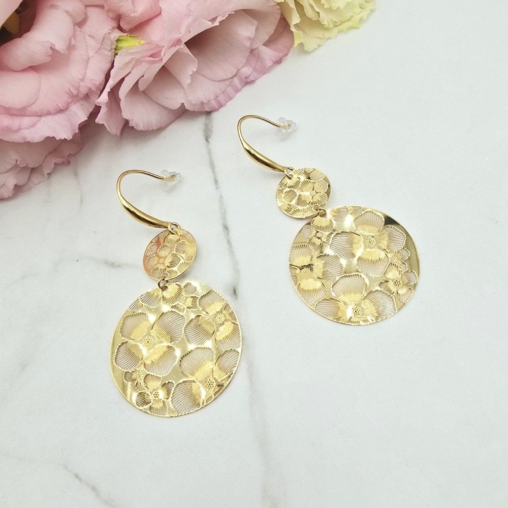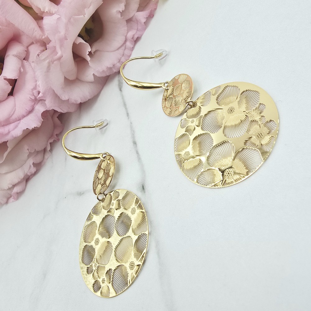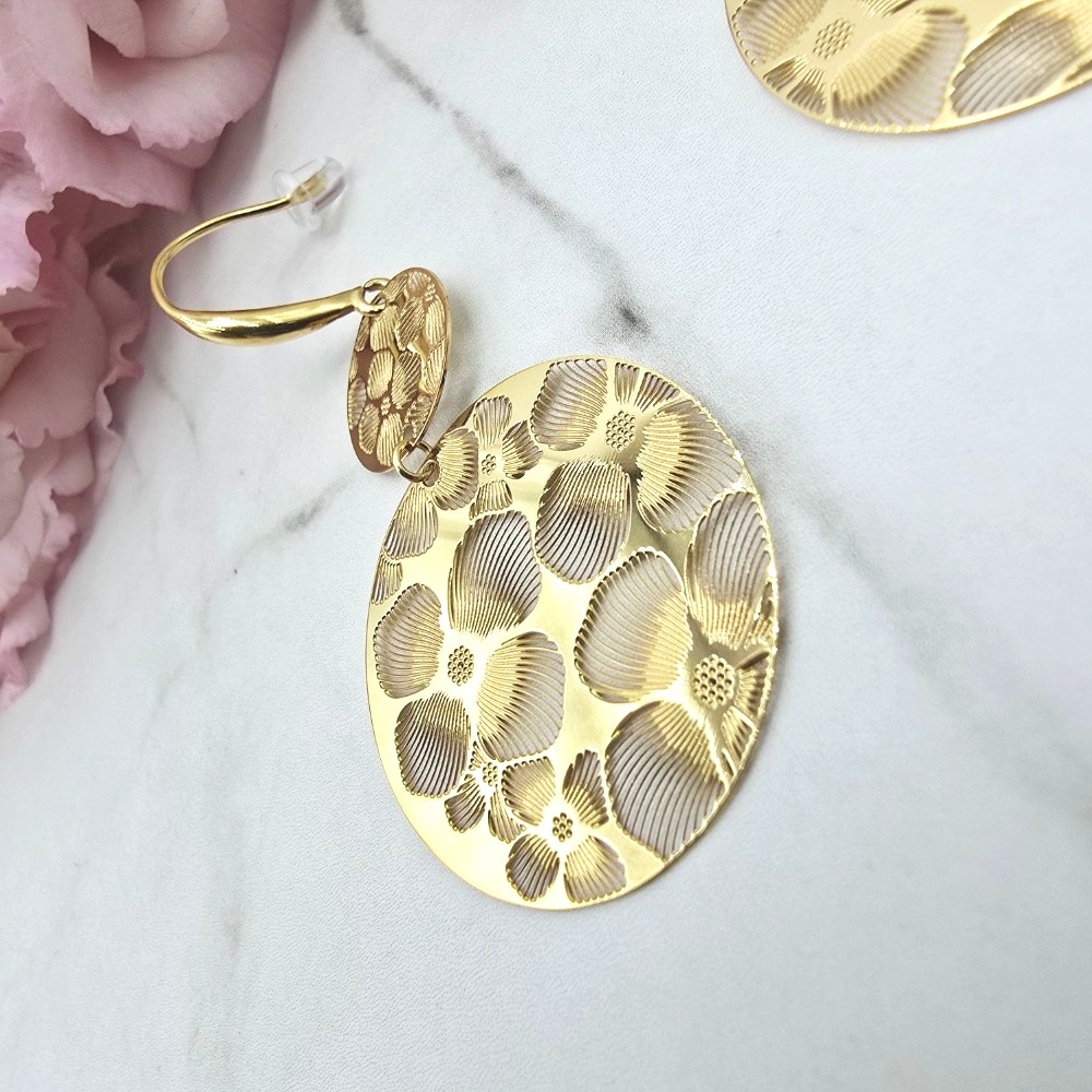 Kolczyki Stal Chirurgiczna wiszące kółka zdobione wzorem kwiatowym. Kolczyki wiszące dość duże ażurowe kółka. Bardzo efektowne kolczyki. Wiszą na haczyku przekładanym przez ucho. Kolczyki z kolekcji StaloweLOVE wykonane z wysokiej jakości stali chirurgicznej 316L w złotym kolorze.