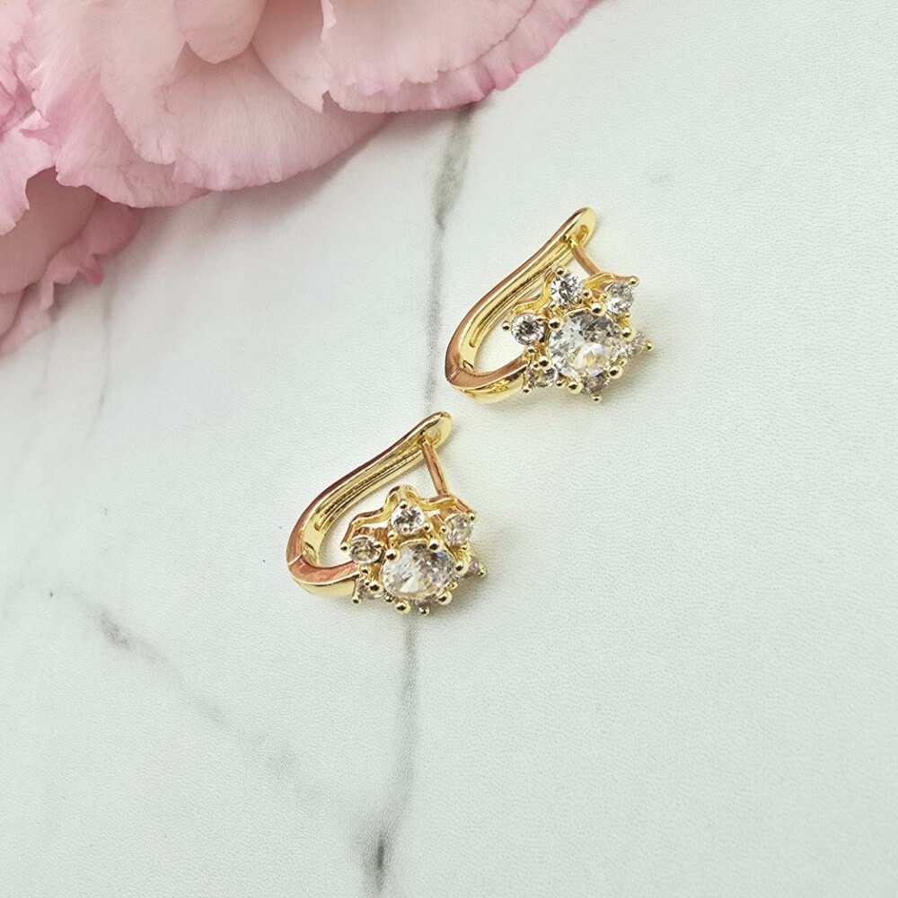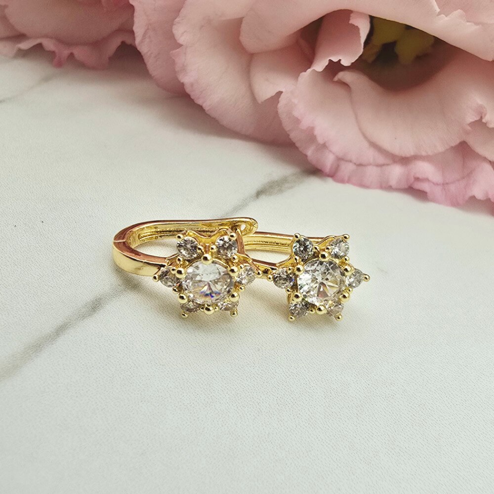 Cudowne i delikatne kolczyki ozdobione kwiatkiem wypełnionym kryształkiem i cyrkoniami. Zapięcie zatrzask bigiel. Bardzo efektowne kolczyki. Kolczyki z kolekcji StaloweLOVE wykonane z wysokiej jakości stali chirurgicznej 316L w jasno złotym kolorze.