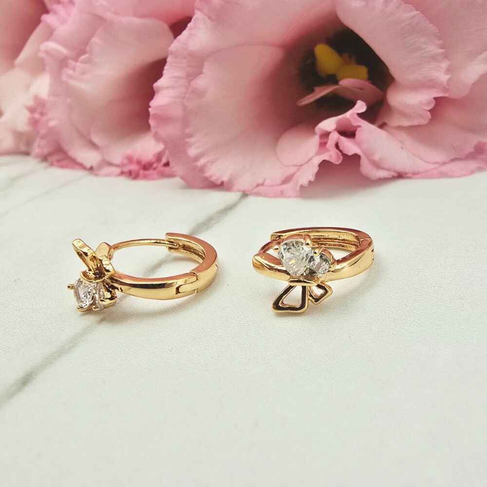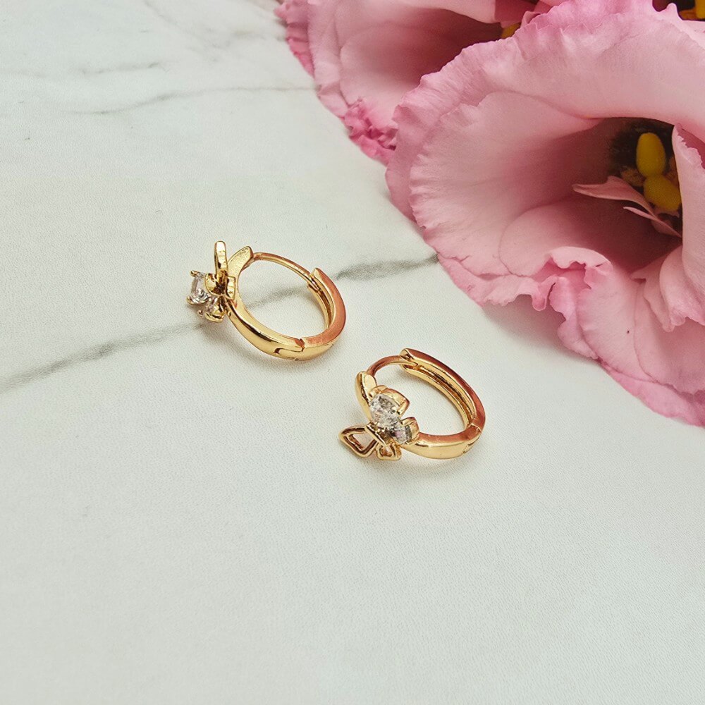 Wzór w kształcie motylka. Delikatne kolczyki średniej wielkości. Wielkość motylka ok 0,8 cm, bigiel średnicy ok 1,3 cm.