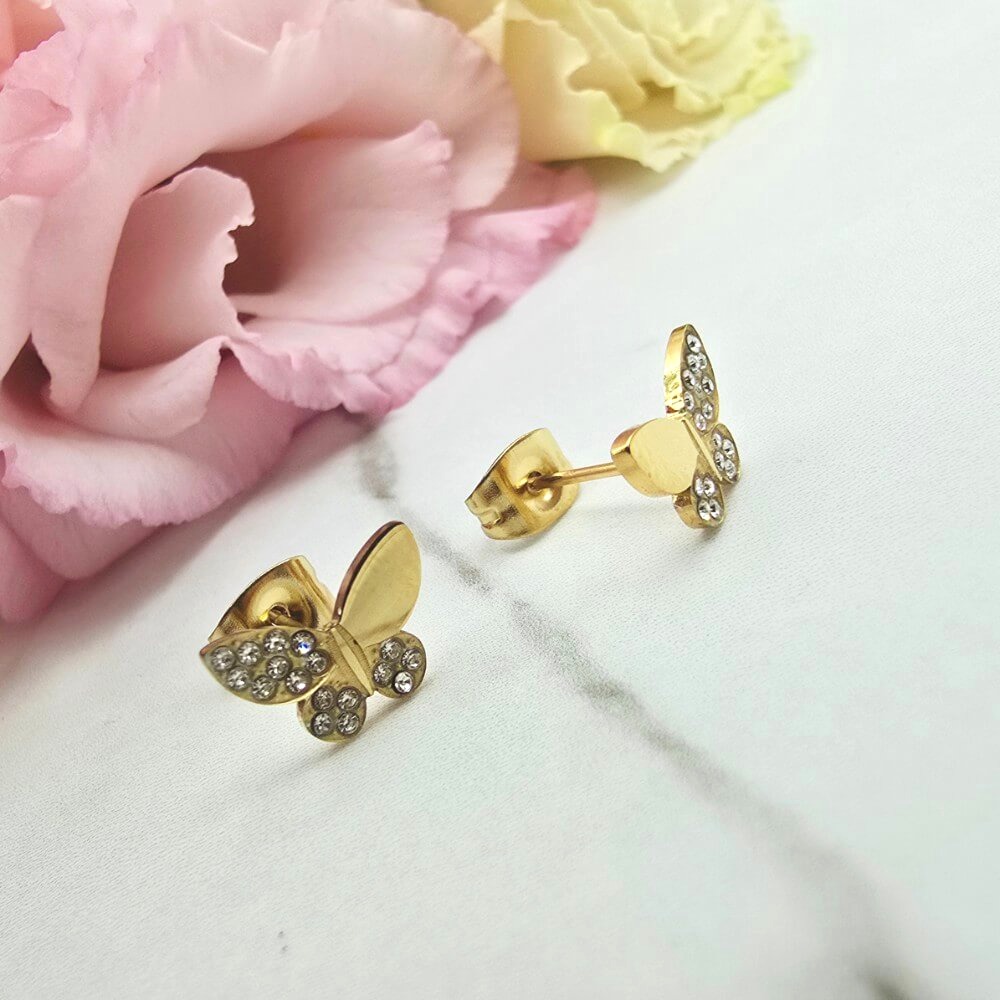 Klasyczny wzór kolczyków dla dziewczynek delikatny motylek ozdobiony cyrkoniami. Cudowne wzory i wysokiej jakości delikatne kolczyki są idealnym prezentem dla małych księżniczek! Pierwsze kolczyki dla dziewczynek zawsze powinny być ze stali chirurgicznej, która jest bezpieczna - nie uczula! Biżuteria jest antyalergiczna. Swój blask i kolor zachowa przez długi czas!! Cudowna jakość wykonania.