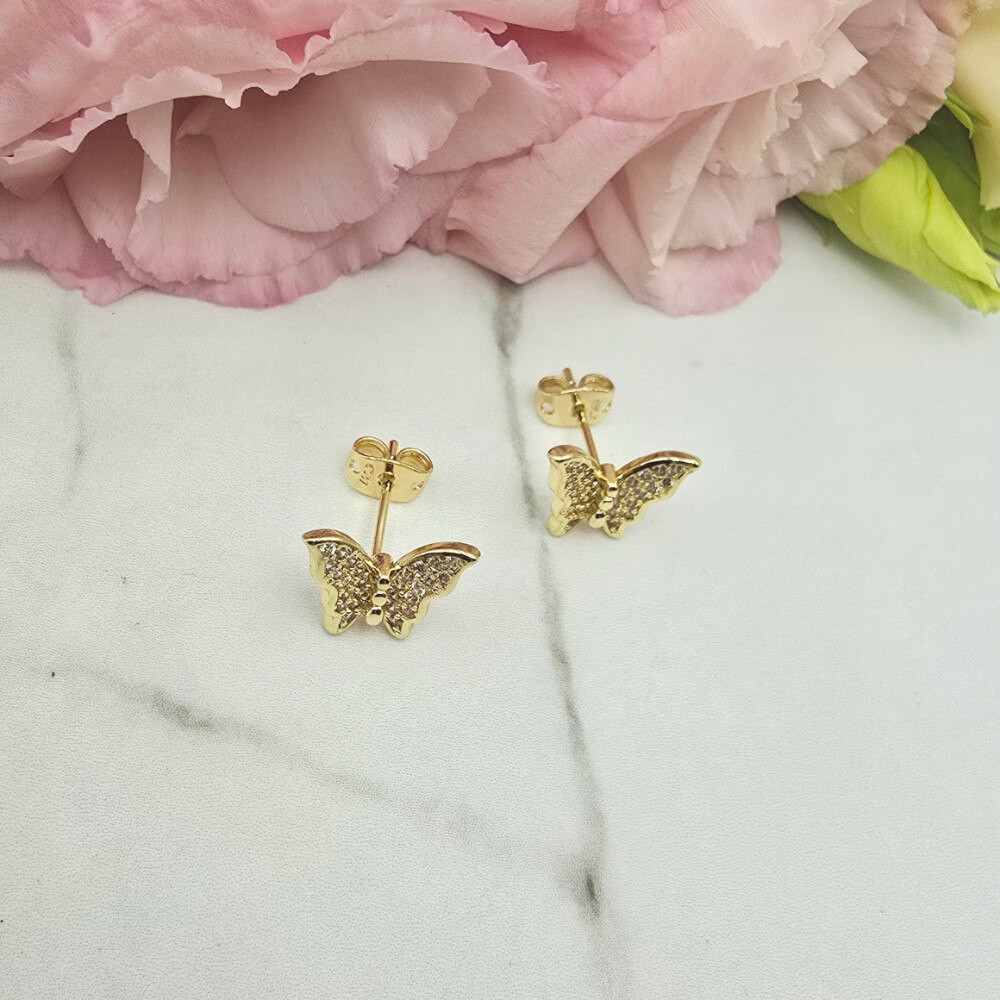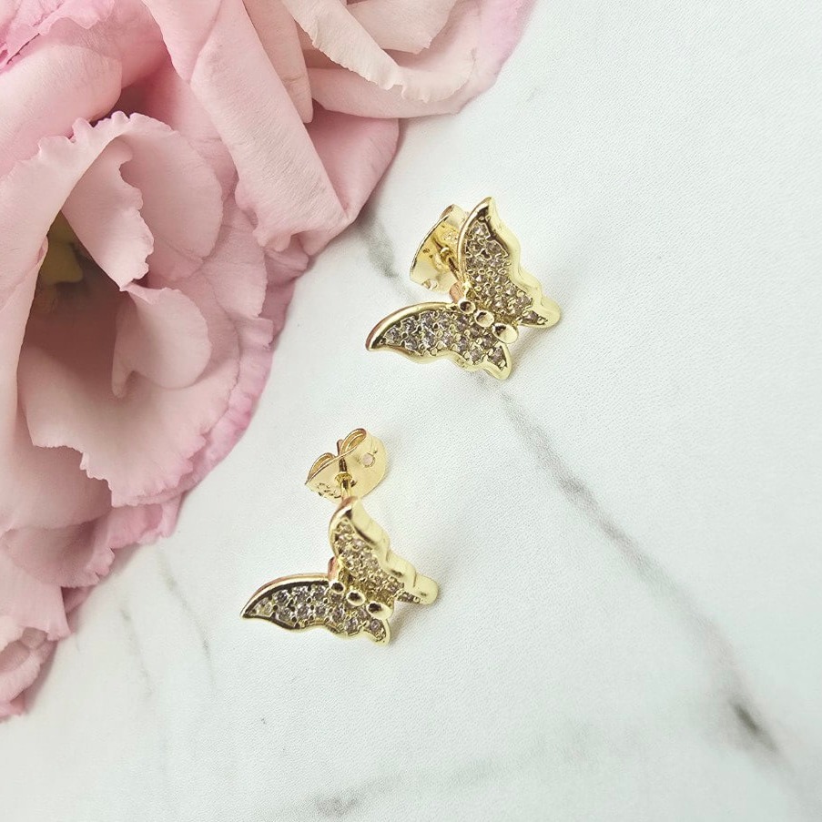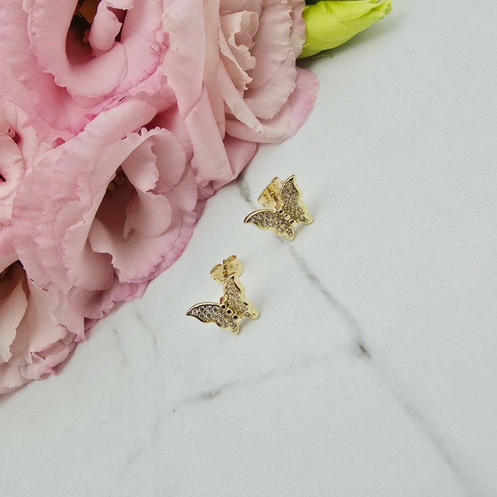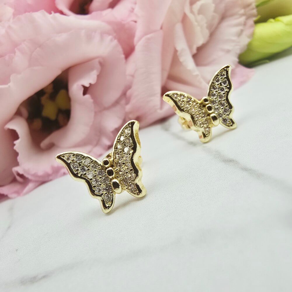 Piękne kolczyki w kształcie efektownych motylków ozdobionych w całości cyrkoniami. Kolczyki z kolekcji StaloweLOVE w kolorze jasno złotym.