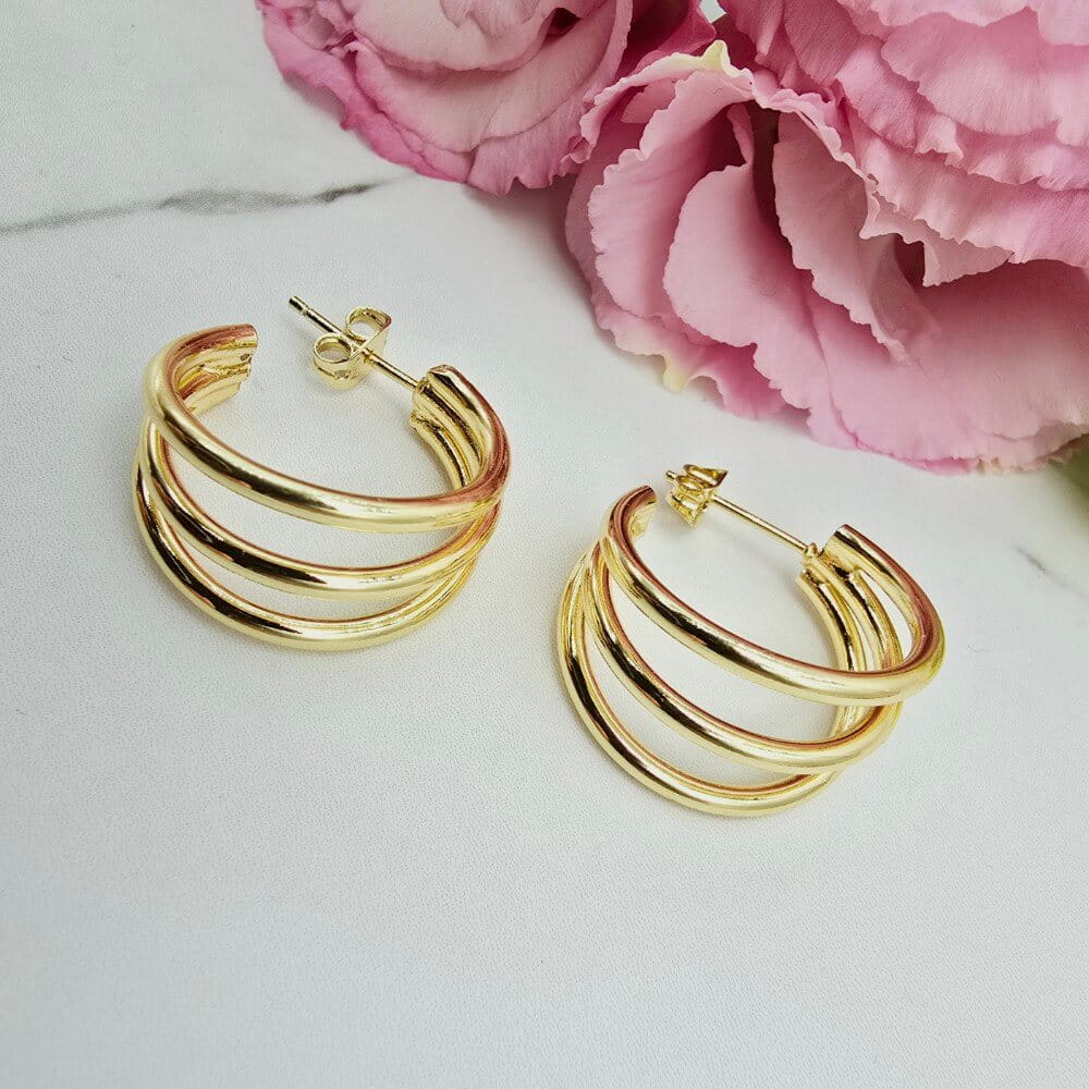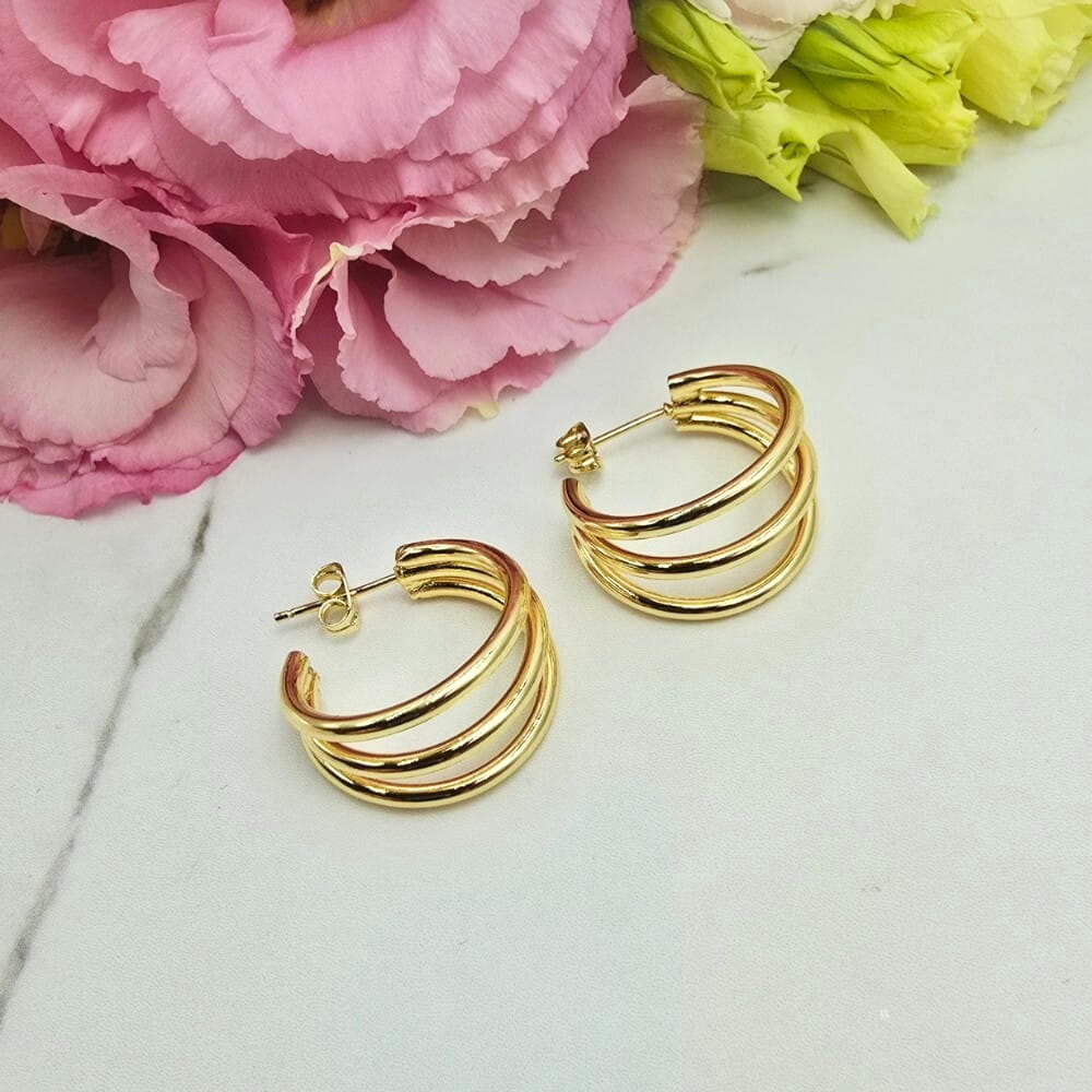 Wzór w kształcie potrójnego kółka. Kolczyki wspaniałej jakości o niebanalnym wzorze. Wielkość 2 cm. Jasne złoto. Zapięcie klasyczny sztyft.