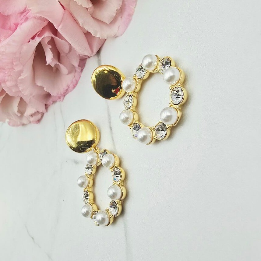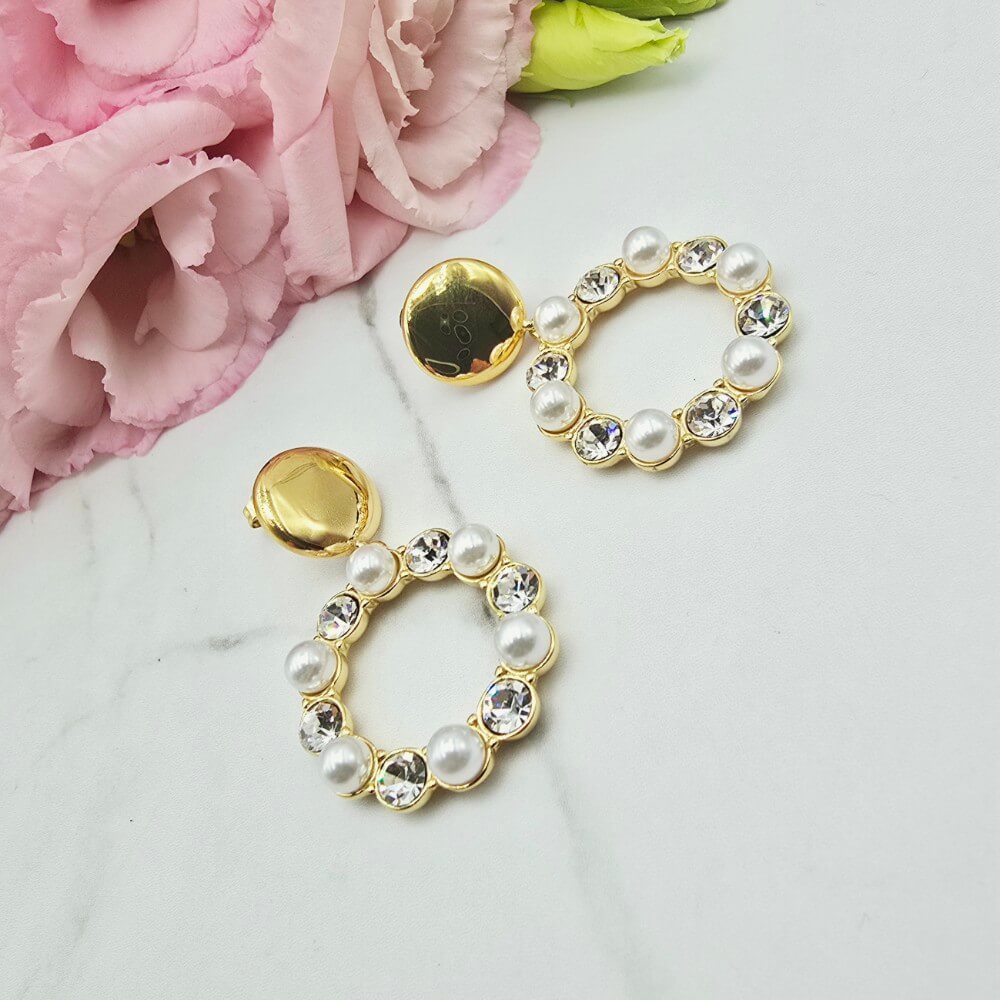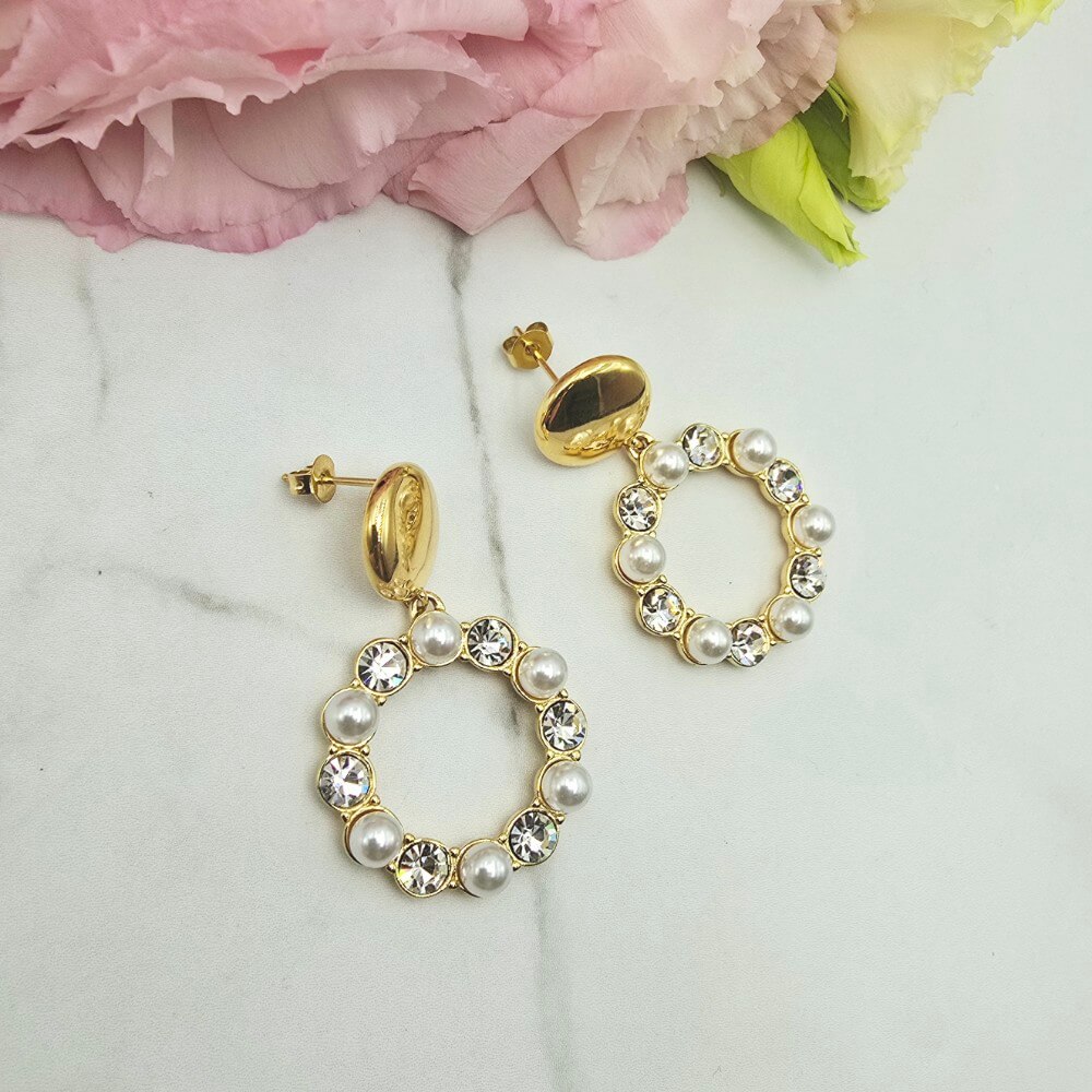 Piękne kolczyki składające z wiszącego ażurowego kółka ozdobionego na przemian perełkami i kryształkami. Kolczyki z kolekcji StaloweLOVE wykonane z wysokiej jakości stali chirurgicznej 316L zwanej również stalą nierdzewną/szlachetną która: nie zmienia koloru, nie reaguje z wodą i nie uczula!!