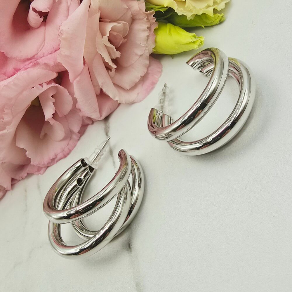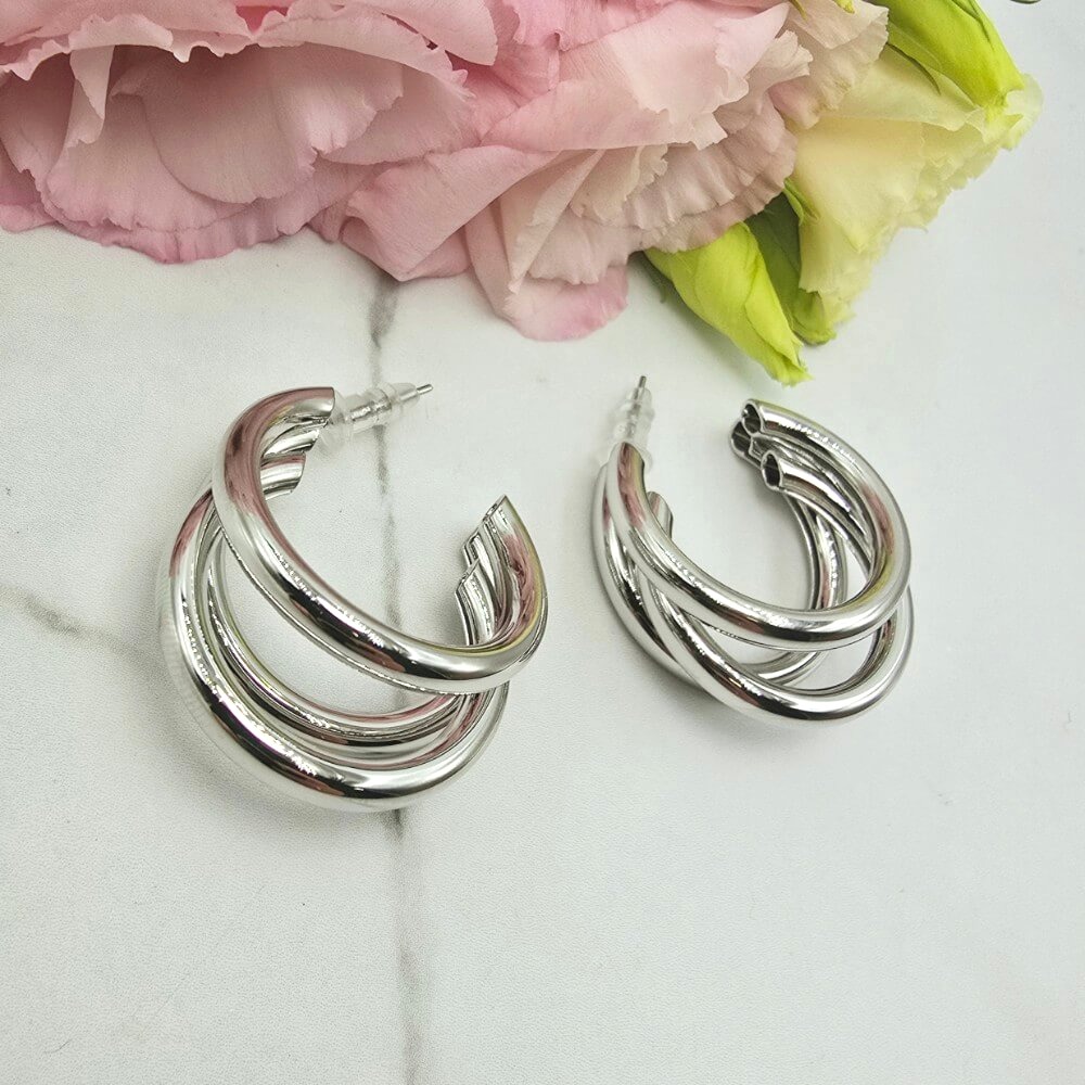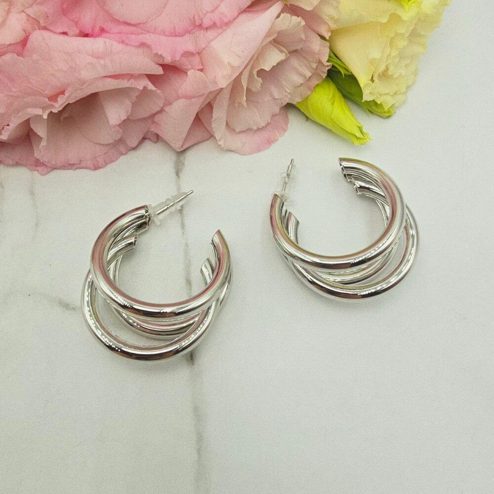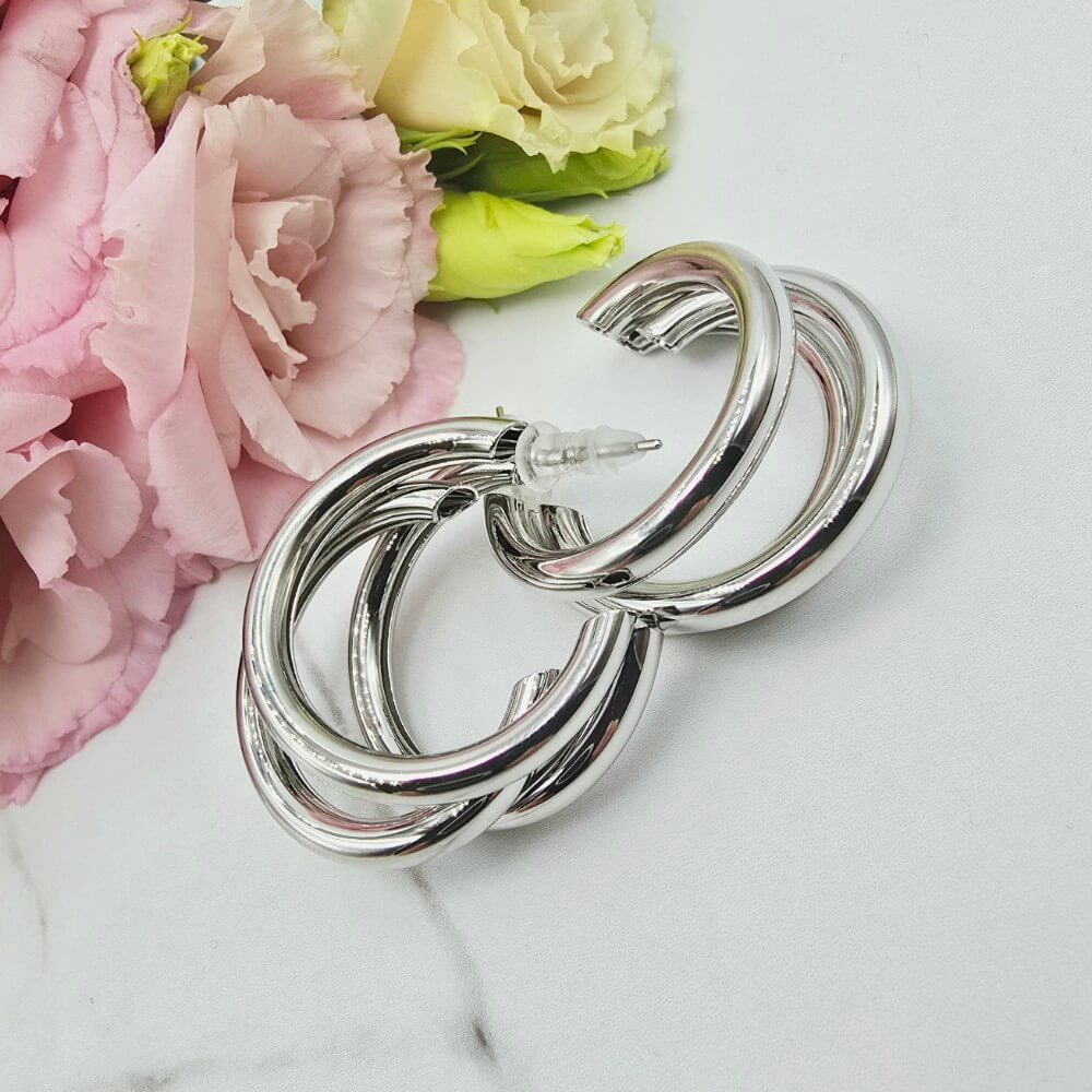 Wzór w kształcie potrójnego kółka. Kolczyki wspaniałej jakości o niebanalnym wzorze. Wielkość 3 cm. Srebrny kolor. Zapięcie klasyczny sztyft.