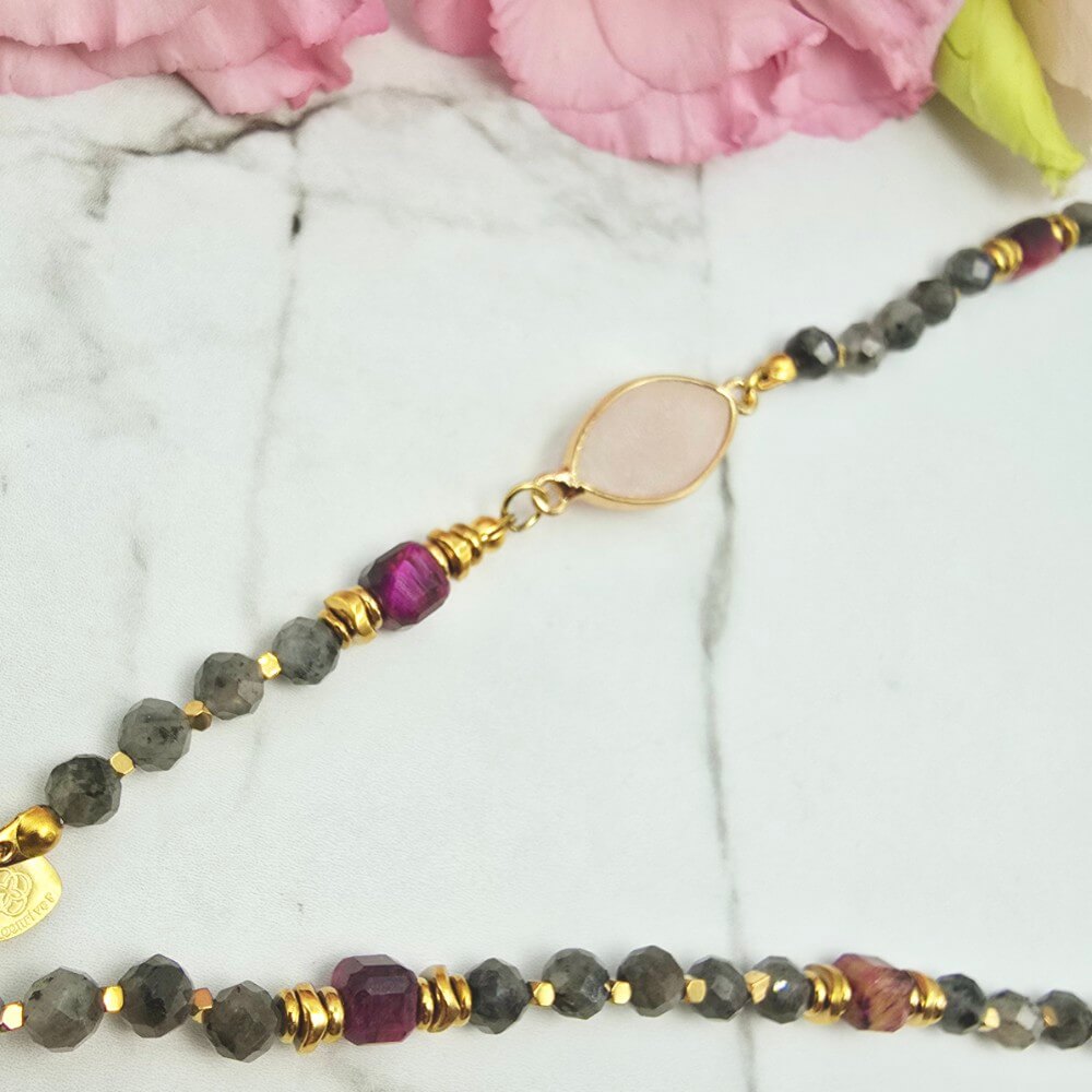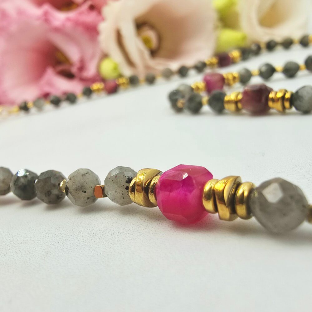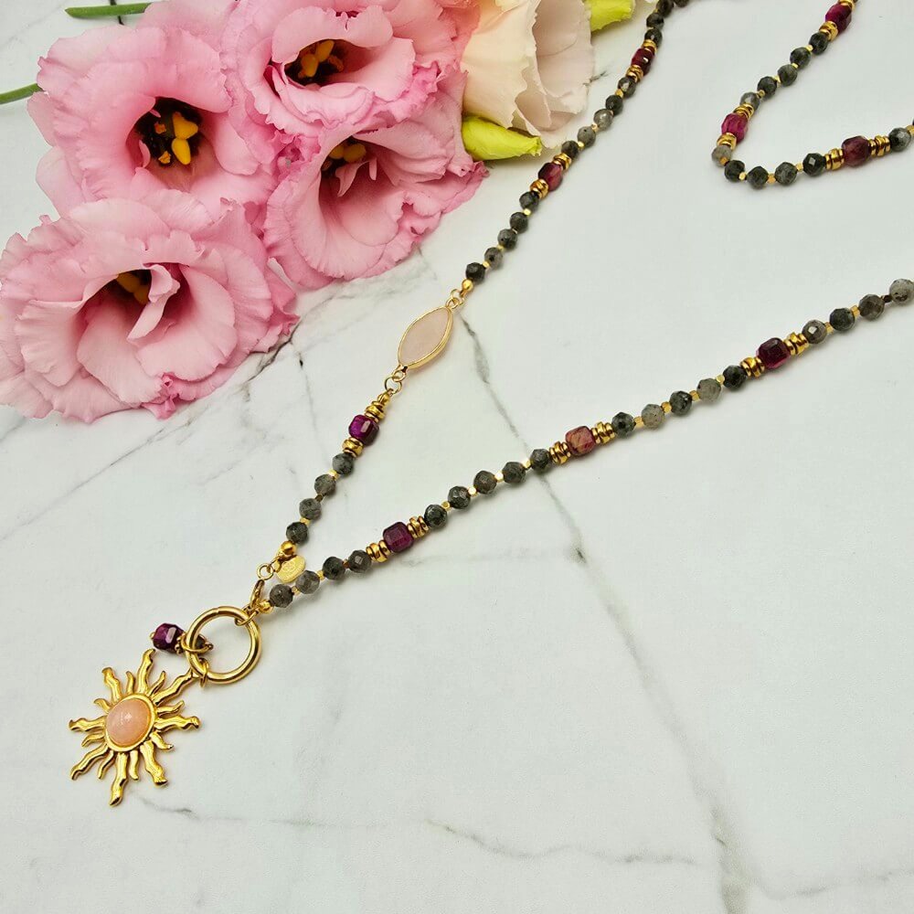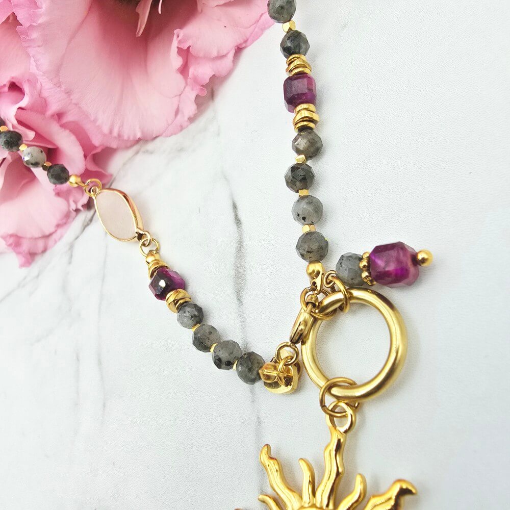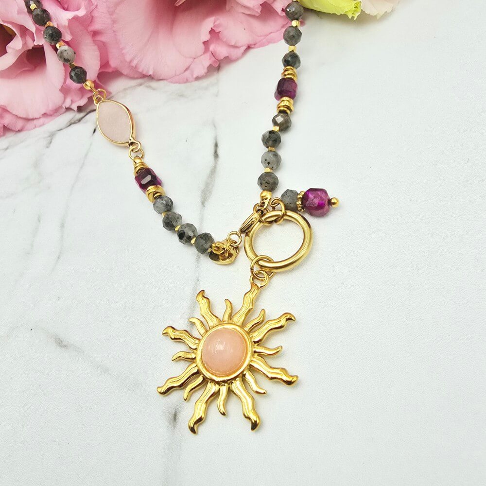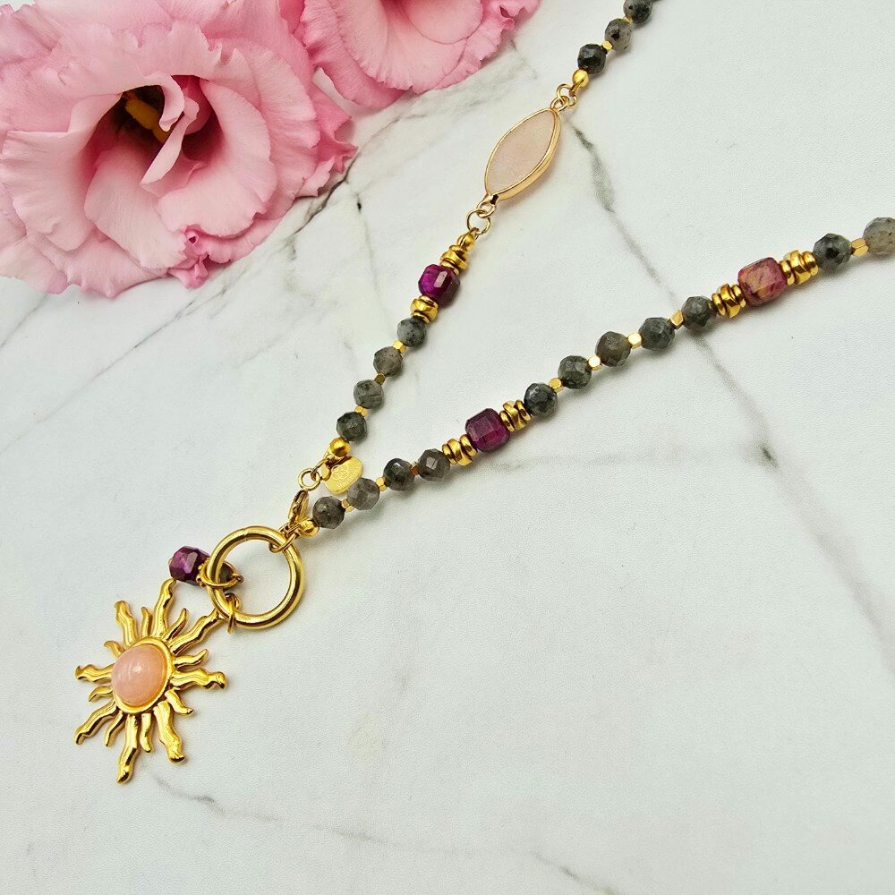 Wyjątkowy naszyjnik z kolekcji PREMIUM ozdobiony kamieniami w ciemnym odcieniu przedzielanymi złotymi elementami. Główna przywieszka słońce ze stali chirurgicznej w środku z różowym kamieniem. Z boku także większy różowy kamień. Cudownie prezentuje się na szyi. Super popularny wzór na ten sezon wiosna-lato. Dodaj sobie koloru i zmysłowości do swoich stylizacji! Extra jakość PREMIUM!