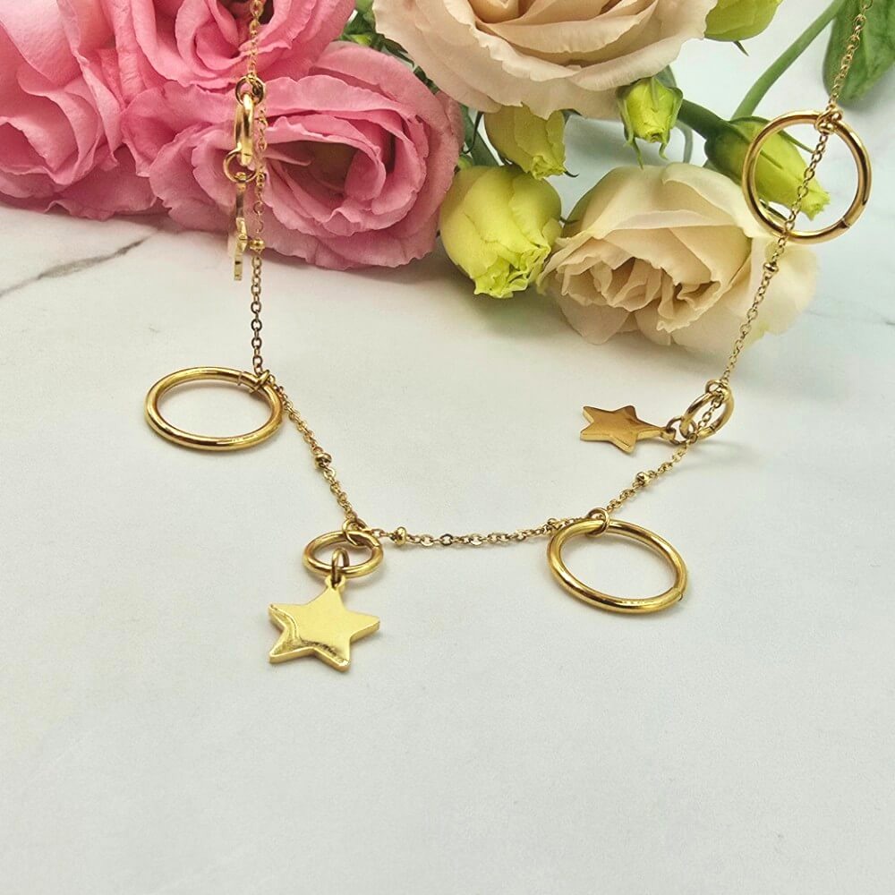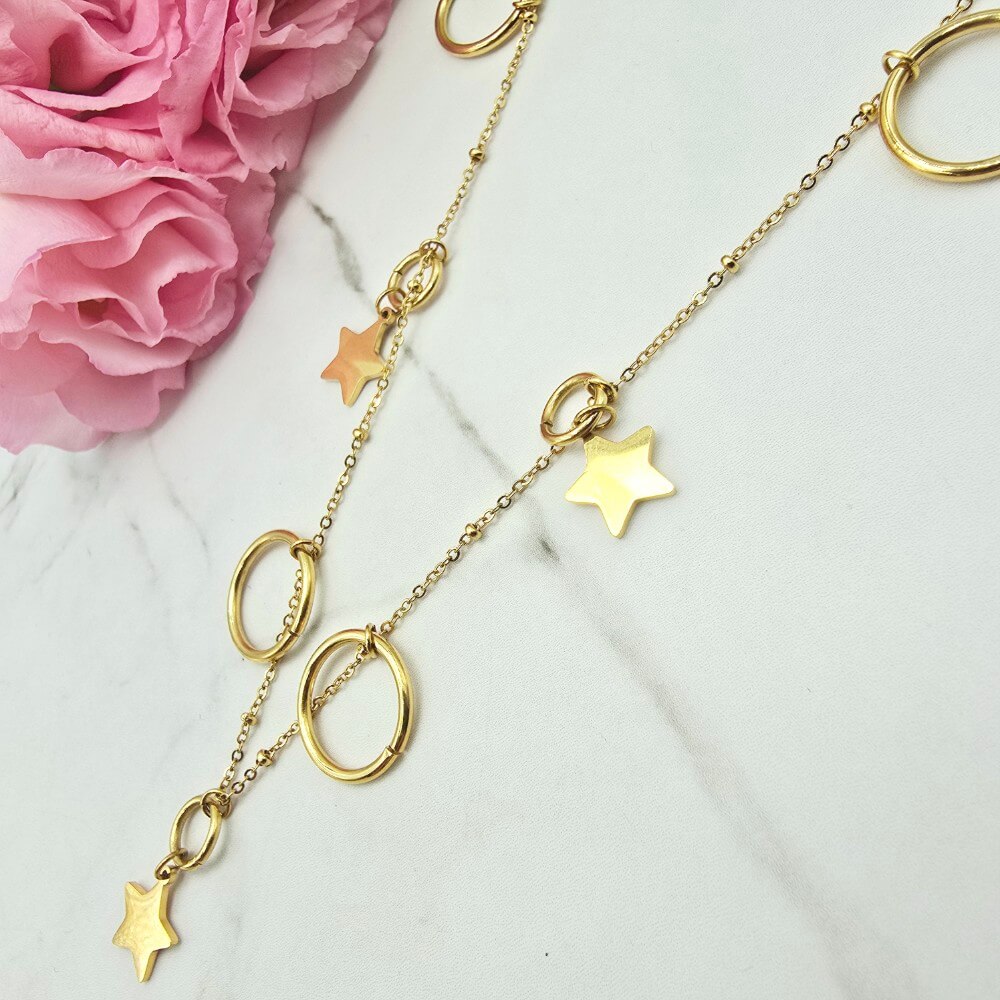 Świetny klasyczny naszyjnik Celebrytka z przywieszkami gwiazdki i kółka. Całość wykonana ze stali chirurgicznej.