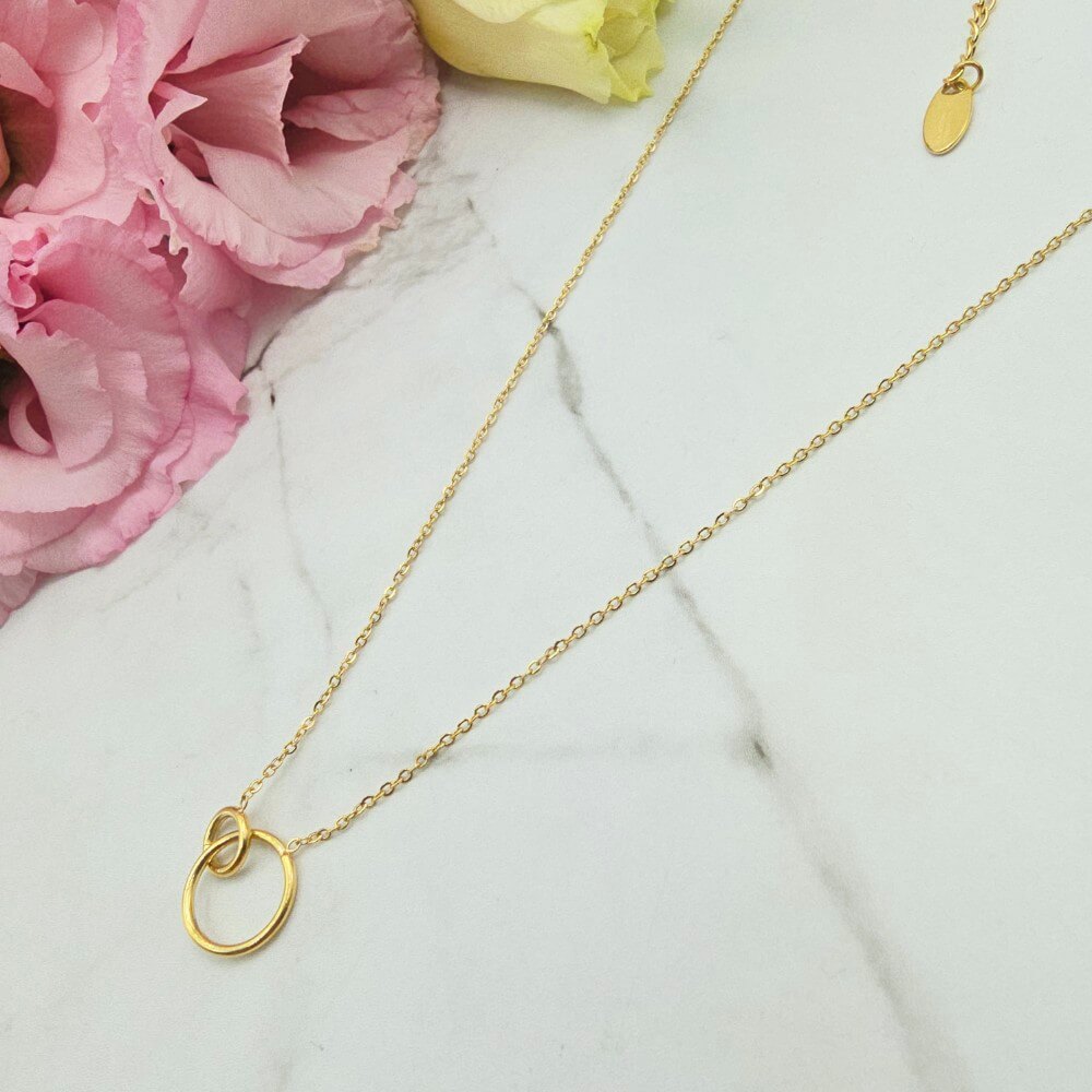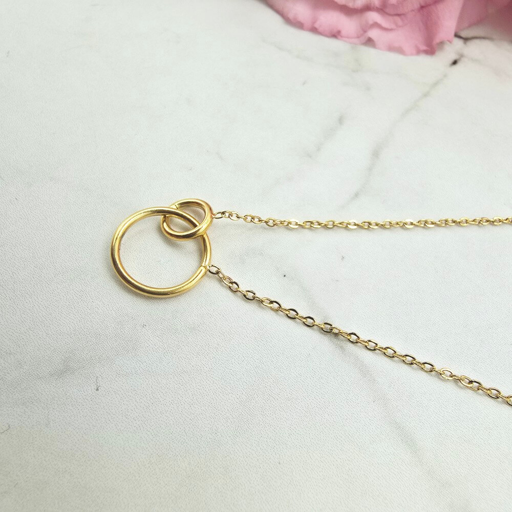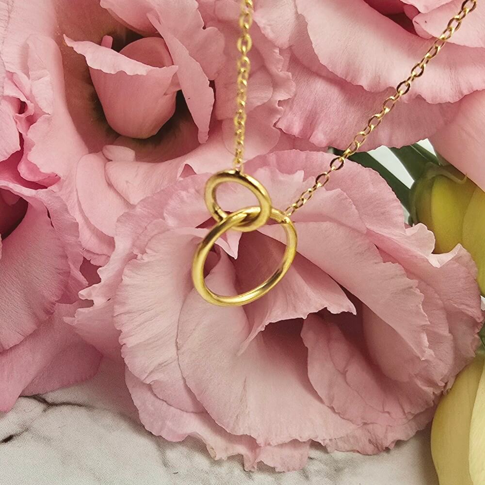 Naszyjnik z przywieszką w kształcie dwóch połączonych ze sobą delikatnych kółeczek ażurowych. Cudownie prezentuje się na szyi. Klasyk do którego łatwo można dobrać inną biżuterię z motywem kółka. Bardzo delikatny i zmysłowy model.