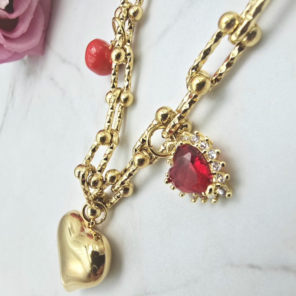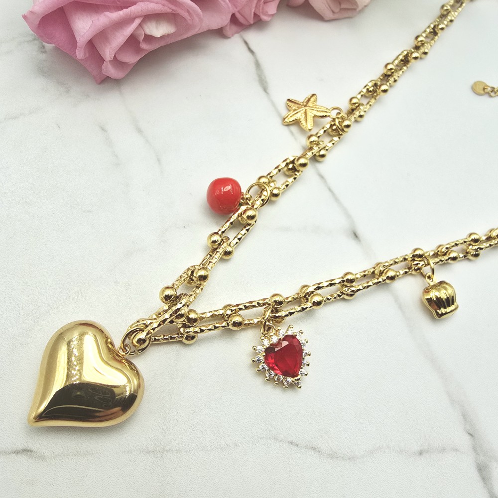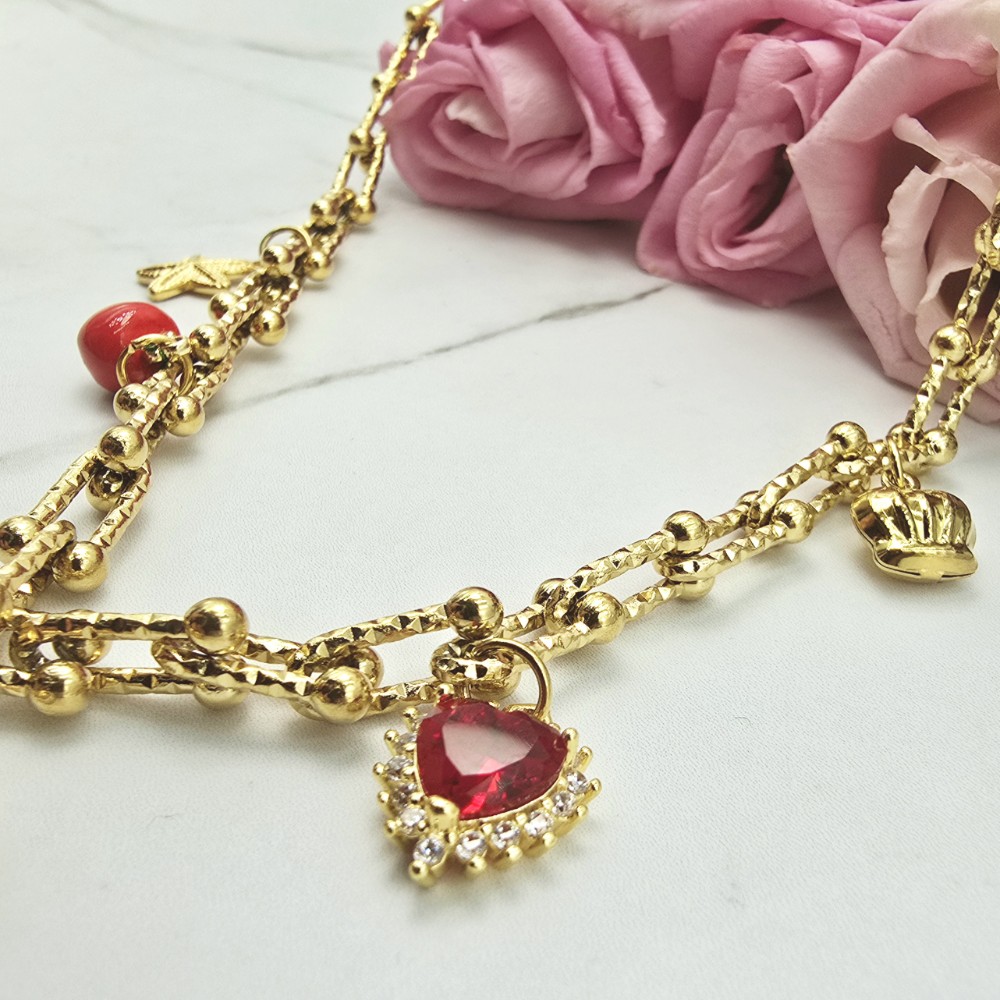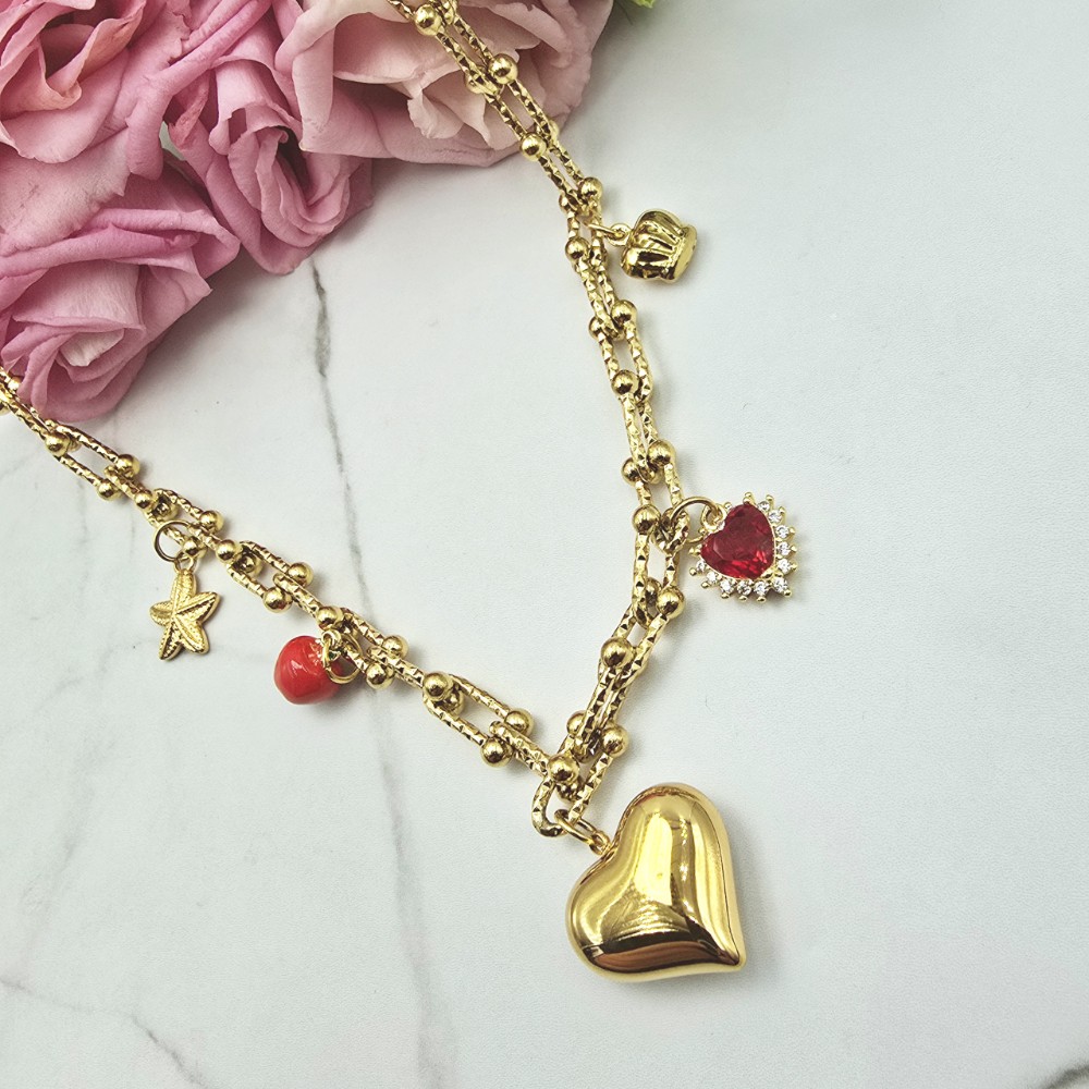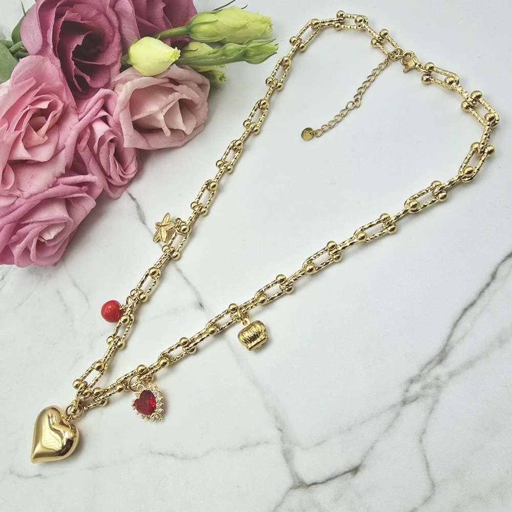 Wyjątkowy grubszy splot łańcuszka na środku złote serce a po bokach przywieszki serce czerwony kryształ, gwiazdki i inne. Pięknie prezentuje się na szyi.
