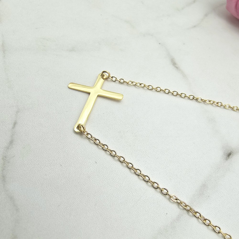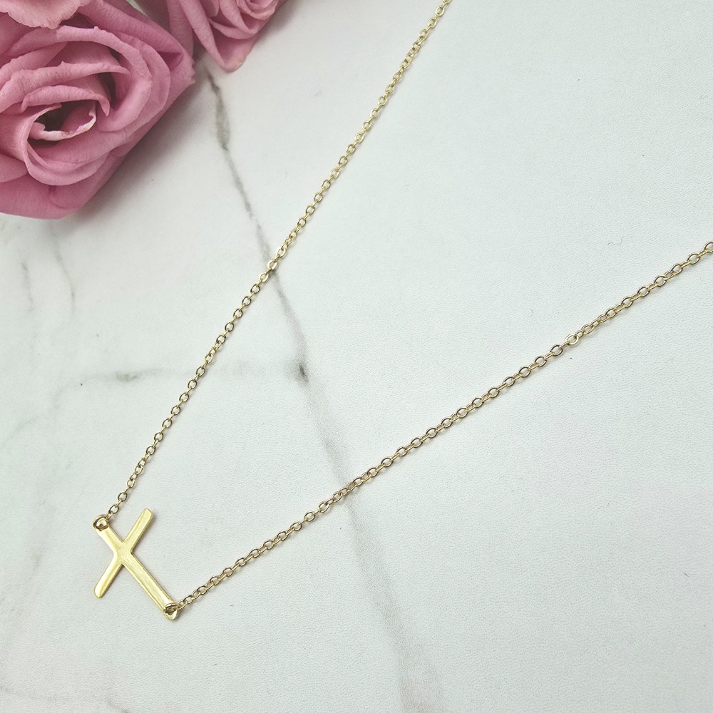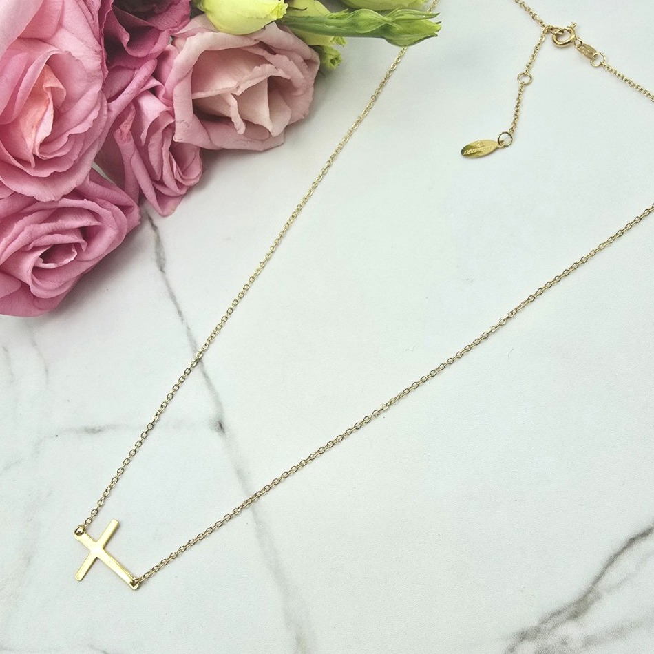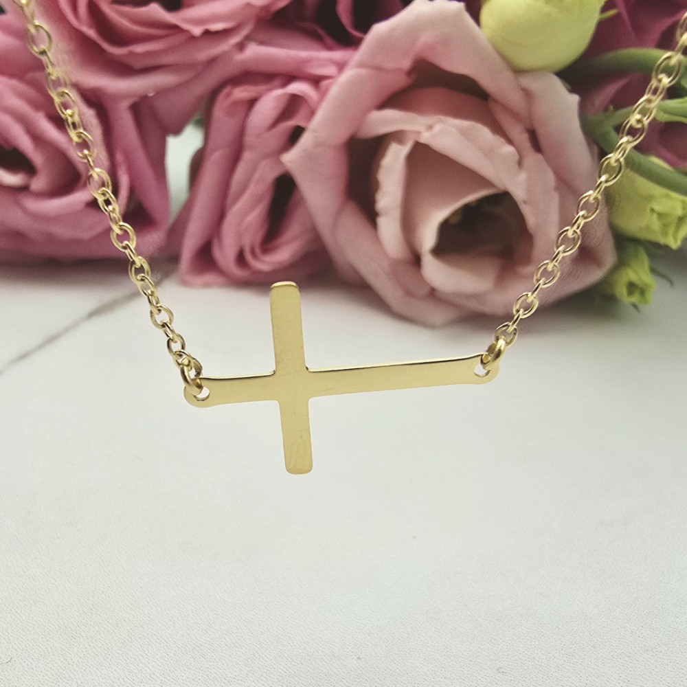 Naszyjnik z przywieszką w kształcie krzyżyka osadzonego w poziomie na łańcuszku w złotym kolorze. Cudownie prezentuje się na szyi. Super popularny wzór wśród celebrytek!! Dobierz kolczyki lub bransoletkę i stwórz swój ulubiony zestaw!!