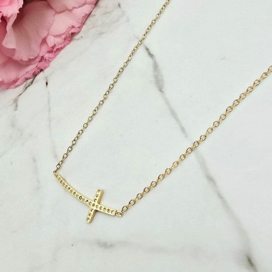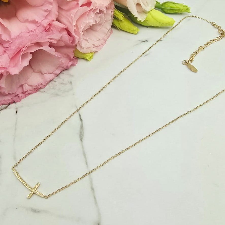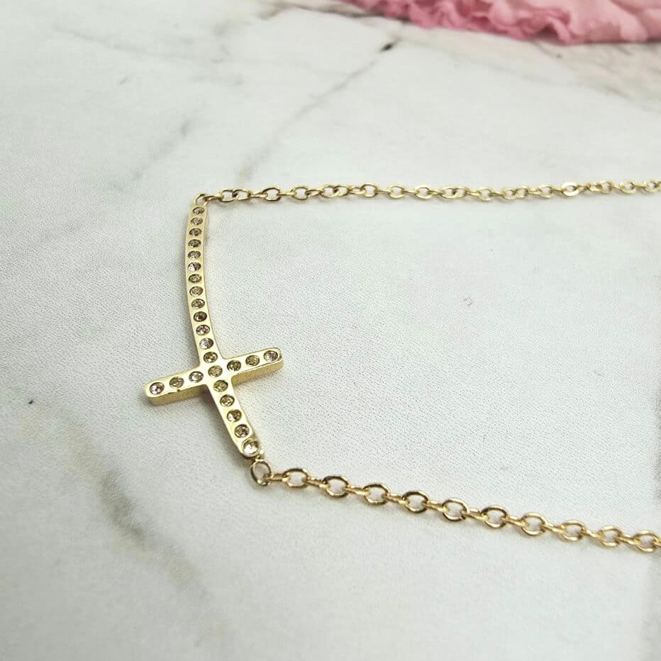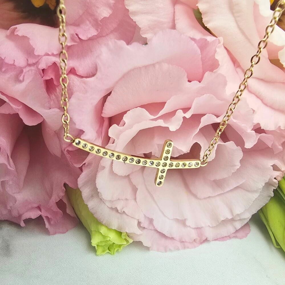 Naszyjnik złoty z przywieszką medalionem w kształcie lekko zakrzywionego krzyża średniej wielkości zamocowanego poziomo na łańcuszku. Krzyżyk wypełniony jasnymi cyrkoniami. Przywieszka krzyżyk symbol ducha i materii, czterech stron świata, osi świata, nieśmiertelności, życia, zwycięstwa nad śmiercią, potęgi, zdolności twórczej. Cudownie prezentuje się na szyi, bardzo popularny wzór!!