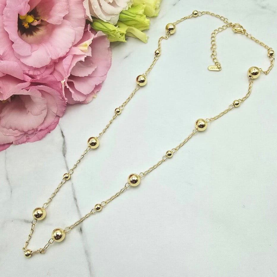 Świetny naszyjnik z kolekcji StaloweLOVE PREMIUM wykonany ze stali chirurgicznej składający się dwóch wielkości złotych kuleczek 0,6 i 0,4 cm. Naszyjnik cudownie prezentuje się do eleganckich kreacji wieczorowych lub codziennych sukienek bądź sweterków. Bardzo popularny wzór tego sezonu - złote kuleczki. Jaśniejszy odcień złota.