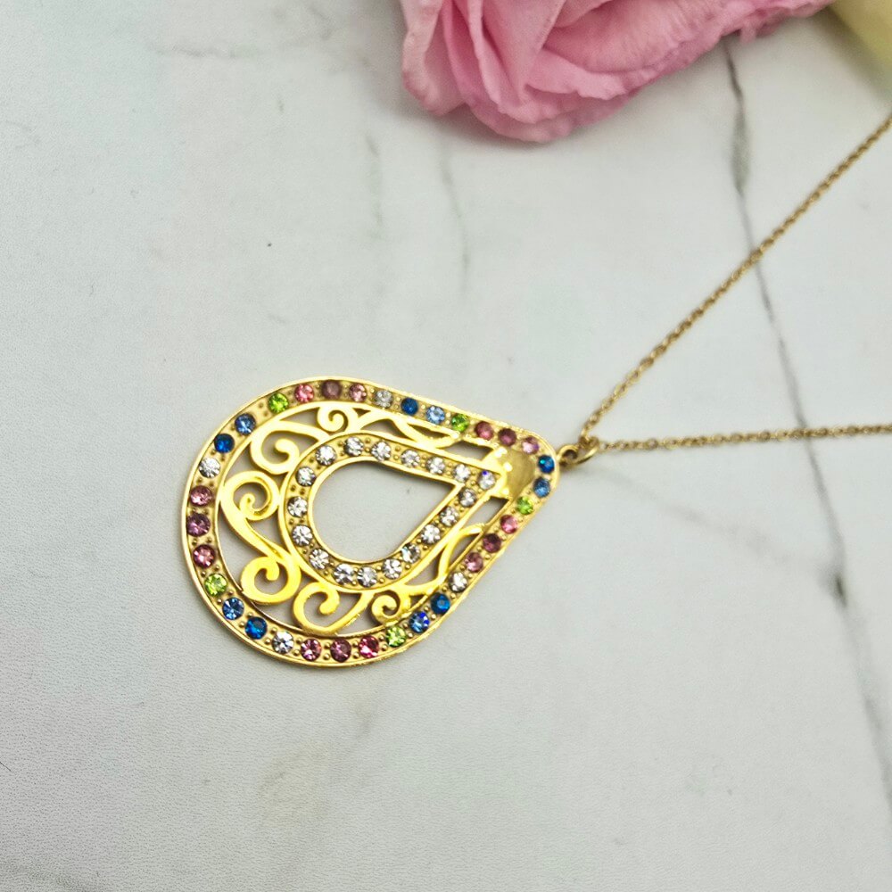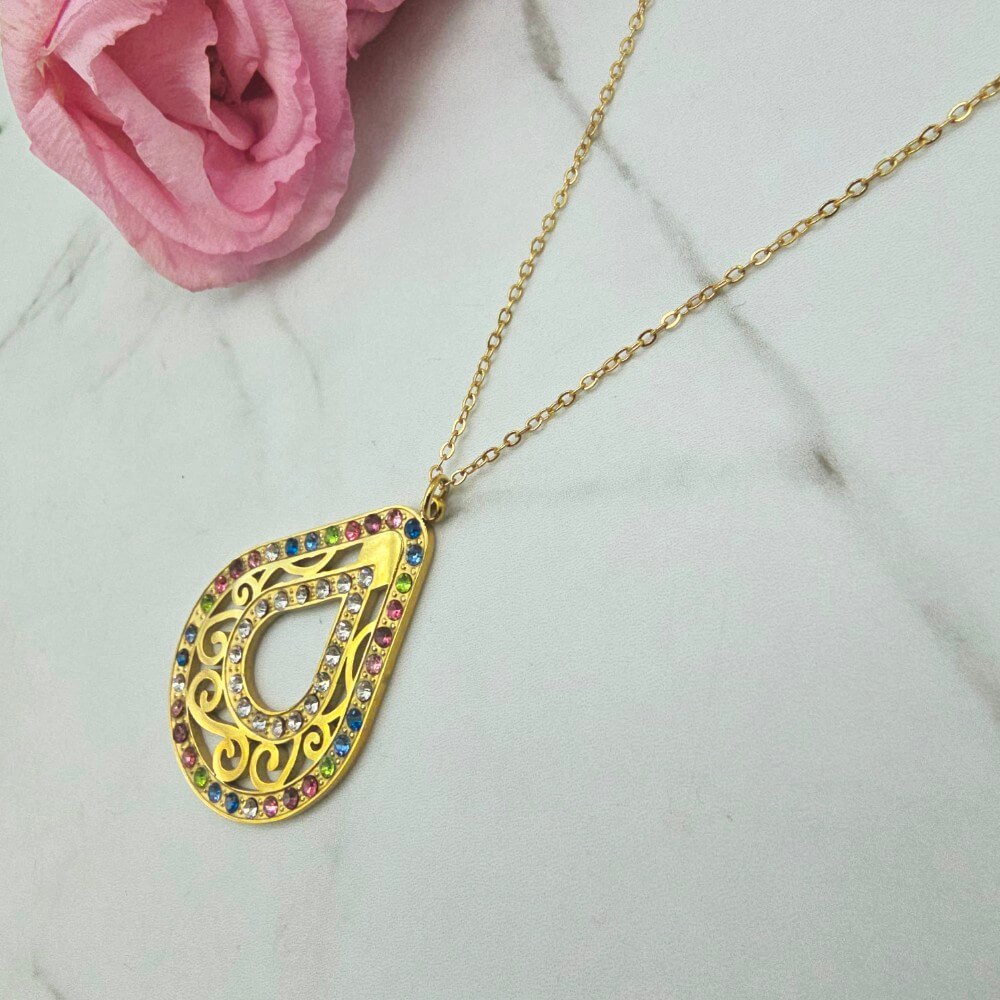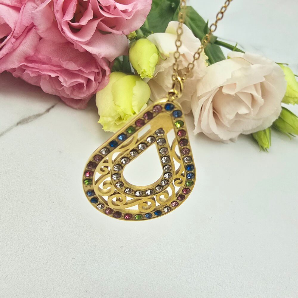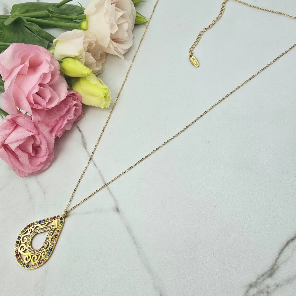 Naszyjnik z przywieszką w kształcie owalnego ażurowego medalionu ozdobionego kolorowymi cyrkoniami. Cudownie prezentuje się na szyi. Super jakość wykonania. Extra pomysł na prezent.