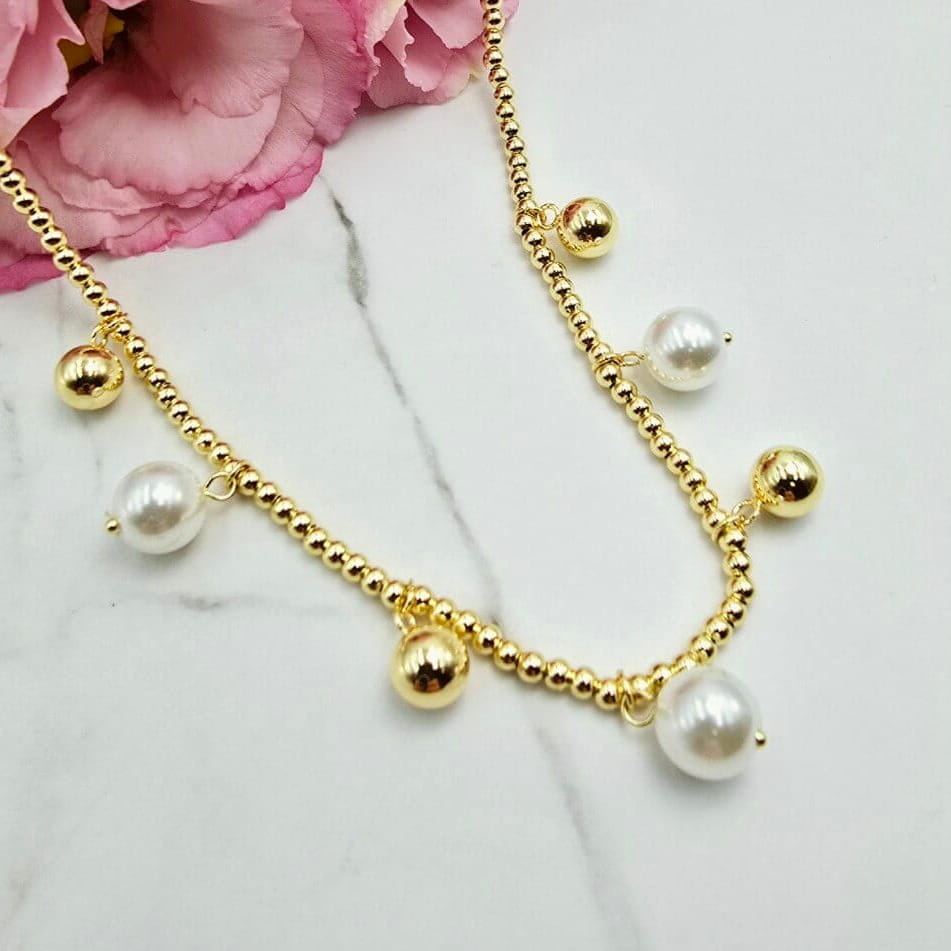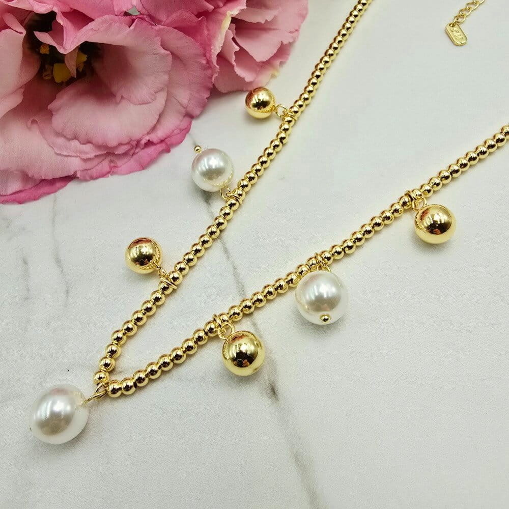 Bardzo modny model naszyjnika składający się z białych perełek i kilku większych złotych kuleczek ze stali chirurgicznej. Naszyjnik cudownie prezentuje się to eleganckich kreacji wieczorowych lub codziennych stylizacji. Bardzo popularny wzór tego sezonu - perły zawsze ponad czasowe!