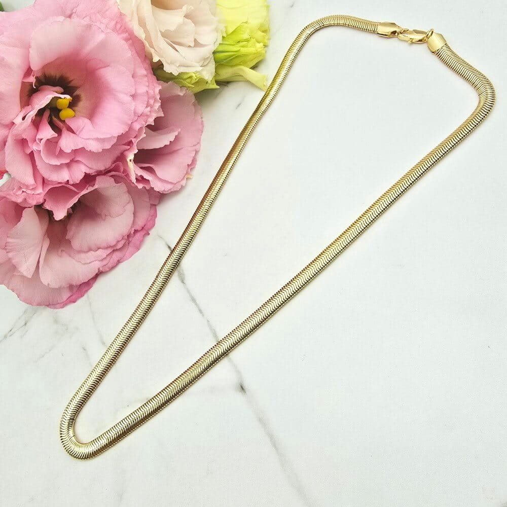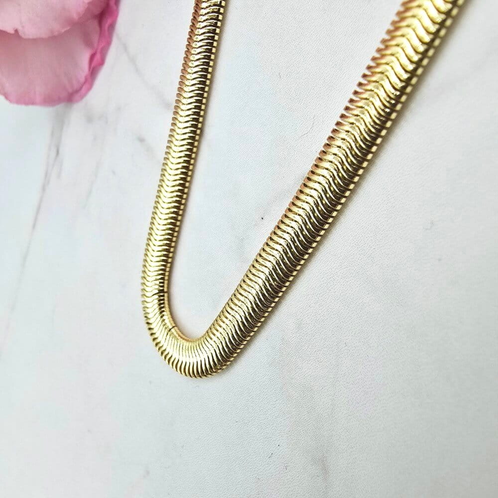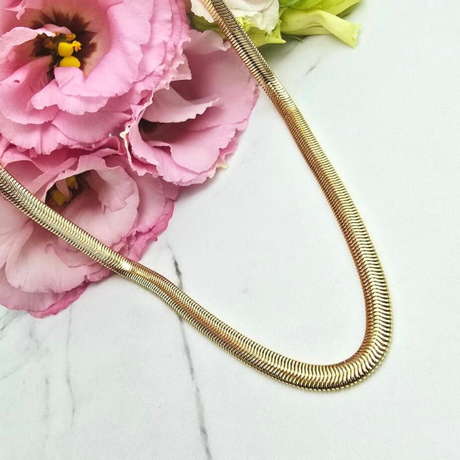 Naszyjnik bez przywieszek splot żmijka średnia długość 45 cm, bez regulacji. Szerokość łańcuszka ok. 0,5 cm. Jasny odcień złota.
