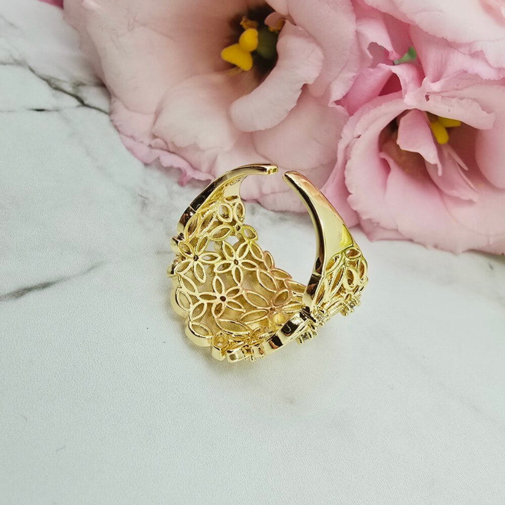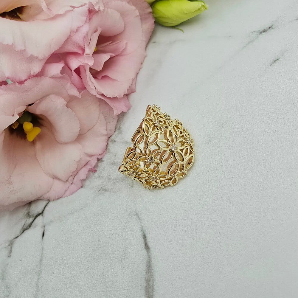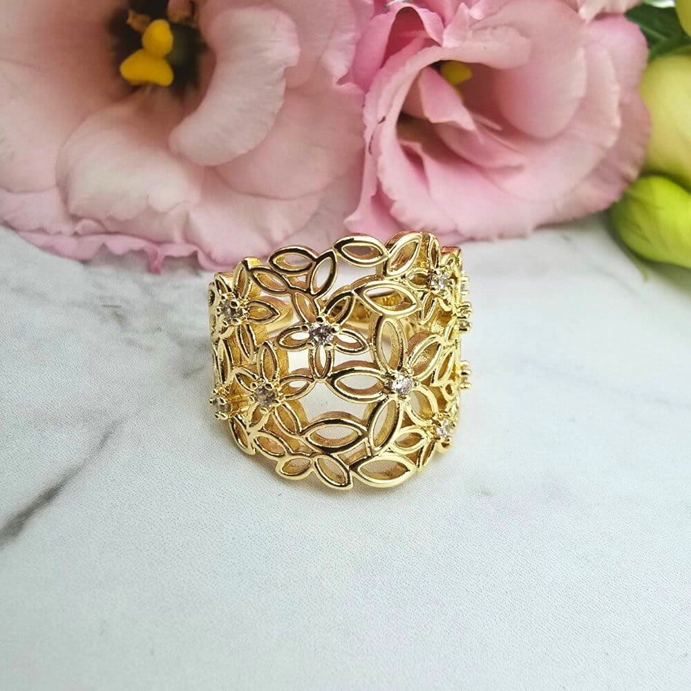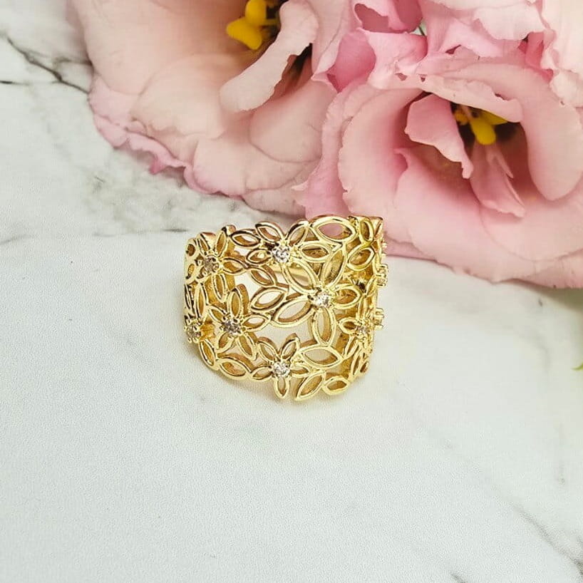 Super popularna obrączka uniwersalna (można dostosować do swojego palca poprzez delikatne dogięcie). Pierścionek w całości wykonany ze stali chirurgicznej. Pierścionek ażurowe kwiatki i cyrkonie. Pierścionki uniwersalne dzięki temu że można je dostosować do każdego palca będą hitem także tego sezonu wiosna-lato!!