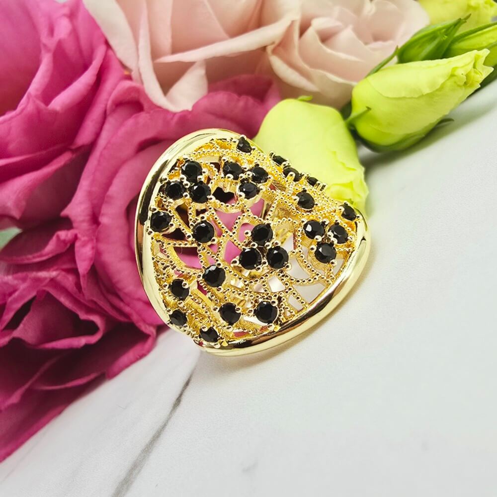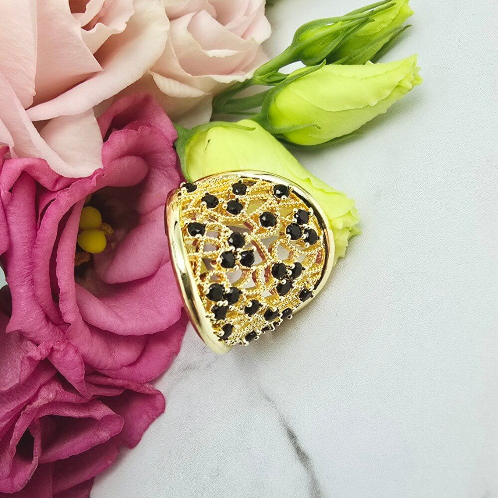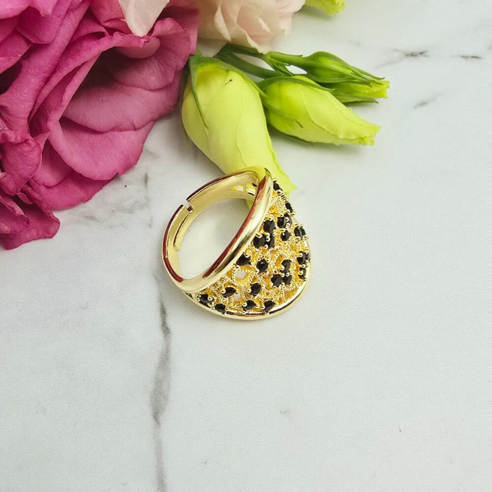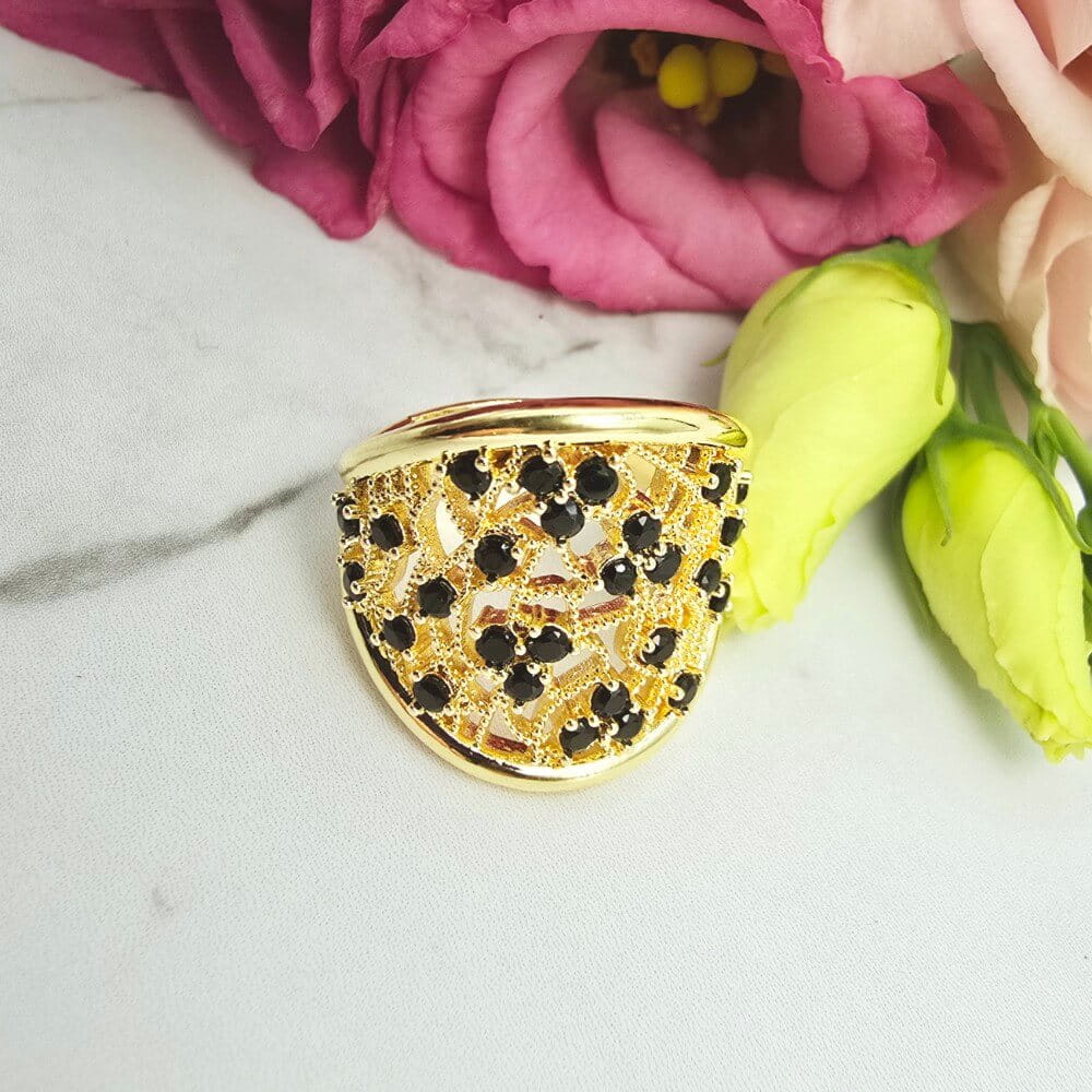 Super popularna obrączka uniwersalna (można dostosować do swojego palca poprzez delikatne dogięcie). Pierścionek w całości wykonany ze stali chirurgicznej. Pierścionek ażurowy i czarne cyrkonie. Pierścionki uniwersalne dzięki temu że można je dostosować do każdego palca. Jaśniejszy odcień złota.