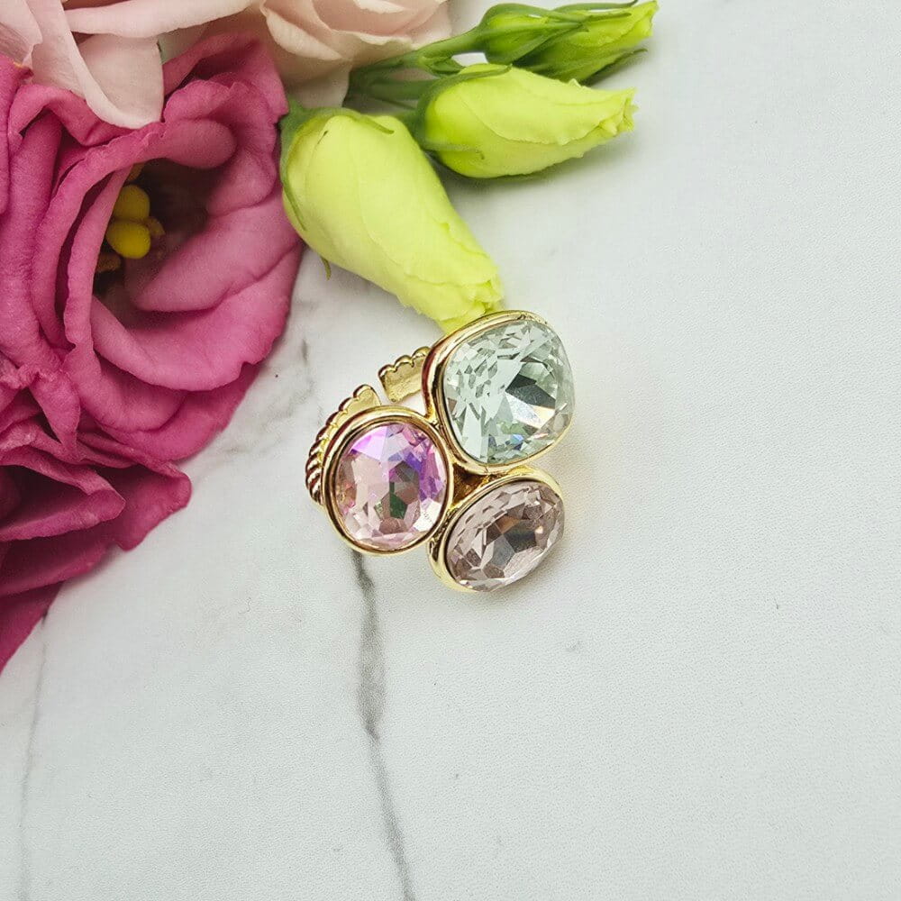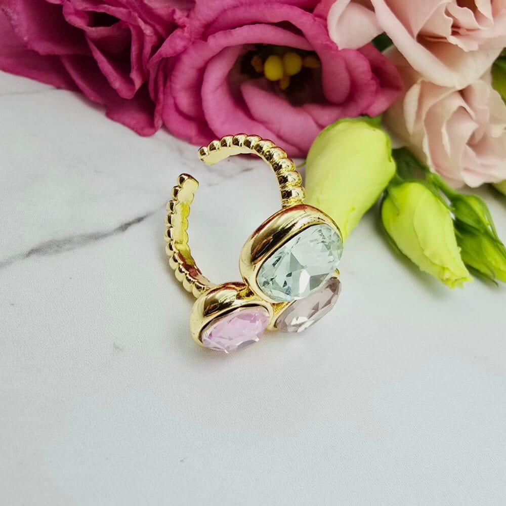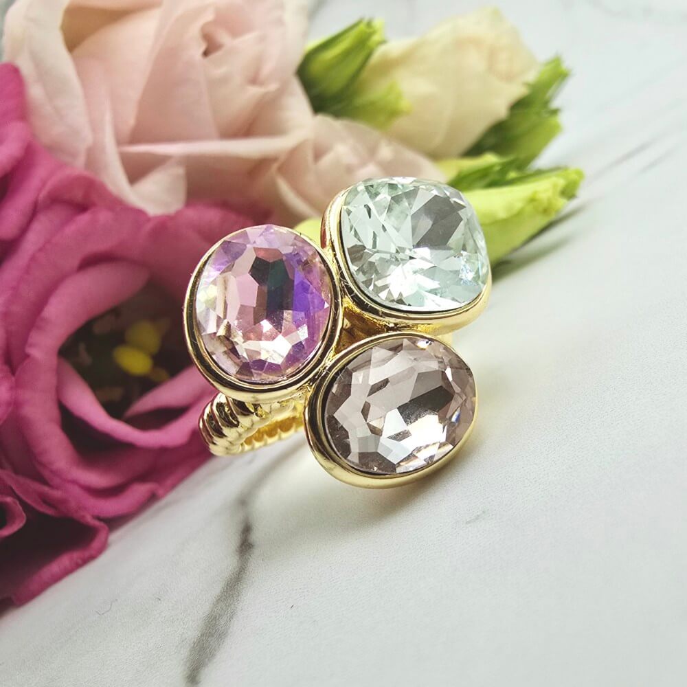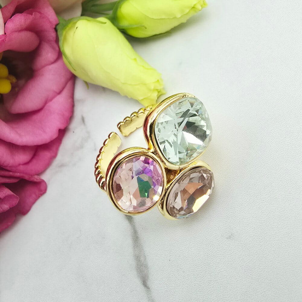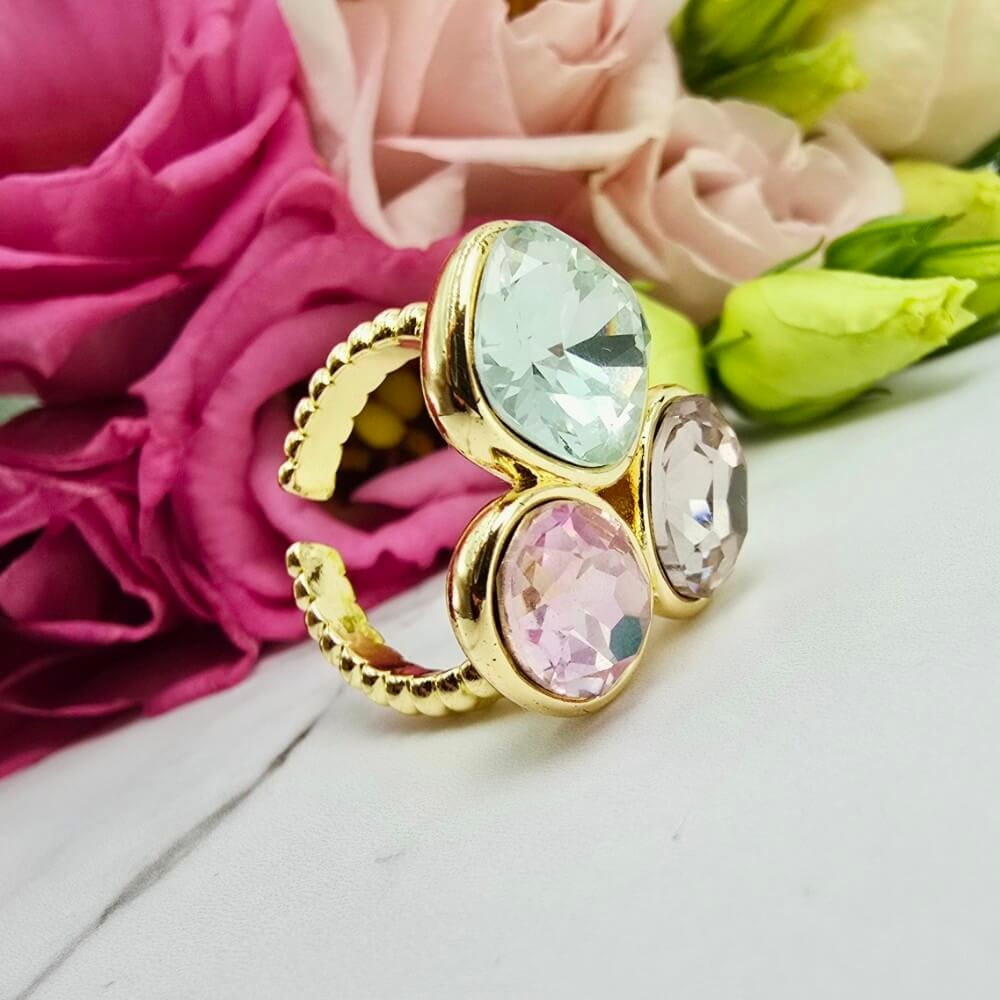 Super popularna obrączka uniwersalna (można dostosować do swojego palca poprzez delikatne dogięcie). Pierścionek w całości wykonany ze stali chirurgicznej. Pierścionek trzy szlifowane kolorowe kryształki. Pierścionki uniwersalne dzięki temu że można je dostosować do każdego palca będą hitem także tego sezonu!!